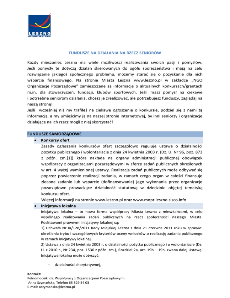 FUNDUSZE NA DZIAŁANIA NA RZECZ SENIORÓW Każdy mieszaniec Leszna ma wiele możliwości realizowania swoich pasji i pomysłów. Jeśli pomysły te dotyczą działań skierowanych do ogółu społeczeństwa i mają na celu rozwiązanie jakiegoś społecznego problemu, możemy starać się o pozyskanie dla nich wsparcia finansowego. Na stronie Miasta Leszna www.leszno.pl w zakładce „NGO Organizacje Pozarządowe” zamieszczane są informacje o aktualnych konkursach/grantach m.in. dla stowarzyszeń, fundacji, klubów sportowych. Jeśli masz pomysł na ciekawe i potrzebne seniorom działania, chcesz je zrealizować, ale potrzebujesz funduszy, zaglądaj na naszą stronę! Jeśli wcześniej niż my trafiłeś na ciekawe ogłoszenie o konkursie, podziel się z nami tą informacją, a my umieścimy ją na naszej stronie internetowej, by inni seniorzy i organizacje działające na ich rzecz mogli z niej skorzystać! FUNDUSZE SAMORZĄDOWE Konkursy ofert Zasady ogłaszania konkursów ofert szczegółowo reguluje ustawa o działalności pożytku publicznego i wolontariacie z dnia 24 kwietnia 2003 r. (Dz. U. Nr 96, poz. 873 z późn. zm.[1]) która nakłada na organy administracji publicznej obowiązek współpracy z organizacjami pozarządowymi w sferze zadań publicznych określonych w art. 4 wyżej wymienionej ustawy. Realizacja zadań publicznych może odbywać się poprzez powierzenie realizacji zadania, w ramach czego organ w całości finansuje zlecone zadanie lub wsparcie (dofinansowanie) jego wykonania przez organizacje pozarządowe prowadzące działalność statutową w dziedzinie objętej tematyką konkursu ofert. Więcej informacji na stronie www.leszno.pl oraz www.mopr.leszno.sisco.info Inicjatywa lokalna Inicjatywa lokalna – to nowa forma współpracy Miasta Leszna z mieszkańcami, w celu wspólnego realizowania zadań publicznych na rzecz społeczności naszego Miasta. Podstawami prawnymi inicjatywy lokalnej są: 1) Uchwała Nr IX/128/2011 Rady Miejskiej Leszna z dnia 21 czerwca 2011 roku w sprawie: określenia trybu i szczegółowych kryteriów oceny wniosków o realizację zadania publicznego w ramach inicjatywy lokalnej. 2) Ustawa z dnia 24 kwietnia 2003 r. o działalności pożytku publicznego i o wolontariacie (Dz. U. z 2010 r., Nr 234, poz. 1536 z późn. zm.), Rozdział 2a, art. 19b – 19h, zwana dalej Ustawą. Inicjatywa lokalna może dotyczyć: działalności charytatywnej, Kontakt: Pełnomocnik ds. Współpracy z Organizacjami Pozarządowymi: Anna Szymańska, Telefon 65 529 54 03 E-mail: [email protected] podtrzymywania i upowszechniania tradycji narodowej, pielęgnowania polskości oraz rozwoju świadomości narodowej, obywatelskiej i kulturowej, działalności na rzecz mniejszości narodowych i etnicznych oraz języka regionalnego, kultury, sztuki, ochrony dóbr kultury i dziedzictwa narodowego, promocji i organizacji wolontariatu, edukacji, oświaty i wychowania, działalności w sferze kultury fizycznej i turystyki (wspierania i upowszechnianie kultury fizycznej i sportu, turystyki i krajoznawstwa), ochrony przyrody , w tym zieleni miejskiej (ekologii i ochrony zwierząt oraz ochrony dziedzictwa przyrodniczego), porządku i bezpieczeństwa publicznego. Kto może składać wnioski? Z wnioskiem mogą wystąpić mieszkańcy miasta Leszna bezpośrednio, mieszkańcy miasta Leszna za pośrednictwem organizacji pozarządowych mających siedzibę na terenie miasta Leszna oraz podmioty wymienione w art.3 ust.3 ustawy. Więcej informacji na stronie www.leszno.pl FUNDUSZE RZĄDOWE: Program ASOS (http://www.mpips.gov.pl/seniorzyaktywne-starzenie/rzadowyprogram-asos/) Program FIO (http://www.pozytek.gov.pl/FIO,379.html) Rządowy Program na rzecz Aktywności Społecznej Osób Starszych na lata 2014-2020 uwzględnia wewnętrzne zróżnicowanie populacji osób starszych i promuje działania mające na celu podtrzymanie aktywności osób starszych i zapewnienie ich udziału w życiu społecznym oraz działania ukierunkowane na osoby o ograniczonej samodzielności. Celem Programu jest poprawa jakości i poziomu życia osób starszych dla godnego starzenia się poprzez aktywność społeczną. Program ma przyczyniać się do pełniejszego korzystania z potencjału społeczno-zawodowego osób starszych, aby mogły one pełnić różne role społeczne w życiu publicznym. Ważne jest również uwzględnienie w działaniach ograniczeń wynikających z barier funkcjonalnych, na które narażone mogą być osoby starsze. Cel główny Programu będzie realizowany przez cele szczegółowe: Cel szczegółowy 1 – Zwiększenie różnorodności i poprawa jakości oferty edukacyjnej dla osób starszych: tworzenie ofert odpowiadających problemom osób starszych znajdujących się w trudnej sytuacji, w tym w szczególności w procesie wykluczenia społecznego, Kontakt: Pełnomocnik ds. Współpracy z Organizacjami Pozarządowymi: Anna Szymańska, Telefon 65 529 54 03 E-mail: [email protected] promowanie nowych rozwiązań na rzecz motywowania osób starszych do uczenia się dla zachowania aktywności, w tym szczególnie osób starszych pozostających w niekorzystnej sytuacji, tworzenie specjalnej oferty dydaktycznej oraz nowych form inicjatyw edukacyjnych, odpowiadających na potrzeby osób starszych, w tym szczególności w procesie wykluczenia społecznego. rozwój oferty edukacyjno-kulturalnej. Cel szczegółowy 2 – Tworzenie warunków dla integracji wewnątrz- i międzypokoleniowej osób starszych przy wykorzystaniu istniejącej infrastruktury społecznej, m.in. pogłębianie wiedzy na temat zmian biologicznych, zdrowotnych, społecznych zachodzących wraz z wiekiem w ramach przygotowywania społeczeństwa do starości. Cel szczegółowy 3 – Rozwój zróżnicowanych form aktywności społecznej, w tym upowszechnianie wolontariatu, partycypacji w procesach decyzyjnych, w życiu społecznym, w tym udział osób starszych w kształtowaniu polityk i publicznej. Cel szczegółowy 4 – Zwi