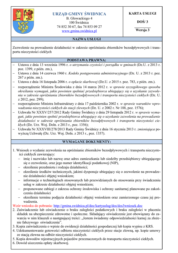 URZĄD GMINY ŚWIDNICA KARTA USŁUGI B. Głowackiego 4 100 Świdnica 74 852 30 67, fax 74 853 09 27 www.gmina.swidnica.pl DOŚ/ 3 _________ Wersja 3 NAZWA USŁUGI Zezwolenie na prowadzenie działalności w zakresie opróżniania zbiorników bezodpływowych i transportu nieczystości ciekłych PODSTAWA PRAWNA: Ustawa z dnia 13 września 1996 r. o utrzymaniu czystości i porządku w gminach (Dz.U. z 2013 r. poz. 1399, z późn. zm.), Ustawa z dnia 14 czerwca 1960 r. Kodeks postępowania administracyjnego (Dz. U. z 2013 r. poz. 267 z późn. zm.). Ustawa z dnia 16 listopada 2006 r. o opłacie skarbowej (Dz.U. z 2015 r. poz. 783, z późn. zm.). rozporządzenie Ministra Środowiska z dnia 14 marca 2012 r. w sprawie szczegółowego sposobu określania wymagań, jakie powinien spełniać przedsiębiorca ubiegający się o uzyskanie zezwolenia w zakresie opróżniania zbiorników bezodpływowych i transportu nieczystości ciekłych (Dz. U. z 2012, poz. 299); rozporządzenie Ministra Infrastruktury z dnia 17 października 2002 r. w sprawie warunków wprowadzania nieczystości ciekłych do stacji zlewnych (Dz. U. z 2002 r. Nr 188, poz. 1576); Uchwała Nr XXXV/257/2012 Rady Gminy Świdnicy z dnia 29 listopada 2012 r. w sprawie wymagań, jakie powinien spełnić przedsiębiorca ubiegający się o uzyskanie zezwolenia na prowadzenie działalności w zakresie opróżniania zbiorników bezodpływowych i transportu nieczystości ciekłych (Dz. Urz. Woj. Doln. z 2013 r., poz. 1356); Uchwała Nr XXXVIII/278/2013 Rady Gminy Świdnicy z dnia 16 stycznia 2013 r. zmieniająca powyższą Uchwałę (Dz. Urz. Woj. Doln. z 2013 r., poz. 1357). WYMAGANE DOKUMENTY: 1. Wniosek o wydanie zezwolenia na opróżnianie zbiorników bezodpływowych i transportu nieczystości ciekłych zawierający: imię i nazwisko lub nazwę oraz adres zamieszkania lub siedziby przedsiębiorcy ubiegającego się o zezwolenie, oraz jego numer identyfikacji podatkowej (NIP), określenie przedmiotu i rodzaju działalności; określenie środków technicznych, jakimi dysponuje ubiegający się o zezwolenie na prowadzenie działalności objętej wnioskiem; informacje o technologiach stosowanych lub przewidzianych do stosowania przy świadczeniu usług w zakresie działalności objętej wnioskiem; proponowane zabiegi z zakresu ochrony środowiska i ochrony sanitarnej planowane po zakończeniu działalności określenie terminu podjęcia działalności objętej wnioskiem oraz zamierzonego czasu jej prowadzenia. Wzór wniosku do pobrania: http://gmina.swidnica.pl/doc/kartyuslug/dos/dos3wniosek.doc 2. Zaświadczenie lub oświadczenie o braku zaległości podatkowych i braku zaległości w płaceniu składek na ubezpieczenie zdrowotne i społeczne. Składający oświadczenie jest obowiązany do zawarcia w nim klauzuli o następującej treści: „Jestem świadomy odpowiedzialności karnej za złożenie fałszywego oświadczenia”. 3. Kopia zaświadczenia o wpisie do ewidencji działalności gospodarczej lub kopia wypisu z KRS. 4. Udokumentowanie gotowości odbioru nieczystości ciekłych przez stacje zlewną, np. kopie umowy ze stacją zlewna na odbiór nieczystości ciekłych. 5. Kopia dowodów rejestracyjnych pojazdów przeznaczonych do transportu nieczystości ciekłych. 6. Dowód uiszczenia opłaty skarbowej. OPŁATY: Opłata skarbowa: 107,00 zł za wydanie zezwolenia, 53,50 zł za przedłużenie terminu ważności lub zmianę warunków wydanego zezwolenia, jeżeli dotyczy przedłużenia terminu ważności lub rozszerzenia zakresu działalności, 17 zł – za złożenie dokumentu stwierdzającego udzielenie pełnomocnictwa lub prokury oraz jego odpis, wypis lub kopia – od każdego stosunku pełnomocnictwa (prokury), 24 zł – za wydanie duplikatu zezwolenia. Wpłaty z tytułu opłaty skarbowej można dokonywać w kasie Urzędu lub na rachunek bankowy Urzędu Gminy Świdnica: Bank Spółdzielczy w Kobierzycach filia w Świdnicy nr konta: 76 9575 0004 0000 1446 2000 0010 Obowiązek opłaty powstaje z chwilą złożenia wniosku TERMIN ZAŁATWIENIA SPRAWY: Wydanie decyzji następuje niezwłocznie, najpóźniej w terminie miesiąca od daty wpływu wniosku, a w przypadku spraw szczególnie skomplikowanych do dwóch miesięcy. MIEJSCE ZŁOŻENIA WNIOSKU: Urząd Gminy Świdnica ul. Głowackiego 4 58 – 100 Świdnica parter, sala obsługi klienta – stanowisko nr 100. MIEJSCE ZAŁATWIENIA SPRAWY: Urząd Gminy Świdnica Dział Ochrony Środowiska tel. 74 852 30 67 wew. 310. TRYB ODWOŁAWCZY/SKARGOWY: Od decyzji przysługuje stronie prawo wniesienia odwołania do Samorządowego Kolegium Odwoławczego w Wałbrzychu, w terminie 14 dni od daty jej doręczenia. Odwołanie należy złożyć za pośrednictwem Wójta Gminy Świdnica. UWAGI: 1. Organ administracji publicznej, przed wydaniem zezwolenia może: wezwać przedsiębiorcę do uzupełnienia brakującej dokumentacji poświadczającej spełnienia on warunki określone przepisami prawa, wymagane do wykonywania działalności objętej zezwoleniem, w wyznaczonym terminie, jednak nie krótszym niż 14 dni; dokonać kontrolnego sprawdzenia faktów podanych we wniosku o udzielenie zezwolenia w celu stwierdzenia, czy przedsiębiorca spełnia warunki wykonania działalności objętej zezwoleniem. 2. Przedsiębiorca jest obowiązany niezwłocznie zgłosić Wójtowi Gminy Świdnica wszelkie zmiany danych określonych w zezwoleniu. 3. Wójt odmówi wydania zezwolenia, jeżeli sposób gospodarowania nieczystościami ciekłymi: jest niezgodny z przepisami prawa, mógłby powodować zagrożenie dla życia lub zdrowia ludzi lub środowiska, przedsiębiorca ma zaległości podatkowe lub w płaceniu składek na ubezpieczenie zdrowotne. 3. Odmowa wydania zezwolenia, jego zmiany i cofnięcia następuje w drodze decyzji wójta. 4. Zezwolenie wydaje się na czas oznaczony, nie dłuższy niż 10 lat.
