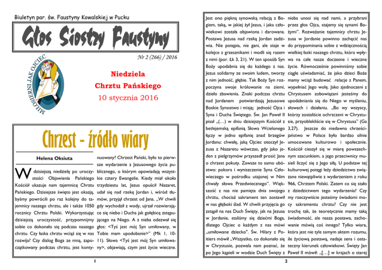 Biuletyn par. św. Faustyny Kowalskiej w Pucku Głos Siostry Faustyny Nr 2 (266) / 2016 Niedziela Chrztu Pańskiego 10 stycznia 2016 Chrzest - źródło wiary Helena Oksiuta W dzisiejszą niedzielę po uroczystości Objawienia Pańskiego Kościół ukazuje nam tajemnicę Chrztu Pańskiego. Dzisiejsze święto jest okazją, byśmy powrócili po raz kolejny do tajemnicy naszego chrztu, ale i także 1050 rocznicy Chrztu Polski. Wykorzystując dzisiejszą uroczystość, przypomnijmy sobie co dokonało się podczas naszego chrztu. Czy łaska chrztu wciąż się w nas rozwija? Czy dialog Boga ze mną, zapoczątkowany podczas chrztu, jest konty1 nuowany? Chrzest Pański, było to pierwsze wydarzenie z Jezusowego życia publicznego, o którym opowiadają wszystkie cztery Ewangelie. Kiedy miał około trzydziestu lat, Jezus opuścił Nazaret, udał się nad rzekę Jordan i, wśród tłumów, przyjął chrzest od Jana. „W chwili gdy wychodził z wody, ujrzał rozwierające się niebo i Ducha jak gołębicę zstępującego na Niego. A z nieba odezwał się głos: <Tyś jest mój Syn umiłowany, w Tobie mam upodobanie>” (Mk 1, 1011). Słowa <Tyś jest mój Syn umiłowany>, objawiają, czym jest życie wieczne. Jest ono piękną synowską relacją z Bogiem, taką, w jakiej żył Jezus, i jaka człowiekowi została objawiona i darowana. Postawa Jezusa nad rzeką Jordan zadziwia. Nie potępia, nie gani, ale staje w kolejce z grzesznikami i modli się razem z nimi (por. Łk 3, 21). W ten sposób Syn Boży upodabnia się do każdego z nas. Jezus solidarny ze swoim ludem, tworzy z nim jedność, głębie. Tak Boży Syn rozpoczyna swoje królowanie na ziemi, dzieło zbawienia. Znaki podczas chrztu nad Jordanem potwierdzają Jezusowe Boskie Synostwo i misję; jedność Ojca i Syna i Ducha Świętego. Św. Jan Paweł II pisał „(…) w dniu dzisiejszym Kościół z betlejemską epifanią Słowa Wcielonego łączy w jedno epifanię znad brzegów Jordanu: chwałę, jaką Ojciec otoczył Jezusa z Nazaretu wówczas, gdy jako jeden z pielgrzymów przyszedł prosić Jana o chrzest pokuty. Zawsze to samo ubóstwo: pokora i wyniszczenie Syna Człowieczego w pośrodku utajonej w Nim chwały słowa Przedwiecznego”. Większość z nas nie pamięta dnia swojego chrztu, chociaż sakrament ten zostawił w nas głęboki ślad. W chwili przyjęcia go zstąpił na nas Duch Święty, jak na Jezusa w Jordanie, staliśmy się dziećmi Boga, dlatego Ojciec o każdym z nas mówi „umiłowane dziecko". Św. Hilary z Poitiers mówił „Wszystko, co dokonało się w Chrystusie, pozwala nam poznać, że po Jego kąpieli w wodzie Duch Święty z nieba unosi się nad nami, a przybrani przez głos Ojca, stajemy się synami Bożymi”. Rozważanie tajemnicy chrztu Jezusa w Jordanie powinno zachęcić nas do przypominania sobie z wdzięcznością wielkiej łaski naszego chrztu, która wpływa na całe nasze doczesne i wieczne życie. Równocześnie powinniśmy sobie ciągle uświadamiać, że jako dzieci Boże mamy wciąż budować relacje z Panem, wypełniać Jego wolę. Jako zjednoczeni z Chrystusem zobowiązani jesteśmy do upodabniania się do Niego w myśleniu, słowach i działaniu. „Bo wy wszyscy, którzy zostaliście ochrzczeni w Chrystusie, przyoblekliście się w Chrystusa” (Ga 3,27). Jeszcze do niedawna chrześcijaństwo w Polsce było bardzo silnie umocowane kulturowo i społecznie. Kościół cieszył się w miarę powszechnym szacunkiem, a jego przeciwnicy musieli liczyć się z Jego siłą. U podstaw tej kulturowej potęgi leży dziedzictwo związane niewątpliwie z wydarzeniem z roku 966, Chrztem Polski. Zatem co się stało z dziedzictwem tego wydarzenia? Czy my rzeczywiście jesteśmy świadomi mocy sakramentu chrztu? Czy nie jest trochę tak, że teoretycznie mamy taką świadomość, ale nasza postawa, zachowanie mówią coś innego? Tylko wiara, która jest nie tyle samym aktem rozumu, ile życiową postawą, nadaje sens i ostateczny kierunek człowiekowi. Święty Jan Paweł II mówił: „[…] w krajach o starej 2 tradycji chrześcijańskiej dostrzegamy wyczerpanie naszego wewnętrznego chrześcijaństwa, tego, co powinno stanowić owoc naszego chrztu.(…) Całe grupy ochrzczonych utraciły żywy sens wiary albo wprost nie uważają się już za członków Kościoła, prowadzą życie dalekie od Chrystusa i Jego Ewangelii ”. Dziś panuje dość powszechne przekonanie, że chrześcijaństwo praktykuje się w Kościele, a osobiste życie codzienne może być odległe od sfery sacrum i może biec własnym, „świeckim” nurtem. Bzdura! Kryzys więzi rodzinnych, indywidualizm, materializm, hedonizm i konsumpcyjny styl życia, sprawiają, że dobra prawdziwie duchowe wydają się coraz mniej atrakcyjne. Prowadzi to w konsekwencji do kryzysu wiary, do letniości i powierzchowności wiary, do „gry pozorów”. Potrzebujemy nieustannie kontemplować i urzeczywistniać tajemnicę sakramentu chrztu. To, co jest na zewnątrz, w naszej postawie, działaniu, objawia to, co jest w środku, w nas. Aby być prawdziwym chrześcijaninem, nie wystarczy wierzyć w Boga Ojca, nie wystarczy wierzyć w Bóstwo i Człowieczeństwo Jezusa Chrystusa i nie wystarczy wierzyć w istnienie Ducha Świętego. Prawdziwy chrześcija- nin to człowiek, który uwierzył, że jest dzieckiem Boga, odkrył swoją godność, spojrzał na siebie w świetle prawdy, którą Bóg objawia właśnie w sakramencie chrztu. Wraz ze świadomością godności dziecka Bożego pojawia się potężna moc, która pozwala działać i przeciwstawić się grzechowi. W człowieku ochrzczonym powinno być tak duże wyczucie piękna i dobra Bożego świata, że nie sięgnie po pseudo wartości, które by tą rzeczywistość pomniejszyły czy niszczyły. Człowiek, który przeżywa świadomie swoją godność dziecka Bożego, potrafi podjąć każde powołanie, nawet najtrudniejsze, cierpienie. Sakrament chrztu, to nie tylko przywilej, ale nade wszystko z