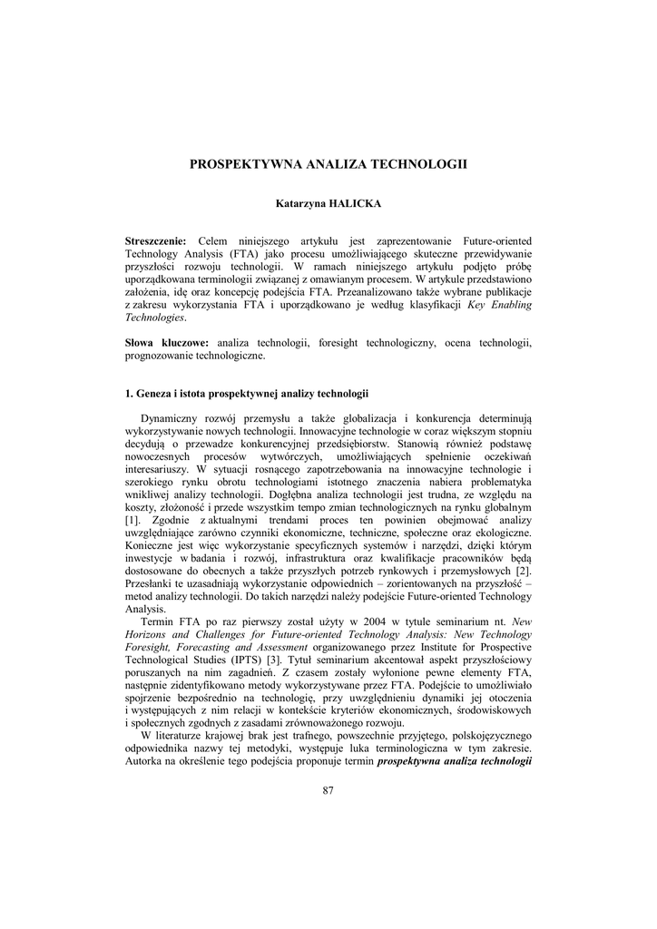 PROSPEKTYWNA ANALIZA TECHNOLOGII Katarzyna HALICKA Streszczenie: Celem niniejszego artykułu jest zaprezentowanie Future-oriented Technology Analysis (FTA) jako procesu umożliwiającego skuteczne przewidywanie przyszłości rozwoju technologii. W ramach niniejszego artykułu podjęto próbę uporządkowana terminologii związanej z omawianym procesem. W artykule przedstawiono założenia, idę oraz koncepcję podejścia FTA. Przeanalizowano także wybrane publikacje z zakresu wykorzystania FTA i uporządkowano je według klasyfikacji Key Enabling Technologies. Słowa kluczowe: analiza technologii, foresight technologiczny, ocena technologii, prognozowanie technologiczne. 1. Geneza i istota prospektywnej analizy technologii Dynamiczny rozwój przemysłu a także globalizacja i konkurencja determinują wykorzystywanie nowych technologii. Innowacyjne technologie w coraz większym stopniu decydują o przewadze konkurencyjnej przedsiębiorstw. Stanowią również podstawę nowoczesnych procesów wytwórczych, umożliwiających spełnienie oczekiwań interesariuszy. W sytuacji rosnącego zapotrzebowania na innowacyjne technologie i szerokiego rynku obrotu technologiami istotnego znaczenia nabiera problematyka wnikliwej analizy technologii. Dogłębna analiza technologii jest trudna, ze względu na koszty, złożoność i przede wszystkim tempo zmian technologicznych na rynku globalnym [1]. Zgodnie z aktualnymi trendami proces ten powinien obejmować analizy uwzględniające zarówno czynniki ekonomiczne, techniczne, społeczne oraz ekologiczne. Konieczne jest więc wykorzystanie specyficznych systemów i narzędzi, dzięki którym inwestycje w badania i rozwój, infrastruktura oraz kwalifikacje pracowników będą dostosowane do obecnych a także przyszłych potrzeb rynkowych i przemysłowych [2]. Przesłanki te uzasadniają wykorzystanie odpowiednich – zorientowanych na przyszłość – metod analizy technologii. Do takich narzędzi należy podejście Future-oriented Technology Analysis. Termin FTA po raz pierwszy został użyty w 2004 w tytule seminarium nt. New Horizons and Challenges for Future-oriented Technology Analysis: New Technology Foresight, Forecasting and Assessment organizowanego przez Institute for Prospective Technological Studies (IPTS) [3]. Tytuł seminarium akcentował aspekt przyszłościowy poruszanych na nim zagadnień. Z czasem zostały wyłonione pewne elementy FTA, następnie zidentyfikowano metody wykorzystywane przez FTA. Podejście to umożliwiało spojrzenie bezpośrednio na technologię, przy uwzględnieniu dynamiki jej otoczenia i występujących z nim relacji w kontekście kryteriów ekonomicznych, środowiskowych i społecznych zgodnych z zasadami zrównoważonego rozwoju. W literaturze krajowej brak jest trafnego, powszechnie przyjętego, polskojęzycznego odpowiednika nazwy tej metodyki, występuje luka terminologiczna w tym zakresie. Autorka na określenie tego podejścia proponuje termin prospektywna analiza technologii 87 (PAT). Pojęcie to oddaje w sposób logiczny i prosty charakter oraz oczekiwany efekt tej metodyki. Zdaniem autorki prospektywna analiza technologii jest procesem, którego głównym celem jest przewidywanie przyszłości technologii poprzez ocenę oraz szczegółową analizę (skanowanie) jej obecnego stanu a także identyfikację strategicznych czynników, obszarów, aspektów nauki i technologii wpływających na jej rozwój. Na podstawie przeglądu literatury można wymienić następujące atrybuty prospektywnej analizy technologii (rysunek 1) [3]: dalekosiężne spojrzenie będące pożądanym stanem przyszłości opartym na racjonalnych przesłankach z teraźniejszości; partycypacyjność polegająca na udziale szerokiego grona różnorodnych uczestników (tzw. interesariuszy) w procesie rozważań, analizy i syntezy; udowadnianie (empiria) sprowadzające się do rzetelnej opinii i interpretacji analizowanych technologii, jak i zjawisk oraz czynników wpływających na ich rozwój; wielodyscyplinarność polegająca na łączeniu różnych dyscyplin, narzędzi podczas prowadzonych analiz i tym samym umożliwiająca zrozumienie istniejących relacji; koordynacja sprowadzająca się do powiązania kompetencji, możliwości, infrastruktury i zasobów; działanie koncentrujące się na mobilizowaniu do konkretnych czynności na rzecz pożądanej przyszłości. dalekosiężne spojrzenie działanie partycypacyjność prospektywna analiza technologii koordynacja udowadnianie wielodyscyplinarność Rys. 1. Cechy prospektywnej analizy technologii [opracowanie własne na podstawie 3] PAT jest to proces składający się ze zbioru metod pozwalających na szczegółową charakterystykę oraz systematyczną analizę technologii a także identyfikowanie 88 i prezentowanie ścieżek ich rozwoju. Prospektywna analiza technologii jest szczególnie przydana gdy technologie są kosztowne ale i istotne dla rozwoju danego kraju, regionu czy też przedsiębiorstwa [4]. Podejście to łączy prognozowanie technologiczne (technology forecasting – TF), ocenę technologii (technology assessment – TA) z foresightem technologicznym (technology foresight) (rysunek 2). stan obecny Perspektywa czasowa krótkookresowa długoterminowa Rys. 2. Struktura prospektywnej analizy technologii (PAT) [opracowanie własne na podstawie 17, 20] Prognozowanie technologiczne należy do jednej z pierwszych koncepcji związanych z wyłonieniem wartościowych i obiecujących technologii. Jest to pewnego rodzaj przewidywania rozwoju technologii, pozwalające na badanie zmian technologii, przedstawienie ścieżki jej rozwoju czy też możliwości funkcjonalnych. Prognozowanie technologiczne przed wszystkim bazuje na informacjach z przeszłości i zazwyczaj dotyczy bliskiej przyszłości (horyzont czasowy – do kilku lat) [5, 6, 7, 8]. Z kolei, ujednolicając dostępne w literaturze definicje, ocenę technologii można określić, jako pomiar konkretnych technologii i ich s