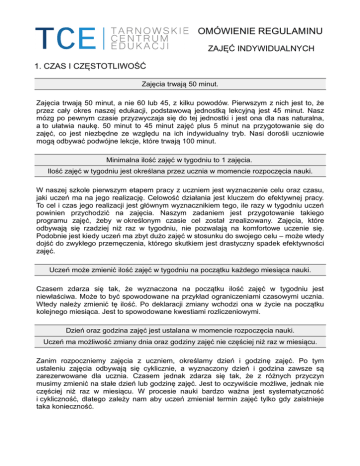 1. CZAS I CZĘSTOTLIWOŚĆ Zajęcia trwają 50 minut. Zajęcia trwają 50 minut, a nie 60 lub 45, z kilku powodów. Pierwszym z nich jest to, że przez cały okres naszej edukacji, podstawową jednostką lekcyjną jest 45 minut. Nasz mózg po pewnym czasie przyzwyczaja się do tej jednostki i jest ona dla nas naturalna, a to ułatwia naukę. 50 minut to 45 minut zajęć plus 5 minut na przygotowanie się do zajęć, co jest niezbędne ze względu na ich indywidualny tryb. Nasi dorośli uczniowie mogą odbywać podwójne lekcje, które trwają 100 minut. Minimalna ilość zajęć w tygodniu to 1 zajęcia. Ilość zajęć w tygodniu jest określana przez ucznia w momencie rozpoczęcia nauki. W naszej szkole pierwszym etapem pracy z uczniem jest wyznaczenie celu oraz czasu, jaki uczeń ma na jego realizację. Celowość działania jest kluczem do efektywnej pracy. To cel i czas jego realizacji jest głównym wyznacznikiem tego, ile razy w tygodniu uczeń powinien przychodzić na zajęcia. Naszym zadaniem jest przygotowanie takiego programu zajęć, żeby w określonym czasie cel został zrealizowany. Zajęcia, które odbywają się rzadziej niż raz w tygodniu, nie pozwalają na komfortowe uczenie się. Podobnie jest kiedy uczeń ma zbyt dużo zajęć w stosunku do swojego celu – może wtedy dojść do zwykłego przemęczenia, którego skutkiem jest drastyczny spadek efektywności zajęć. Uczeń może zmienić ilość zajęć w tygodniu na początku każdego miesiąca nauki. Czasem zdarza się tak, że wyznaczona na początku ilość zajęć w tygodniu jest niewłaściwa. Może to być spowodowane na przykład ograniczeniami czasowymi ucznia. Wtedy należy zmienić tę ilość. Po deklaracji zmiany wchodzi ona w życie na początku kolejnego miesiąca. Jest to spowodowane kwestiami rozliczeniowymi. Dzień oraz godzina zajęć jest ustalana w momencie rozpoczęcia nauki. Uczeń ma możliwość zmiany dnia oraz godziny zajęć nie częściej niż raz w miesiącu. Zanim rozpoczniemy zajęcia z uczniem, określamy dzień i godzinę zajęć. Po tym ustaleniu zajęcia odbywają się cyklicznie, a wyznaczony dzień i godzina zawsze są zarezerwowane dla ucznia. Czasem jednak zdarza się tak, że z różnych przyczyn musimy zmienić na stałe dzień lub godzinę zajęć. Jest to oczywiście możliwe, jednak nie częściej niż raz w miesiącu. W procesie nauki bardzo ważna jest systematyczność i cykliczność, dlatego zależy nam aby uczeń zmieniał termin zajęć tylko gdy zaistnieje taka konieczność. W czasie wakacji oraz ferii zimowych uczniowie również mogą uczęszczać na zajęcia, jednak nie jest to obowiązkowe. W dni ustawowo wolne od pracy zajęcia nie odbywają się i nie trzeba ich odrabiać. Czas wakacji oraz ferii zimowych to czas odpoczynku. Należy jednak pamiętać o tym, że czasem już dwa tygodnie przerwy w zajęciach wpływają negatywnie na cały proces uczenia się. Dlatego bardzo zachęcamy do uczęszczania na zajęcia dzieci w czasie wolnym od zajęć szkolnych – jedna godzina w tygodniu nie zaburzy ich odpoczynku, a pozwoli na utrwalenie tego, co zostało wypracowane w roku szkolnym. Również zachęcamy naszych dorosłych uczniów, aby w okresie urlopowym nie zawieszali swoich zajęć ponieważ później ciężko jest znowu wejść w tryb intensywnej pracy. A przecież wszystkim nam zależy na tym, aby Państwo zrealizowali z nami swój cel. W wyznaczone dni wolne od nauki szkolnej uczniowie mogą uczęszczać na zajęcia, jednak nie jest to obowiązkowe. Kalendarz z tymi dniami znajduje się na naszej stronie tce.edu.pl. W ciągu roku szkolnego jest wiele dni, które są zaliczane do normalnych dni roboczych, ale są wolne od nauki szkolnej. Do naszej szkoły uczęszczają zarówno dorośli jak i dzieci, w związku z tym postanowiliśmy aby wszyscy nasi uczniowie mogli zdecydować, czy w te dni wolne od nauki szkolnej chcą mieć zajęcia, czy nie. Na naszej stronie dostępny jest kalendarz z tymi dniami. My oczywiście zachęcamy do zachowania ciągłości zajęć. Uczeń, oprócz ustalonych lekcji, ma możliwość korzystania z lekcji dodatkowych, na które umawia się z nauczycielem. Lekcje te są doliczane do faktury za kolejny miesiąc. Szanowni Państwo, opcja lekcji dodatkowych jest rozwiązaniem dla osób aktywnych zawodowo i życiowo. Mamy świadomość, że część z Państwa może mieć trudności z cyklicznym uczęszczaniem na zajęcia na przykład trzy razy w tygodniu. Takie osoby mogą mieć standardowo 2 lekcje w tygodniu o wyznaczonych i niezmiennych porach, a na tę trzecią lekcję mogą umawiać się z nauczycielem kiedy mają czas i są dyspozycyjni. Lekcje dodatkowe to również ciekawa propozycja dla uczniów szkolnych. Należy pamiętać, że opłatę za lekcje dodatkowe doliczamy do kolejnej faktury. 2. OPŁATY Cena zajęć jest określona w Cenniku oraz w Umowie. Miesięczny koszt zajęć to suma opłat za wszystkie zajęcia w danym miesiącu oraz zajęcia dodatkowe, które odbyły się w poprzednim miesiącu. Cena zajęć jest określona w Cenniku i jest zależna od tego, czy osoba, która podejmuje u nas naukę, jest pracownikiem firmy lub uczniem szkoły, z którą współpracujemy. Więcej informacji na ten temat znajdziecie Państwo na stronie internetowej w zakładce program partnerstwa. W naszej szkole nie ma stałych miesięcznych opłat; cena jednego miesiąca zajęć zależy od tego, ile w tym miesiącu ma się odbyć zajęć. PRZYŁAD: Uczeń uczęszcza na zajęcia z języka angielskiego oraz z gry na fortepianie. Zajęcia z języka ma w poniedziałki, a z instrumentu w piątki. We wrześniu 2016 roku są 4 poniedziałki i 5 piątków. Faktura dla tego ucznia wyniesie: 4 razy 40 zł = 160 zł (za zajęcia z języka angielskiego) oraz 5 razy 40 zł = 200 zł (za zajęcia z gry na fortepianie), razem 360 zł. Faktura za zajęcia wystawiana jest na początku miesiąca za cały miesiąc z góry. Termin płatności oraz dane d