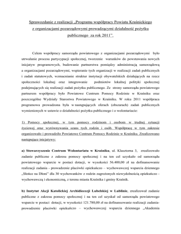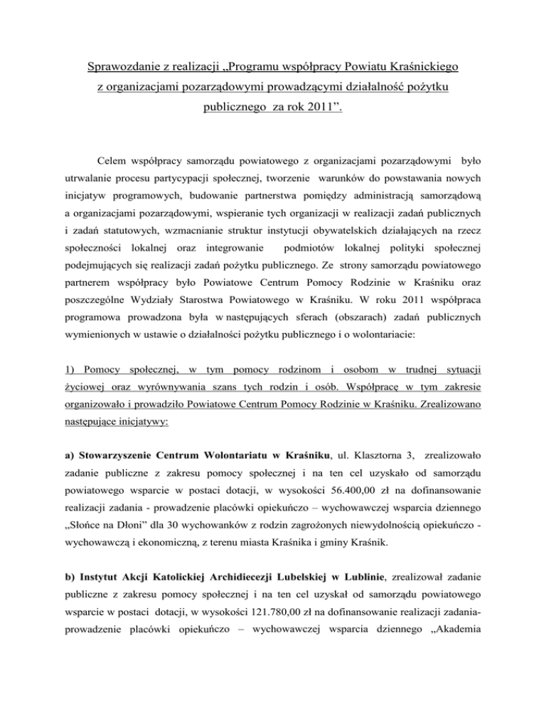 Sprawozdanie z realizacji „Programu współpracy Powiatu Kraśnickiego z organizacjami pozarządowymi prowadzącymi działalność poŜytku publicznego za rok 2011”. Celem współpracy samorządu powiatowego z organizacjami pozarządowymi było utrwalanie procesu partycypacji społecznej, tworzenie warunków do powstawania nowych inicjatyw programowych, budowanie partnerstwa pomiędzy administracją samorządową a organizacjami pozarządowymi, wspieranie tych organizacji w realizacji zadań publicznych i zadań statutowych, wzmacnianie struktur instytucji obywatelskich działających na rzecz społeczności lokalnej oraz integrowanie podmiotów lokalnej polityki społecznej podejmujących się realizacji zadań poŜytku publicznego. Ze strony samorządu powiatowego partnerem współpracy było Powiatowe Centrum Pomocy Rodzinie w Kraśniku oraz poszczególne Wydziały Starostwa Powiatowego w Kraśniku. W roku 2011 współpraca programowa prowadzona była w następujących sferach (obszarach) zadań publicznych wymienionych w ustawie o działalności poŜytku publicznego i o wolontariacie: 1) Pomocy społecznej, w tym pomocy rodzinom i osobom w trudnej sytuacji Ŝyciowej oraz wyrównywania szans tych rodzin i osób. Współpracę w tym zakresie organizowało i prowadziło Powiatowe Centrum Pomocy Rodzinie w Kraśniku. Zrealizowano następujące inicjatywy: a) Stowarzyszenie Centrum Wolontariatu w Kraśniku, ul. Klasztorna 3, zrealizowało zadanie publiczne z zakresu pomocy społecznej i na ten cel uzyskało od samorządu powiatowego wsparcie w postaci dotacji, w wysokości 56.400,00 zł na dofinansowanie realizacji zadania - prowadzenie placówki opiekuńczo – wychowawczej wsparcia dziennego „Słońce na Dłoni” dla 30 wychowanków z rodzin zagroŜonych niewydolnością opiekuńczo wychowawczą i ekonomiczną, z terenu miasta Kraśnika i gminy Kraśnik. b) Instytut Akcji Katolickiej Archidiecezji Lubelskiej w Lublinie, zrealizował zadanie publiczne z zakresu pomocy społecznej i na ten cel uzyskał od samorządu powiatowego wsparcie w postaci dotacji, w wysokości 121.780,00 zł na dofinansowanie realizacji zadaniaprowadzenie placówki opiekuńczo – wychowawczej wsparcia dziennego „Akademia młodzieŜowa” przez Oddział w Kraśniku przy Parafii Św. Józefa Robotnika, ul. Krasińskiego 13. Organizacja prowadziła filie placówki w Kraśniku (dz. fabryczna), StróŜy i w Zakrzówku dla 90 wychowanków z rodzin zagroŜonych niewydolnością opiekuńczo -wychowawczą i ekonomiczną. c) Stowarzyszenie SOS Wioski Dziecięce w Polsce zrealizowało zadanie publiczne z zakresu pomocy społecznej i na ten cel uzyskało od samorządu powiatowego dotację w wysokości 2.167.491,09 złotych na prowadzenie placówki opiekuńczo – wychowawczej typu rodzinnego „Wioska Dziecięca SOS w Kraśniku”. W placówce w roku 2011 przebywało 75 wychowanków. 2) Ochrony i promocji zdrowia. Współpracę w tym zakresie organizował i prowadził Wydział Spraw Społecznych Starostwa Powiatowego. Wydział Spraw Społecznych w 2011 roku współpracował z: - Powiatowym Stowarzyszeniem Diabetyków O/Powiatowy w Kraśniku, - Polskim Związkiem Emerytów, Rencistów i Inwalidów Koło Nr 1 w Kraśniku, - Polskim Związkiem Niewidomych - Okręg lubelski, Koło w Kraśniku, - Polskim Czerwonym KrzyŜem - Zarząd Rejonowy w Kraśniku, - Fundacją „Za Bramą” w Kraśniku, - Fundacją Ronalda Mc Donalda, - Stowarzyszeniem na Rzecz Walki z Rakiem Szyjki Macicy „Kwiat Kobiecości”. Zakres podjętej współpracy w zakresie wsparcia realizacji działań statutowych organizacji i zadań programowych samorządu powiatowego ilustruje zamieszczona tabela nr 1. Tabela nr 1: Ilustracja współpracy z organizacjami pozarządowymi w zakresie ochrony i promocji zdrowia. L.p. Nazwa organizacji Forma wsparcia Przykładowe inicjatywy podjęte przez organizację i samorząd powiatowy 1. Powiatowe Diabetyków Stowarzyszenie O/Powiatowy Wsparcie rzeczowe Spotkanie z okazji Światowego Dnia (wartość 803,00 zł) Walki z Cukrzycą. Wsparcie Spotkanie integracyjne. w Kraśniku. 2. Polski Związek Emerytów, Rencistów i Inwalidów - koło Nr 1 w Kraśniku. rzeczowe (wartość 679,54 zł) 2 3. 4. 5. Polski Związek Niewidomych Okręg lubelski koło w Kraśniku. Polski Czerwony KrzyŜ Wsparcie - Zarząd Rejonowy w Kraśniku. (wartość 3.005,86 zł) PCK. Fundacja Wsparcie Warsztaty psychologiczne w ramach Kraśnickiego Centrum Wsparcia dla osób z chorobami nowotworowymi i ich bliskich. Dwie edycje kampanii społecznej na rzecz postępu w onkologii dziecięcej „NIE nowotworom u dzieci”. Podczas I edycji zostało przebadanych 214 dzieci (104 dziewczynki i 110 chłopców) z terenu naszego powiatu w wieku od 9 miesięcy do 6 lat, zaś podczas II edycji udało się przebadać 202 małych pacjentów (97 dziewczynek i 105 chłopców). W dniu 29 listopada 2011 r. w Centrum Kultury i Promocji w Kraśniku odbyła się kolejna juŜ konferencja poświęcona profilaktyce raka szyjki macicy pod hasłem „Młoda i Zdrowa”. W trakcie spotkania udało się przekazać wiedzę na temat profilaktyki 500 dziewczętom ze szkół gimnazjalnych i ponadgimnazjalnych z terenu powiatu kraśnickiego. „Za Bramą” rzeczowe (wartość 800,00 zł) Białej Laski. Wsparcie Dni rzeczowe rzeczowe w Kraśniku. (wartość 3.200,00 zł) 6. Fundacja Ronalda Mc Donalda. Umowa partnerska 7. Stowarzyszeniem Umowa partnerska na Rzecz Spotkanie z okazji Światowego Dnia Walki z Rakiem Szyjki Macicy „Kwiat Kobiecości”. Honorowego Krwiodawstwa Źródło: materiał Starostwa Powiatowego w Kraśniku. 3) Działalności na rzecz osób niepełnosprawnych. Współpracę w tym zakresie organizowało i prowadziło Powiatowe Centrum Pomocy Rodzinie w Kraśniku. Zrealizowano inicjatywy finansowane ze środków Państwowego Funduszu Rehabilitacji Osób Niepełnosprawnych. Organizacje wspierające osoby niepełnosprawne korzystały z pomocy określonej w usta