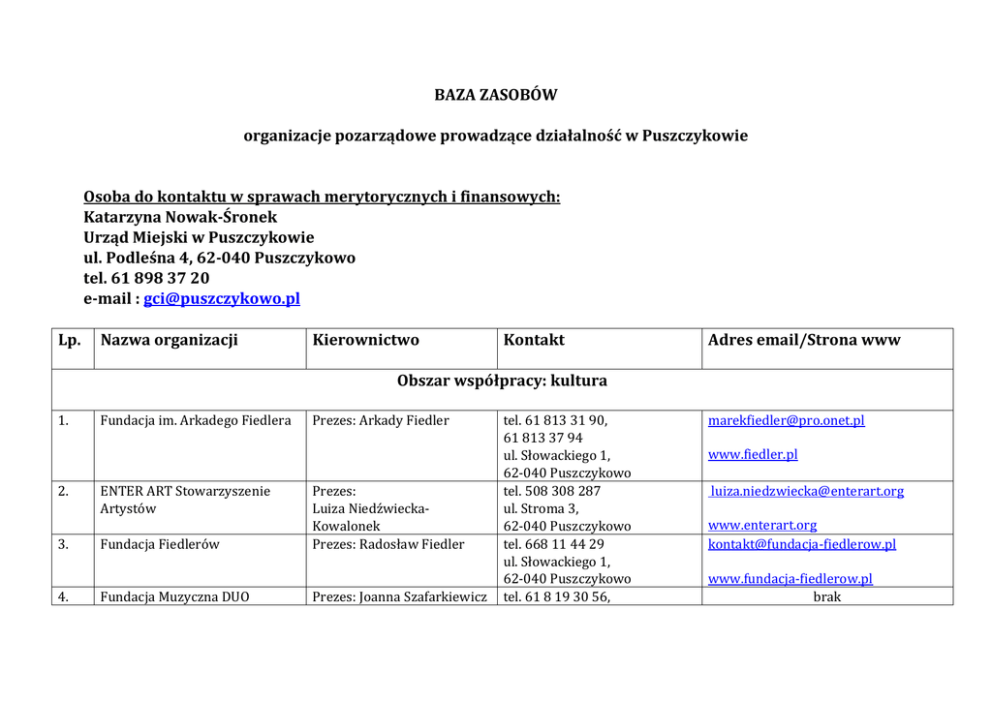 BAZA ZASOBÓW organizacje pozarządowe prowadzące działalność w Puszczykowie Osoba do kontaktu w sprawach merytorycznych i finansowych: Katarzyna Nowak-Śronek Urząd Miejski w Puszczykowie ul. Podleśna 4, 62-040 Puszczykowo tel. 61 898 37 20 e-mail : [email protected] Lp. Nazwa organizacji Kierownictwo Kontakt Adres email/Strona www Obszar współpracy: kultura 1. 2. 3. 4. Fundacja im. Arkadego Fiedlera ENTER ART Stowarzyszenie Artystów Fundacja Fiedlerów Fundacja Muzyczna DUO Prezes: Arkady Fiedler Prezes: Luiza NiedźwieckaKowalonek Prezes: Radosław Fiedler Prezes: Joanna Szafarkiewicz tel. 61 813 31 90, 61 813 37 94 ul. Słowackiego 1, 62-040 Puszczykowo tel. 508 308 287 ul. Stroma 3, 62-040 Puszczykowo tel. 668 11 44 29 ul. Słowackiego 1, 62-040 Puszczykowo tel. 61 8 19 30 56, [email protected] www.fiedler.pl [email protected] www.enterart.org [email protected] www.fundacja-fiedlerow.pl brak 5. 6. Stowarzyszenie Mondo Kolektiv Stowarzyszenie Kulturalne im. Praksedy Lemańskiej Prezes: Anna Mieszała Prezes: Tomasz Pawłowski ul. Brzozowa 1, 62-040 Puszczykowo ul. Czarnieckiego 33, 62-040 Puszczykowo tel. 508 928 056 ul. Szreniawska 6, 62-051 Wiry [email protected] www.facebook.com/mondokolektiv [email protected] http://stowarzyszenie-kulturalne.pl Obszar wspólpracy: wspierania i upowszechniania kultury fizycznej 1. 2. 3. Stowarzyszenie Sportowe „Akademia Tenisowa "Angelique Kerber" Prezes: Henryk Gawlak Klub Jeździecki NIWKA im. Krzysztofa Kulikowskiego Prezes: Hubert Kulikowski Klub Piłkarski LAS Puszczykowo Prezes: Miron Skołuda 4. Klubu Olimpijczyka im. Marka Łbika Prezes: Zbigniew Drajerczak 5. Międzyszkolny Klub Sportowy JUVENIA Puszczykowo Prezes: Jarosław Jagaciak 6. Międzyszkolny Klub Sportowy Puszczykowo Prezes: Jacek Piasecki 7. Polski Związek Wędkarski – Prezes: Przemysław tel. 61 898 33 46 fax 61 898 33 47 ul. Sobieskiego 50, 62-040 Puszczykowo tel. 61 813 34 00 ul. Niwka Stara 28, 62-040 Puszczykowo tel. 61 813 23 60 ul. Kościelna 7, 62-040 Puszczykowo tel. 607 444 995 ul. Wysoka 1, 62-040 Puszczykowo tel. 61 813 34 11 ul. Kasprowicza 3, 62-040 Puszczykowo tel. 666 85 13 82 ul. Gajowa 11, 62-040 Puszczykowo tel. 797 986 622 [email protected] www.akademia.angie.com.pl [email protected] www.niwka.poznan.pl [email protected] www.kplas.futbolowo.pl [email protected] [email protected] [email protected] [email protected] 8. 9. Koło przy Urzędzie Miasta Puszczykowa Puszczykowskie Towarzystwo Sportowe Towarzystwo Animatorów Rekreacji i Sportu Stefaniak Prezes: Wojciech Majchrzak Wiceprezes: Rafał Łukawski ul. Nizinna 11, 62-040 Puszczykowo tel. 501 446 602 ul. Wysoka 1, 62-040 Puszczykowo tel. 604 552 660 ul. Bukowska 69B/30, 60-567 Poznań om http://www.pzw.org.pl/puszczykowo [email protected] www.ptspuszczykowo.pl [email protected] www.taris.republika.pl Obszar współpracy: działalność społeczna 1. 2. 3. 5. Fundacja Polskich Kawalerów Maltańskich – Dom Pomocy Maltańskiej Fundacja Aktywności Lokalnej Fundacja im. Królowej Polski św. Jadwigi FUNDACJA "MY DZIECIOM" Kierownik: Jerzy Pelowski Prezes: Jacek Janicki Prezes: Andrzej Markiewicz Prezes: Przemysław Przybylski 6. Katolickie Stowarzyszenie Młodzieży Prezes: Wojciech Rybarczyk 7. Niezależni dla Powiatu Prezes: Piotr Zalewski tel./fax 61 819 44 46 ul. Dworcowa 16, 62-041 Puszczykowo [email protected] tel. 61 625 68 45, 693 198 715, faks: 61 625 6842 ul. Lipowa 6A, 62-040 Puszczykowo tel./fax 61 898 30 68 ul. Wczasowa 8a, 62-040 Puszczykowo tel. 536 336 706 ul. Czarnieckiego 56, 62-040 Puszczykowo ul. Dworcowa 16, 62-040 Puszczykowo [email protected] tel. 501 301 705 ul. Niezłomnych 40, 62-040 Puszczykowo [email protected] www.maltadom.fc.pl http://www.fal.org.p [email protected] www.jadwiga.org [email protected] www.mydzieciom.org www.jozefpuszczykowo.pl/ksm www.niezaleznidlapowiatu.pl 8. 9. 10. 11. 12. 13. 14. 15. 16. Mosińsko – Puszczykowskie Kurkowe Bractwo Strzeleckie im. dr Tadeusza Adama Jakubiaka Ochotnicza Straż Pożarna w Puszczykowie Oświatowa Fundacja Szkoły Podstawowej im. Adama Mickiewicza w Puszczykowie Polski Związek Emerytów, Rencistów i Inwalidów Prezes: Mikołaj Popławski ul. Solskiego 12, 62-040 Puszczykowo [email protected] [email protected] Prezes: Gniewko Niedbała Naczelnik: Marcin Ratajczak Dyrektor: Ewa Budzyńska Przewodnicząca: Danuta Janaszek tel. 609 608 450 ul. Zacisze 3, 62-040 Puszczykowo tel. 61 8133 461 ul. Wysoka 1, 62-040 Puszczykowo tel. 61 8133 648 ul. Wysoka 1, 62-040 Puszczykowo [email protected] www.puszczykowo.osp.org.pl [email protected] [email protected] [email protected] Zarząd Oddziału Rejonowego w Puszczykowie Parafia pw. Matki Boskiej Wniebowzietej Proboszcz ks. Roman Poźniak tel. 61 8133 183 ul. Kościelna 1, 62-040 Puszczykowo www.parafiapuszczykowo.pl/ Klubik Sówka Puszczykowskie Stowarzyszenie Nauczycieli "Senior" Fundacja ReStart Przewodniczący: Jerzy Łagoda Prezes: Joanna Pijacka ul. Wysoka 1, 62-040 Puszczykowo tel. 537 049 421 ul. Dzieci Wrzesińskich 13 61-066 Poznań Jaszkowo 16, 63-112 Brodnica tel. 61 8109 539 Urząd Miejski w Mosinie Pl. 20 Października 1 62-050 Mosina [email protected] Rotary Klub Poznań – Puszczykowo Stowarzyszenie Gmin Mikroregionu Wielkopolskiego Parku Prezydent: Leszek Storożuk Prezes: Zofia Springer Kierownik Biura: Magdalena Olejniczak-Salewicz www.fundacjarestart.com www.poznanpuszczykowo.rotary.org.pl [email protected] www.mikroregionwpn.pl 17. 18. 19. 20. 21. Narodowego Stowarzyszenie Przyjaciół Puszczykowa Stowarzyszenie PuszczykowoChateaugiron Wojewódzki Związek Pszczelarzy w Poznaniu- Koło Mosina-Puszczykowo Związek Harcerstwa Polskiego Chorągiew Wielkopolska,Hufiec Poznań Rejon Ośrodek Puszczykowo Związek Leśników Polskich Parków Narodowych Wielkopolski Park Narodowy Opracowała: Katarzyna Nowak-Śronek UM Puszczykowo Prezes: Gabriela Ozorowska Prezes: Hanna Badeja Prezes: Wojciech Kociemba Druh: Maciej Stelmachowski Przewodniczący: Piotr Kozłowski 