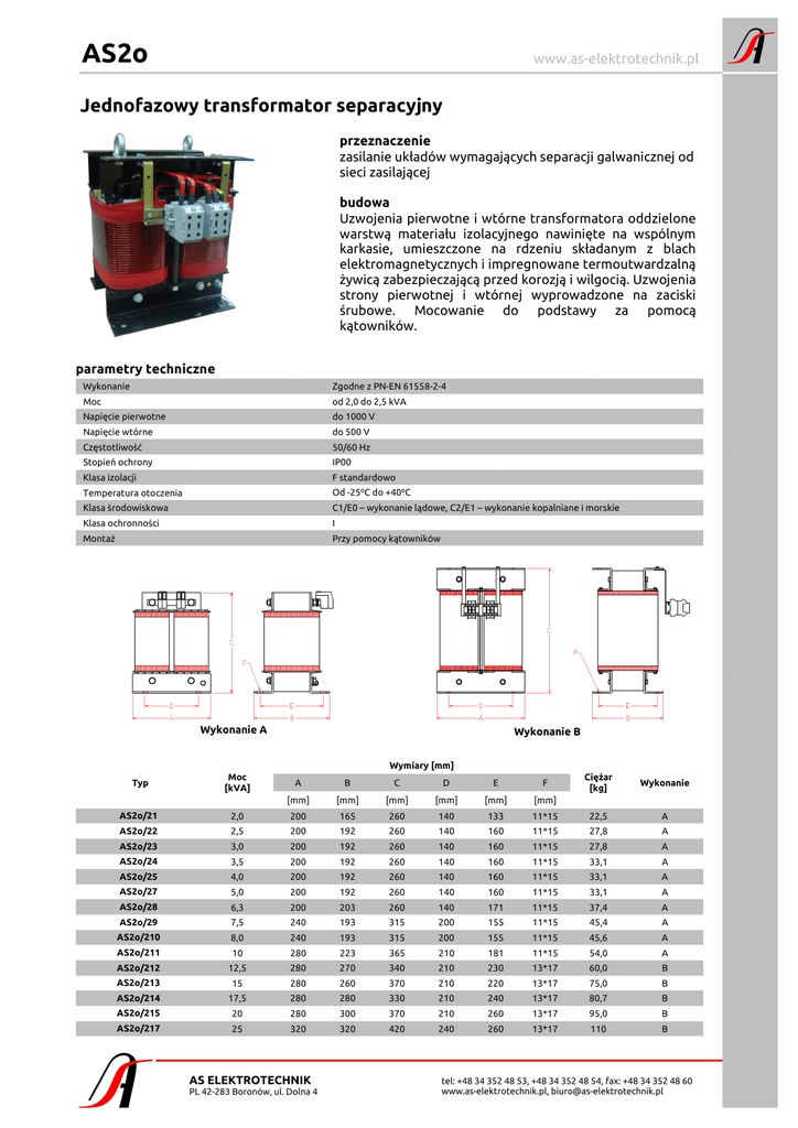 AS2o Jednofazowy transformator separacyjny przeznaczenie zasilanie układów wymagających separacji galwanicznej od sieci zasilającej budowa Uzwojenia pierwotne i wtórne transformatora oddzielone warstwą materiału izolacyjnego nawinięte na wspólnym karkasie, umieszczone na rdzeniu składanym z blach elektromagnetycznych i impregnowane termoutwardzalną żywicą zabezpieczającą przed korozją i wilgocią. Uzwojenia strony pierwotnej i wtórnej wyprowadzone na zaciski śrubowe. Mocowanie do podstawy za pomocą kątowników. parametry techniczne Wykonanie Zgodne z PN-EN 61558-2-4 Moc od 2,0 do 2,5 kVA Napięcie pierwotne do 1000 V Napięcie wtórne do 500 V Częstotliwość 50/60 Hz Stopień ochrony IP00 Klasa izolacji F standardowo Temperatura otoczenia Od -25⁰C do +40⁰C Klasa środowiskowa C1/E0 – wykonanie lądowe, C2/E1 – wykonanie kopalniane i morskie Klasa ochronności I Montaż Przy pomocy kątowników Wykonanie A Wykonanie B Wymiary [mm] Typ Moc [kVA] AS2o/21 2,0 AS2o/22 Ciężar [kg] Wykonanie 11*15 22,5 A 160 11*15 27,8 A 160 11*15 27,8 A A B C D E F [mm] [mm] [mm] [mm] [mm] [mm] 200 165 260 140 133 2,5 200 192 260 140 AS2o/23 3,0 200 192 260 140 AS2o/24 3,5 200 192 260 140 160 11*15 33,1 A AS2o/25 4,0 200 192 260 140 160 11*15 33,1 A AS2o/27 5,0 200 192 260 140 160 11*15 33,1 A AS2o/28 6,3 200 203 260 140 171 11*15 37,4 A AS2o/29 7,5 240 193 315 200 155 11*15 45,4 A AS2o/210 8,0 240 193 315 200 155 11*15 45,6 A A AS2o/211 10 280 223 365 210 181 11*15 54,0 AS2o/212 12,5 280 270 340 210 230 13*17 60,0 B AS2o/213 15 280 260 370 210 220 13*17 75,0 B AS2o/214 17,5 280 280 330 210 240 13*17 80,7 B AS2o/215 20 280 300 370 210 260 13*17 95,0 B AS2o/217 25 320 320 420 240 260 13*17 110 B