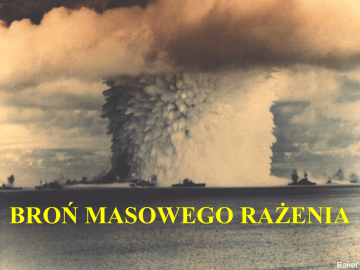 BROŃ MASOWEGO RAŻENIA MATERIAŁ SYNTEZY MATERIAŁ ROZSZCZEPIALNY ŹRÓDŁO NEUTRONÓW REFLEKTOR MATERIAŁ WYBUCHOWY BUDOWA BRONI NUKLEARNEJ CZYNNIKI RAŻENIA BRONI NUKLEARNEJ 0 10 20 30 40 50 • FALA UDERZENIOWA • PROMIENIOWANIE CIEPLNE • PROMIENIOWANIE PRZENIKLIWE • PROMIENIOTWÓRCZE SKAŻENIE TERENU • IMPULS ELEKTROMAGNETYCZNY PROMIENIOWANIE CIEPLNE 160 oparzenia 1 st. 20 5 110 oparzenia 3 st. 15 2,5 95 zapala się drewno 13 1,5 topią się blachy karoserii samochodowych topi się większość materiałów 70 9 1 18 100 MT 10 MT 10 kT 3 0,3 0km 20km 40km 60km 80km 100km 120km 140km 160km FALA UDERZENIOWA poranienia odłamkami 30 14 zniszczenie budowli ceglanych pęknięcie błony bębenkowej uszkodzenia konstr. żelbetowych 4 uszkodzenia płuc 2 0km 5 29 14 6 9 40 18 9 65 100 MT 10 MT 1 MT 19 10 10km 20km 30km 40km 50km 60km 70km KLASYFIKACJA • • • • • • • naziemny podziemny nawodny podwodny powietrzny niski powietrzny wysoki kosmiczny • mały do 15 kT • średni 15 – 100kT • wielki ponad 100kT FALA UDERZENIOWA poranienia odłamkami uszkodzenia konstr. żelbetowych 4 2 0km 5 29 14 6 9 40 18 9 pęknięcie błony bębenkowej uszkodzenia płuc 30 14 zniszczenie budowli ceglanych 65 100 MT 10 MT 1 MT 19 10 10km 20km 30km 40km 50km 60km 70km KLASYFIKACJA • • • • • • • naziemny podziemny nawodny podwodny powietrzny niski powietrzny wysoki kosmiczny • mały do 15 kT • średni 15 – 100kT • wielki ponad 100kT OCHRONA Czynniki ograniczające prom. przenikliwe (przykł.) : warstwa ziemi 14 cm osłabia dwukrotnie pancerz stalowy 2.8 cm warstwa ziemi 60 cm osłabia dwudziestokrotnie pancerz stalowy 12 cm BROŃ CHEMICZNA • • • • • paralityczno -drgawkowe ( tabun, sarin, soman, Vx ) ogólnotrujące (kwas pruski, chlorocyjan, arseno-wodór) parzące - (iperyt, luizyt, iperyt azotowy ) duszące - (fosgen, dwufosgen, trójfosgen) drażniące - (adamsyt, chloroacetofenon, chloropikryna) • psychochemiczne (meskalina, LSD) 38tys. ton 23 tys ton ZAPASY BRONI CHEMICZNEJ ZADEKLAROWANE DO KONWENCJI ok. 10ton ADAMSYTU ŚRODKI CHEMICZNE SKŁADOWANE W ROSJI 40 tys. ton luizyt 17% iperyt 2% luizyt+iperyt 1% fosforoorganiczne 80% ZAPASY BRONI CHEMICZNEJ ROSJI Luizyt RH7 (iperyt + luizyt) Iperyt Sarin Soman Zagęszcz. recept. (iperyt +luizyt) Zagęszczony Soman Zagęszczony Vx Vx Fosgen - 6 000 t; 261 t; 692 t; 7 584 t; 3 292 t; 11,5 t; 5 000 t; 171 t; 15 300 t; 5 t; RAZEM - 38 316,5 t; OCHRONA PRZED BŚT indywidualna zbiorowa TOKSYCZNE ŚRODKI PRZEMYSŁOWE ( TŚP ) Kwidzyń Police Bydgoszcz Płock Kostrzyń Włocławe k Warszawa Puławy Brzeg Dolny chlor amoniak Kędzie rzyn Chorzów M ielec Sarzyna Tarnów Oświęcim NH3 SO2 Cl2 Sposób działania Objawy zatrucia Jest niebezpieczny dla oczu, dróg oddechowych, ośrodkowego układu nerwowego i skóry. Po kilku minutach intensywnego działania amoniaku następuje osłabienie mięśni ze wzmożoną aktywnością odruchową, pojawiają się drgawki, ulega gwałtownemu obniżeniu próg słuchu, możliwy obrzęk płuc. W wyniku zatrucia amoniakiem możliwe jest pojawienie się zaburzeń psychicznych i neurologicznych, mętnienie rogówki i soczewki a czasem nawet utrata wzroku. Duże stężenia wywołują obfite łzawienie, ból oczu, duszność, silne napady kaszlu, zawroty głowy, bóle żołądka, wymioty, zatrzymanie moczu. Możliwość wystąpienia kurczu krtani i obrzęku strun głosowych. Pojawia się ból za mostkiem, czkawka, czasami wymioty. Podczas działania na skórę, bez dokonania zabiegu w postaci natychmiastowego zmycia, pojawia się rumień, pęcherze i owrzodzenia. Działa na błony śluzowe (wilgotne) wskutek tworzenia się kwasów siarkawego lub siarkowego wywołujących silne miejscowe podrażnienie. Rozwija się skurcz oskrzeli, pojawiają się trudności w oddychaniu, ulega zachwianiu przemiana węglowodanowa i białkowa, a także procesy utleniania w rdzeniu kręgowym, w wątrobie, śledzionie, mięśniach. Podrażnienie oczu, nosa i gardła. Przy krótkotrwałym działaniu występują wymioty, trudności w mowie i połykaniu. Śmierć może nastąpić w wyniku uduszenia, będącego rezultatem odruchowego skurczu szczeliny głosowej, nagłego zatrzymania obiegu krwi w płucach lub szoku, a także obrzęku płuc. Podrażnia drogi oddechowe, może wywołać obrzęk płuc. We krwi pod wpływem chloru ulega zmianie skład wolnych aminokwasów oraz obniża się aktywność niektórych tlenków. Przy zatruciach średnimi i małymi stężeniami pojawiają się nagłe bóle w klatce piersiowej, pieczenie i kłucie w oczach, łzawienie, męczący i suchy kaszel. Po 2–3 godz. rozwija się obrzęk płuc. Działanie wysokich stężeń może spowodować natychmiastową śmierć, wskutek odruchowego zablokowania płuc. Porażonemu brak tchu, twarz robi mu się sina, miota się, usiłuje biec, pada, traci przytomność. Chlor gazowy działa na skórę, wywołując ostrą dermatozę. Orientacyjna ocena pionowej stateczności powietrza (bez pokrywy śnieżnej) Prędkość wiatru Noc Dzień [ m/s ] 0,5 0,6 – 2,0 INWERSJA KONWEKCJA 2,1 – 4,0 ponad 4,0 IZOTERMIA IZOTERMIA Orientacyjne zasięgi skażenia wywołanego wyciekiem amoniaku i chloru Prędkość wiatru na wysokości 2m [m/s] TŚP masa Konwekcja [t] 1 Amoniak 3 Inwersja 1 2 4 6 1 2 3 30 0,5 pon. 0,5 1,8 1,2 0,8 0,6 3,6 2,4 1,5 50 0,7 pon. 0,5 2,4 1,6 1,1 0,8 5,0 3,2 2,1 100 0,9 0,7 0,6 3,5 2,4 1,6 1,3 6,7 4,4 3,4 150 1,1 0,8 0,7 4,4 3,0 2,0 1,6 8,6 5,6 4,3 300 1,6 1,1 0,9 6,6 4,4 3,0 2,4 13 8,6 6,7 500 2,0 1,4 1,2 8,8 6,0 4,0 3,2 18 12 9,2 2,1 1,4 0,9 1 Chlor 2 Izotermia pon. 0,5 0,6 pon. 0,5 10 0,9 0,6 0,5 4,0 2,7 1,8 1,3 8,7 5,7 3,7 30 1,4 1,0 0,7 7,4 5,0 3,4 2,7 17 11 7,3 50 1,8 1,3 0,9 10 6,8 4,6 3,6 24 15 10 100 2,9 2,0 1,7 14 9,5 6,4 5,1 30 20 15 Orientacyjne zasięgi skażenia wywołanego wyciekiem DIOKSYNY Konwekcja Masa w kg Izotermia Inwersja Prędkość wiatru na wysokości 2m [ m/s] 1 2 3 1 2 4 6 1 2 3 2 0,5 pon. 0,5 2,0 1,3