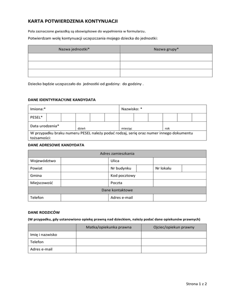 KARTA POTWIERDZENIA KONTYNUACJI Pola zaznaczone gwiazdką są obowiązkowe do wypełnienia w formularzu . Potwierdzam wolę kontynuacji uczęszczania mojego dziecka do jednostki: Nazwa jednostki* Nazwa grupy* Dziecko będzie uczęszczało do jednostki od godziny: do godziny . DANE IDENTYFIKACYJNE KANDYDATA Imiona:* Nazwisko: * PESEL* Data urodzenia* dzień miesiąc rok W przypadku braku numeru PESEL należy podać rodzaj, serię oraz numer innego dokumentu tożsamości: DANE ADRESOWE KANDYDATA Adres zamieszkania Województwo Ulica Powiat Nr budynku Gmina Kod pocztowy Miejscowość Poczta Nr lokalu Dane kontaktowe Telefon Adres e-mail DANE RODZICÓW (W przypadku, gdy ustanowiono opiekę prawną nad dzieckiem, należy podać dane opiekunów prawnych) Matka/opiekunka prawna Ojciec/opiekun prawny Imię i nazwisko Telefon Adres e-mail Strona 1 z 2 Proszę wypełnić obie kolumny, gdy adresy zamieszkania rodziców są różne. Adresy zamieszkania rodziców Województwo Powiat Gmina Miejscowość Ulica Nr budynku Nr lokalu Kod pocztowy Poczta OŚWIADCZENIE DOTYCZĄCE DANYCH OSOBOWYCH Przyjmuję do wiadomości, iż zgodnie z przepisami ustawy z dnia 29 sierpnia 1997 roku o ochronie danych osobowych (tekst jednolity Dz. U. z 2014 r. poz. 1182 i 1662.) administratorem danych jest jednostka, której pełna nazwa i adres są wskazane na pierwszej stronie niniejszego potwierdzenia. Mam świadomość przysługującego mi prawa wglądu do treści danych oraz ich poprawiania. ……………………….................. …………………………..………….. podpis matki/opiekunki prawnej podpis ojca/opiekuna prawnego …………..…………………., dnia ………………………. Strona 2 z 2