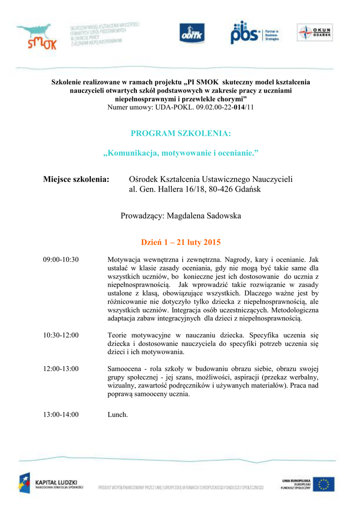 Szkolenie realizowane w ramach projektu „PI SMOK skuteczny model kształcenia nauczycieli otwartych szkół podstawowych w zakresie pracy z uczniami niepełnosprawnymi i przewlekle chorymi” Numer umowy: UDA-POKL. 09.02.00-22-014/11 PROGRAM SZKOLENIA: „Komunikacja, motywowanie i ocenianie.” Ośrodek Kształcenia Ustawicznego Nauczycieli al. Gen. Hallera 16/18, 80-426 Gdańsk Miejsce szkolenia: Prowadzący: Magdalena Sadowska Dzień 1 – 21 luty 2015 09:00-10:30 Motywacja wewnętrzna i zewnętrzna. Nagrody, kary i ocenianie. Jak ustalać w klasie zasady oceniania, gdy nie mogą być takie same dla wszystkich uczniów, bo konieczne jest ich dostosowanie do ucznia z niepełnosprawnością. Jak wprowadzić takie rozwiązanie w zasady ustalone z klasą, obowiązujące wszystkich. Dlaczego ważne jest by różnicowanie nie dotyczyło tylko dziecka z niepełnosprawnością, ale wszystkich uczniów. Integracja osób uczestniczących. Metodologiczna adaptacja zabaw integracyjnych dla dzieci z niepełnosprawnością. 10:30-12:00 Teorie motywacyjne w nauczaniu dziecka. Specyfika uczenia się dziecka i dostosowanie nauczyciela do specyfiki potrzeb uczenia się dzieci i ich motywowania. 12:00-13:00 Samoocena - rola szkoły w budowaniu obrazu siebie, obrazu swojej grupy społecznej - jej szans, możliwości, aspiracji (przekaz werbalny, wizualny, zawartość podręczników i używanych materiałów). Praca nad poprawą samooceny ucznia. 13:00-14:00 Lunch. 14:00-15:30 Wyzwanie, trudne doświadczenie, porażka - ochrona przed doznawaniem tych trudnych sytuacji jako forma dyskryminacji, wpływ strategii „ochronnego klosza” na przyszłe funkcjonowanie osób z niepełnosprawnością, ale również na kształtowanie się wyobrażeń zdrowych uczniów na temat możliwości oraz miejsca w społeczeństwie osób z niepełnosprawnością / przewlekłą chorobą. 15:30-17:00 Planowanie - jak przygotować ucznia do planowania swojej nauki w bardziej elastyczny sposób, zakładający z góry możliwość wystąpienia pewnych „ryzyk”. Dzień 2 – 22 luty 2015 09:00-11:00 Komunikacja motywacyjna i motywująca do pracy szkolnej dla dzieci w klasach integracyjnych. Jak efektywnie komunikować się z dziećmi zdrowymi i z niepełnosprawnościami. 11:00-13:00 Ćwiczenia praktyczne w komunikacji motywującej do pracy szkolnej. 13:00-14:00 Lunch 14:00-16:00 Zebranie najlepszych praktyk w temacie szkolenia. 16:00-17:00 Podsumowanie i zakończenie warsztatów.