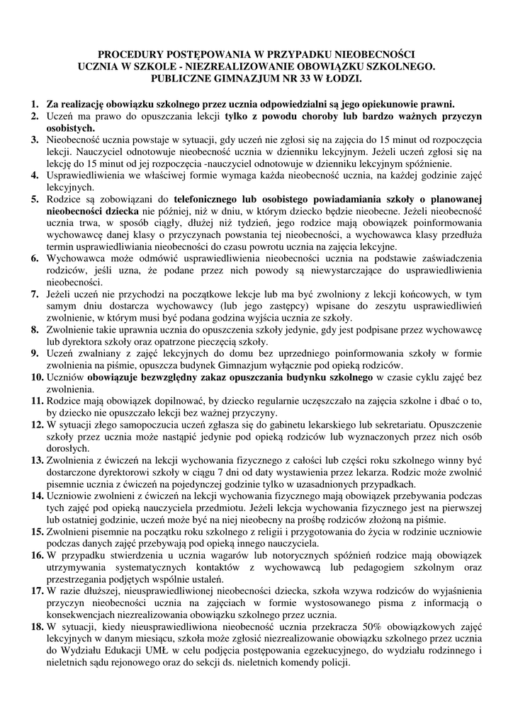 PROCEDURY POSTĘPOWANIA W PRZYPADKU NIEOBECNOŚCI UCZNIA W SZKOLE - NIEZREALIZOWANIE OBOWIĄZKU SZKOLNEGO. PUBLICZNE GIMNAZJUM NR 33 W ŁODZI. 1. Za realizację obowiązku szkolnego przez ucznia odpowiedzialni są jego opiekunowie prawni. 2. Uczeń ma prawo do opuszczania lekcji tylko z powodu choroby lub bardzo ważnych przyczyn osobistych. 3. Nieobecność ucznia powstaje w sytuacji, gdy uczeń nie zgłosi się na zajęcia do 15 minut od rozpoczęcia lekcji. Nauczyciel odnotowuje nieobecność ucznia w dzienniku lekcyjnym. Jeżeli uczeń zgłosi się na lekcję do 15 minut od jej rozpoczęcia -nauczyciel odnotowuje w dzienniku lekcyjnym spóźnienie. 4. Usprawiedliwienia we właściwej formie wymaga każda nieobecność ucznia, na każdej godzinie zajęć lekcyjnych. 5. Rodzice są zobowiązani do telefonicznego lub osobistego powiadamiania szkoły o planowanej nieobecności dziecka nie później, niż w dniu, w którym dziecko będzie nieobecne. Jeżeli nieobecność ucznia trwa, w sposób ciągły, dłużej niż tydzień, jego rodzice mają obowiązek poinformowania wychowawcę danej klasy o przyczynach powstania tej nieobecności, a wychowawca klasy przedłuża termin usprawiedliwiania nieobecności do czasu powrotu ucznia na zajęcia lekcyjne. 6. Wychowawca może odmówić usprawiedliwienia nieobecności ucznia na podstawie zaświadczenia rodziców, jeśli uzna, że podane przez nich powody są niewystarczające do usprawiedliwienia nieobecności. 7. Jeżeli uczeń nie przychodzi na początkowe lekcje lub ma być zwolniony z lekcji końcowych, w tym samym dniu dostarcza wychowawcy (lub jego zastępcy) wpisane do zeszytu usprawiedliwień zwolnienie, w którym musi być podana godzina wyjścia ucznia ze szkoły. 8. Zwolnienie takie uprawnia ucznia do opuszczenia szkoły jedynie, gdy jest podpisane przez wychowawcę lub dyrektora szkoły oraz opatrzone pieczęcią szkoły. 9. Uczeń zwalniany z zajęć lekcyjnych do domu bez uprzedniego poinformowania szkoły w formie zwolnienia na piśmie, opuszcza budynek Gimnazjum wyłącznie pod opieką rodziców. 10. Uczniów obowiązuje bezwzględny zakaz opuszczania budynku szkolnego w czasie cyklu zajęć bez zwolnienia. 11. Rodzice mają obowiązek dopilnować, by dziecko regularnie uczęszczało na zajęcia szkolne i dbać o to, by dziecko nie opuszczało lekcji bez ważnej przyczyny. 12. W sytuacji złego samopoczucia uczeń zgłasza się do gabinetu lekarskiego lub sekretariatu. Opuszczenie szkoły przez ucznia może nastąpić jedynie pod opieką rodziców lub wyznaczonych przez nich osób dorosłych. 13. Zwolnienia z ćwiczeń na lekcji wychowania fizycznego z całości lub części roku szkolnego winny być dostarczone dyrektorowi szkoły w ciągu 7 dni od daty wystawienia przez lekarza. Rodzic może zwolnić pisemnie ucznia z ćwiczeń na pojedynczej godzinie tylko w uzasadnionych przypadkach. 14. Uczniowie zwolnieni z ćwiczeń na lekcji wychowania fizycznego mają obowiązek przebywania podczas tych zajęć pod opieką nauczyciela przedmiotu. Jeżeli lekcja wychowania fizycznego jest na pierwszej lub ostatniej godzinie, uczeń może być na niej nieobecny na prośbę rodziców złożoną na piśmie. 15. Zwolnieni pisemnie na początku roku szkolnego z religii i przygotowania do życia w rodzinie uczniowie podczas danych zajęć przebywają pod opieką innego nauczyciela. 16. W przypadku stwierdzenia u ucznia wagarów lub notorycznych spóźnień rodzice mają obowiązek utrzymywania systematycznych kontaktów z wychowawcą lub pedagogiem szkolnym oraz przestrzegania podjętych wspólnie ustaleń. 17. W razie dłuższej, nieusprawiedliwionej nieobecności dziecka, szkoła wzywa rodziców do wyjaśnienia przyczyn nieobecności ucznia na zajęciach w formie wystosowanego pisma z informacją o konsekwencjach niezrealizowania obowiązku szkolnego przez ucznia. 18. W sytuacji, kiedy nieusprawiedliwiona nieobecność ucznia przekracza 50% obowiązkowych zajęć lekcyjnych w danym miesiącu, szkoła może zgłosić niezrealizowanie obowiązku szkolnego przez ucznia do Wydziału Edukacji UMŁ w celu podjęcia postępowania egzekucyjnego, do wydziału rodzinnego i nieletnich sądu rejonowego oraz do sekcji ds. nieletnich komendy policji.