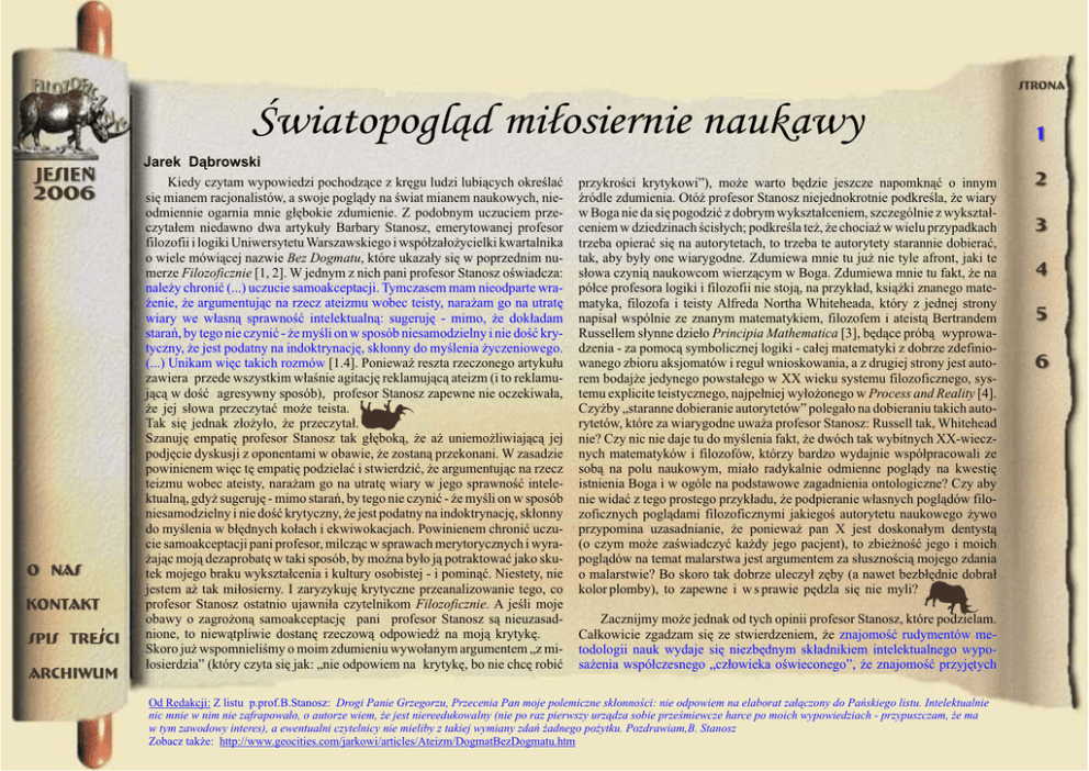 strona Światopogląd miłosiernie naukawy , JESIEN 2006 o nas kontakt , spis tresci archiwum Jarek Dąbrowski Kiedy czytam wypowiedzi pochodzące z kręgu ludzi lubiących określać się mianem racjonalistów, a swoje poglądy na świat mianem naukowych, nieodmiennie ogarnia mnie głębokie zdumienie. Z podobnym uczuciem przeczytałem niedawno dwa artykuły Barbary Stanosz, emerytowanej profesor filozofii i logiki Uniwersytetu Warszawskiego i współzałożycielki kwartalnika o wiele mówiącej nazwie Bez Dogmatu, które ukazały się w poprzednim numerze Filozoficznie [1, 2]. W jednym z nich pani profesor Stanosz oświadcza: należy chronić (...) uczucie samoakceptacji. Tymczasem mam nieodparte wrażenie, że argumentując na rzecz ateizmu wobec teisty, narażam go na utratę wiary we własną sprawność intelektualną: sugeruję - mimo, że dokładam starań, by tego nie czynić - że myśli on w sposób niesamodzielny i nie dość krytyczny, że jest podatny na indoktrynację, skłonny do myślenia życzeniowego. (...) Unikam więc takich rozmów [1.4]. Ponieważ reszta rzeczonego artykułu zawiera przede wszystkim właśnie agitację reklamującą ateizm (i to reklamującą w dość agresywny sposób), profesor Stanosz zapewne nie oczekiwała, że jej słowa przeczytać może teista. Tak się jednak złożyło, że przeczytał. Szanuję empatię profesor Stanosz tak głęboką, że aż uniemożliwiającą jej podjęcie dyskusji z oponentami w obawie, że zostaną przekonani. W zasadzie powinienem więc tę empatię podzielać i stwierdzić, że argumentując na rzecz teizmu wobec ateisty, narażam go na utratę wiary w jego sprawność intelektualną, gdyż sugeruję - mimo starań, by tego nie czynić - że myśli on w sposób niesamodzielny i nie dość krytyczny, że jest podatny na indoktrynację, skłonny do myślenia w błędnych kołach i ekwiwokacjach. Powinienem chronić uczucie samoakceptacji pani profesor, milcząc w sprawach merytorycznych i wyrażając moją dezaprobatę w taki sposób, by można było ją potraktować jako skutek mojego braku wykształcenia i kultury osobistej - i pominąć. Niestety, nie jestem aż tak miłosierny. I zaryzykuję krytyczne przeanalizowanie tego, co profesor Stanosz ostatnio ujawniła czytelnikom Filozoficznie. A jeśli moje obawy o zagrożoną samoakceptację pani profesor Stanosz są nieuzasadnione, to niewątpliwie dostanę rzeczową odpowiedź na moją krytykę. Skoro już wspomnieliśmy o moim zdumieniu wywołanym argumentem „z miłosierdzia” (który czyta się jak: „nie odpowiem na krytykę, bo nie chcę robić przykrości krytykowi”), może warto będzie jeszcze napomknąć o innym źródle zdumienia. Otóż profesor Stanosz niejednokrotnie podkreśla, że wiary w Boga nie da się pogodzić z dobrym wykształceniem, szczególnie z wykształceniem w dziedzinach ścisłych; podkreśla też, że chociaż w wielu przypadkach trzeba opierać się na autorytetach, to trzeba te autorytety starannie dobierać, tak, aby były one wiarygodne. Zdumiewa mnie tu już nie tyle afront, jaki te słowa czynią naukowcom wierzącym w Boga. Zdumiewa mnie tu fakt, że na półce profesora logiki i filozofii nie stoją, na przykład, książki znanego matematyka, filozofa i teisty Alfreda Northa Whiteheada, który z jednej strony napisał wspólnie ze znanym matematykiem, filozofem i ateistą Bertrandem Russellem słynne dzieło Principia Mathematica [3], będące próbą wyprowadzenia - za pomocą symbolicznej logiki - całej matematyki z dobrze zdefiniowanego zbioru aksjomatów i reguł wnioskowania, a z drugiej strony jest autorem bodajże jedynego powstałego w XX wieku systemu filozoficznego, systemu explicite teistycznego, najpełniej wyłożonego w Process and Reality [4]. Czyżby „staranne dobieranie autorytetów” polegało na dobieraniu takich autorytetów, które za wiarygodne uważa profesor Stanosz: Russell tak, Whitehead nie? Czy nic nie daje tu do myślenia fakt, że dwóch tak wybitnych XX-wiecznych matematyków i filozofów, którzy bardzo wydajnie współpracowali ze sobą na polu naukowym, miało radykalnie odmienne poglądy na kwestię istnienia Boga i w ogóle na podstawowe zagadnienia ontologiczne? Czy aby nie widać z tego prostego przykładu, że podpieranie własnych poglądów filozoficznych poglądami filozoficznymi jakiegoś autorytetu naukowego żywo przypomina uzasadnianie, że ponieważ pan X jest doskonałym dentystą (o czym może zaświadczyć każdy jego pacjent), to zbieżność jego i moich poglądów na temat malarstwa jest argumentem za słusznością mojego zdania o malarstwie? Bo skoro tak dobrze uleczył zęby (a nawet bezbłędnie dobrał kolor plomby), to zapewne i w s prawie pędzla się nie myli? Zacznijmy może jednak od tych opinii profesor Stanosz, które podzielam. Całkowicie zgadzam się ze stwierdzeniem, że znajomość rudymentów metodologii nauk wydaje się niezbędnym składnikiem intelektualnego wyposażenia współczesnego „człowieka oświeconego”, że znajomość przyjętych Od Redakcji: Z listu p.prof.B.Stanosz: Drogi Panie Grzegorzu, Przecenia Pan moje polemiczne skłonności: nie odpowiem na elaborat załączony do Pańskiego listu. Intelektualnie nic mnie w nim nie zafrapowało, o autorze wiem, że jest niereedukowalny (nie po raz pierwszy urządza sobie prześmiewcze harce po moich wypowiedziach - przypuszczam, że ma w tym zawodowy interes), a ewentualni czytelnicy nie mieliby z takiej wymiany zdań żadnego pożytku. Pozdrawiam,B. Stanosz Zobacz także: http://www.geocities.com/jarkowi/articles/Ateizm/DogmatBezDogmatu.htm 1 2 3 4 5 6 strona w nauce, wzorcowych kryteriów ścisłości języka i zasadności twierdzeń może uzbroić umysł ludzki w krytycyzm zarówno w sprawach światopoglądowych, jak społecznych, czy zgoła osobistych [2.1]. Nie mam również większych zastrzeżeń do przekonania, że przyczyny nadużywania słowa „prawda” przez teologów, pol