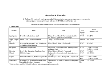 Gimnazjum Nr 8 Specjalne 1. Podręczniki i materiały edukacyjne uwzględniające potrzeby edukacyjne niepełnosprawnych uczniów obowiązujące w klasach pierwszych od roku 2015/2016 przez 3 kolejne lata klasa 1a – uczniowie z niepełnosprawnością intelektualna w stopniu lekkim 1. Podręczniki Przedmiot Język polski Autor Ewa Horwath, Grażyna Kiełb Język angiel- David Todd, Tamzin Thompson ski Historia Krzysztof Kowalewski, Igor Kąkolewski, Anita Plumińska-Mieloch Geografia Małgorzata Wojtatowicz Biologia Chemia Ewa Pyłka-Gutowska, Ewa Jastrzębska Elżbieta Megiel Fizyka Danuta Gawlik-Szot, Barbara Sagnowska Tytuł Bliżej słowa. Klasa 1. Podręcznik do kształcenia literacko-językowo-kulturowego* Today 1. Książka ucznia Pearson 669/1/2013 Bliżej historii. Klasa 1. Podręcznik* WSiP 61/1/2009 Podręcznik z ćwiczeniami dla gimnazjum specjalnego. Część 1 i 2 Bliżej biologii. Klasa 1. Podręcznik Podręcznik z ćwiczeniami dla gimnazjum specjalnego Świat fizyki z bliska. Podręcznik. Część 1 i 2* WSiP Cz. 1S-1-14/2011 Cz. 2S-1-11/2011 74/1/2009 S-1-15/2011 Karolina Wej, Wojciech Babiański, Ewa Matematyka na czasie! 1 Podręcznik do gimnaSzmytkiewicz, Jerzy Janowicz zjum * Podręczniki z zasobów biblioteki szkolnej (nie zostały zakupione z dotacji). Matematyka Numer Wydopuszczenia dawnictwo WSiP 27/1/2019 WSiP WSiP ZamKor Nowa Era Cz. 1S-1-9/2011 Cz. 2S-1-17/2011 742/1/2015 2. Materiały edukacyjne Autor Anna Szczepańska Tytuł Alchemik i Hortensja. Kreatywne ćwiczenia ortograficzne. Ćwiczenia czytania ze zrozumieniem. Klasa 4-6 Anna Żywot Aspekt czasownika. Materiał obrazkowo-wyrazowy do terapii dzieci i dorosłych z zaburzeniami komunikacji językowej Atlas geograficzny. Gimnazjum klasy 1-3 Małgorzata Barańska Co do czego pasuje? – gry i zabawy ortograficzne Władysława Paczesna Czy już umiem? Testy z matematyki dla klas 4-6 szkoły podstawowej Elżbieta Wujczyk, Ewa Ciągowska Czytanie ze zrozumieniem dla kl. 3 szkoły podstawowej Elżbieta Wujczyk, Ewa Ciągowska Czytanie ze zrozumieniem dla kl. 4 szkoły podstawowej Agnieszka Warzybok Czytanie ze zrozumieniem dla kl. 5 szkoły podstawowej Agnieszka Warzybok Czytanie ze zrozumieniem dla kl. 6 szkoły podstawowej Małgorzata Barańska Czy tu, czy tam – czytam! Testy kształcące czytanie ze zrozumieniem dla klas II-IV Czytanki. Materiały do nauki czytania metodą sylabową Marta Wiśniewska Ćwiczenia językowe – propozycje zadań dla dzieci i dorosłych z zaburzeniami w komunikacji językowej Witold Szwejkowski Ćwiczenia wyrównawcze z matematyki dla uczniów klasy 4 szkoły podstawowej Aleksander Jaglarz Ćwiczę koncentrację – karty pracy Elżbieta Szymankiewicz Dyslektyczne ucho. Zbiór ćwiczeń stymulujących rozwój percepcji słuchowej nie tylko dla uczniów z dysleksją Barbara Sawicka Dźwięczna czy bezdźwięczna. Zdania Jadwiga Jawor-Baranowska, Emilia Frazeologizmy. Ćwiczenia dla uczniów szkoły podstawowej i gimnazjum Bryndal, Agnieszka Kwiatkowska Historyjki obrazkowe z humorem Małgorzata Barańska Historyjki obrazkowo-zdaniowe z pytaniami Małgorzata Barańska Identyczne czy podobne? – ćwiczenia kształtujące umiejętność spostrzegania różnic w położeniu przedmiotów Barbara Włodarczyk Interpunkcja na szóstkę. Zasady interpunkcji z ćwiczeniami Wydawnictwo Harmonia WiR WSiP Harmonia Olimp WiR WiR WiR WiR Harmonia Harmonia Harmonia WiR WiR Harmonia Harmonia Wyd. Pedagogiczne ZNP Harmonia Harmonia Harmonia Skrzat Język polski. Ćwiczenia redakcyjne dla gimnazjum. Klasy 1-3 Język polski. Ćwiczenia w terapii dysleksji i dysortografii dla uczniów klas 4-6. CH-H Elżbieta Suwalska Język polski. Ćwiczenia w terapii dysleksji i dysortografii dla uczniów klas 4-6. ÓU Elżbieta Suwalska Język polski. Ćwiczenia w terapii dysleksji i dysortografii dla uczniów klas 4-6. RZŻ Elżbieta Suwalska Język polski. Ćwiczenia w terapii dysleksji i dysortografii dla uczniów klas 4-6. Zmiękczenia Danuta Chwastniewska, Danuta Różek, Język polski 1. Nauka o języku dla gimnazjum. Część 1 i 2 Anna Halasz, Piotr Borys, Agnieszka Gorzałczyńska-Mróz, Maciej Szulc Danuta Chwastniewska, Danuta Różek, Język polski 2. Nauka o języku dla gimnazjum. Część 1 i 2 Anna Halasz, Piotr Borys, Agnieszka Gorzałczyńska-Mróz, Maciej Szulc Anna Halasz, Piotr Borys, Małgorzata Język polski 3. Nauka o języku dla gimnazjum. Część 1 i 2 Hajduk, Beata Fiszer Anna Szczepańska Kalambury wzrokowo słuchowo ruchowe dla uczniów szkoły podstawowej Mateusz Indyka Kąty, wielokąty – ćwiczenia z geometrii dla szkoły podstawowej Jagoda Cieszyńska, Andrzej Dąbek Kocham mówić. Historyjki obrazkowe z tekstami Andrzej Surdej, Beata Surdej Elżbieta Suwalska Barbara Zakrzewska Georg Bemmerlein Agnieszka Kruszyńska Maciej Kloc Ewa Horwath Beata Fiszer, Małgorzata Hajduk Helena Kajetanowicz Małgorzata Podleśna Zofia Handzel WSiP Harmonia Harmonia Harmonia Harmonia GWO GWO GWO Harmonia WiR Wydawnictwo Edukacyjne Kombinatoryka zdaniowa. Pomyśl - działaj - sprawdź Harmonia Krzyżówki matematyczne WiR Który wyraz jest poprawny? Harmonia Kultura, media i ja! Karty pracy dla uczniów klas 4-6 szkoły podstawowej. Część 1 WSiP Kwadratowy zawrót głowy. Krzyżówki logopedyczne Harmonia Lekturowe karty pracy. Gimnazjum. Klasy 1-3 WSiP Lektury w gimnazjum. Zeszyt ćwiczeń z programem online GWO Licz się ze słowami. Ćwiczenia leksykalne i frazeologiczne GWO Liczydełko. Dodawanie i odejmowanie – zestaw kart wykorzystywany do zajęć wy- WiR równawczych Loteryjki obrazkowo-sylabowe – pomoc do ćwiczeń w nauce czytania i pisania Harmonia Łamigłówki na cały rok – 365 krzyżówek, zgadywanek i labiryntów Mariola Rosłoniec, Beata Szydłowska Matematyczne podchody z Olimpem. Klasa trzecia Elżbieta Dędza Matematyczny Olimpek. Klasa trzecia Matematyka jest super – dzielenie – karty edukacyjne Matematyka jest super – odejmowanie – karty edukacyjne Mat
