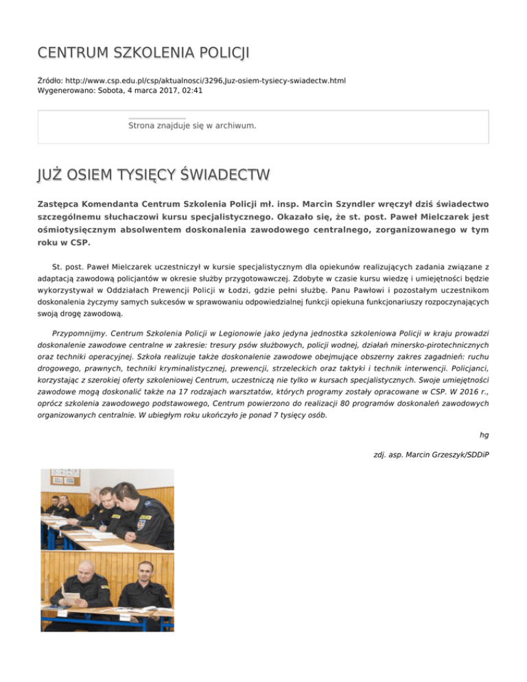 CENTRUM SZKOLENIA POLICJI Źródło: http://www.csp.edu.pl/csp/aktualnosci/3296,Juz-osiem-tysiecy-swiadectw.html Wygenerowano: Sobota, 4 marca 2017, 02:41 Strona znajduje się w archiwum. JUŻ OSIEM TYSIĘCY ŚWIADECTW Zastępca Komendanta Centrum Szkolenia Policji mł. insp. Marcin Szyndler wręczył dziś świadectwo szczególnemu słuchaczowi kursu specjalistycznego. Okazało się, że st. post. Paweł Mielczarek jest ośmiotysięcznym absolwentem doskonalenia zawodowego centralnego, zorganizowanego w tym roku w CSP. St. post. Paweł Mielczarek uczestniczył w kursie specjalistycznym dla opiekunów realizujących zadania związane z adaptacją zawodową policjantów w okresie służby przygotowawczej. Zdobyte w czasie kursu wiedzę i umiejętności będzie wykorzystywał w Oddziałach Prewencji Policji w Łodzi, gdzie pełni służbę. Panu Pawłowi i pozostałym uczestnikom doskonalenia życzymy samych sukcesów w sprawowaniu odpowiedzialnej funkcji opiekuna funkcjonariuszy rozpoczynających swoją drogę zawodową. Przypomnijmy. Centrum Szkolenia Policji w Legionowie jako jedyna jednostka szkoleniowa Policji w kraju prowadzi doskonalenie zawodowe centralne w zakresie: tresury psów służbowych, policji wodnej, działań minersko-pirotechnicznych oraz techniki operacyjnej. Szkoła realizuje także doskonalenie zawodowe obejmujące obszerny zakres zagadnień: ruchu drogowego, prawnych, techniki kryminalistycznej, prewencji, strzeleckich oraz taktyki i technik interwencji. Policjanci, korzystając z szerokiej oferty szkoleniowej Centrum, uczestniczą nie tylko w kursach specjalistycznych. Swoje umiejętności zawodowe mogą doskonalić także na 17 rodzajach warsztatów, których programy zostały opracowane w CSP. W 2016 r., oprócz szkolenia zawodowego podstawowego, Centrum powierzono do realizacji 80 programów doskonaleń zawodowych organizowanych centralnie. W ubiegłym roku ukończyło je ponad 7 tysięcy osób. hg zdj. asp. Marcin Grzeszyk/SDDiP Ocena: 5/5 (2) Tweetnij