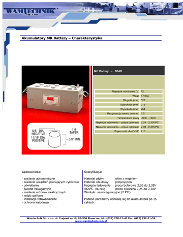 Akumulatory MK Battery – Charakterystyka MK Battery – 8G4D Napięcie nominalne (V) 12 Waga 57.6kg Długość (mm) 527 Szerokość (mm) 216 Wysokość (mm) 254 Rezystancja wewn. (mohm) 3.0 Temperatura pracy -60°C - +60°C Napiecie ładowania – praca buforowa 2.25 - 2.30VPC Napiecie ładowania – praca cykliczna 2.30 - 2.35VPC Pojemność dla C/100 210 Zastosowania: Specyfikacja: - Materiał płyty: ołów z wapniem Materiał obudowy: polipropylen Napięcie ładowania praca buforowa 2,30 do 2,35V @20oC na celę praca cykliczna 2,25 do 2,30V Wentyle: samoregulacyjne (2 PSI) zasilanie autonomiczne zasilanie urządzeń pracujących cyklicznie oświetlenie światła nawigacyjne zasilanie wózków elektrycznych wózki golfowe instalacje fotowoltaiczne ochrona katodowa Podane parametry odnoszą się do akumulatora po 15 cyklach. Wamtechnik Sp. z o.o. ul. Czajewicza 19, 05-500 Piaseczno tel.: (022) 750-21-42 Fax: (022) 750-21-39 www.wamtechnik.com.pl