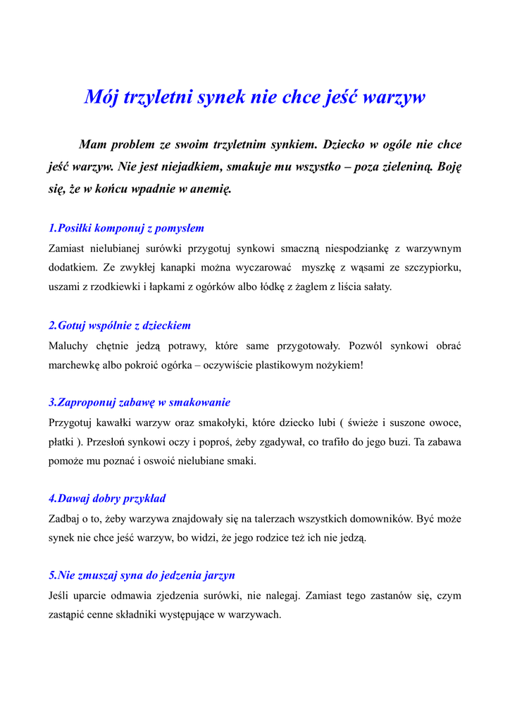 Mój trzyletni synek nie chce jeść warzyw Mam problem ze swoim trzyletnim synkiem. Dziecko w ogóle nie chce jeść warzyw. Nie jest niejadkiem, smakuje mu wszystko – poza zieleniną. Boję się, Ŝe w końcu wpadnie w anemię. 1.Posiłki komponuj z pomysłem Zamiast nielubianej surówki przygotuj synkowi smaczną niespodziankę z warzywnym dodatkiem. Ze zwykłej kanapki moŜna wyczarować myszkę z wąsami ze szczypiorku, uszami z rzodkiewki i łapkami z ogórków albo łódkę z Ŝaglem z liścia sałaty. 2.Gotuj wspólnie z dzieckiem Maluchy chętnie jedzą potrawy, które same przygotowały. Pozwól synkowi obrać marchewkę albo pokroić ogórka – oczywiście plastikowym noŜykiem! 3.Zaproponuj zabawę w smakowanie Przygotuj kawałki warzyw oraz smakołyki, które dziecko lubi ( świeŜe i suszone owoce, płatki ). Przesłoń synkowi oczy i poproś, Ŝeby zgadywał, co trafiło do jego buzi. Ta zabawa pomoŜe mu poznać i oswoić nielubiane smaki. 4.Dawaj dobry przykład Zadbaj o to, Ŝeby warzywa znajdowały się na talerzach wszystkich domowników. Być moŜe synek nie chce jeść warzyw, bo widzi, Ŝe jego rodzice teŜ ich nie jedzą. 5.Nie zmuszaj syna do jedzenia jarzyn Jeśli uparcie odmawia zjedzenia surówki, nie nalegaj. Zamiast tego zastanów się, czym zastąpić cenne składniki występujące w warzywach.
