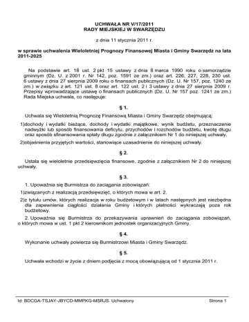 UCHWAŁA NR V/17/2011 RADY MIEJSKIEJ W SWARZĘDZU z dnia 11 stycznia 2011 r. w sprawie uchwalenia Wieloletniej Prognozy Finansowej Miasta i Gminy Swarzędz na lata 2011-2025 Na podstawie art. 18 ust. 2 pkt 15 ustawy z dnia 8 marca 1990 roku o samorządzie gminnym (Dz. U. z 2001 r. Nr 142, poz. 1591 ze zm.) oraz art. 226, 227, 228, 230 ust. 6 ustawy z dnia 27 sierpnia 2009 roku o finansach publicznych (Dz. U. Nr 157, poz. 1240 ze zm.) w związku z art. 121 ust. 8 oraz art. 122 ust. 2 i 3 ustawy z dnia 27 sierpnia 2009 r. Przepisy wprowadzające ustawę o finansach publicznych (Dz. U. Nr 157 poz. 1241 ze zm.) Rada Miejska uchwala, co następuje: § 1. Uchwala się Wieloletnią Prognozę Finansową Miasta i Gminy Swarzędz obejmującą: 1)dochody i wydatki bieżące, dochody i wydatki majątkowe, wynik budżetu, przeznaczenie nadwyżki lub sposób finansowania deficytu, przychodów i rozchodów budżetu, kwotę długu oraz sposób sfinansowania spłaty długu zgodnie z załącznikiem Nr 1 do niniejszej uchwały, 2)objaśnienia przyjętych wartości, stanowiące uzasadnienie do niniejszej uchwały. § 2. Ustala się wieloletnie przedsięwzięcia finansowe, zgodnie z załącznikiem Nr 2 do niniejszej uchwały. § 3. 1. Upoważnia się Burmistrza do zaciągania zobowiązań: 1)związanych z realizacją przedsięwzięć, o których mowa w art. 2. 2)z tytułu umów, których realizacja w roku budżetowym i w latach następnych jest niezbędna dla zapewnienia ciągłości działania Gminy i których płatności wykraczają poza rok budżetowy. 2. Upoważnia się Burmistrza do przekazywania uprawnień do zaciągania zobowiązań, o których mowa w ust. 1 pkt 2 kierownikom jednostek organizacyjnych Gminy. § 4. Wykonanie uchwały powierza się Burmistrzowi Miasta i Gminy Swarzędz. § 5. Uchwała wchodzi w życie z dniem podjęcia z mocą obowiązującą od 1 stycznia 2011 r. Id: BDCGA-TSJAY-JBYCD-MMPKG-MSRJS. Uchwalony Strona 1 Uzasadnienie Objaśnienia wartości przyjętych w Wieloletniej Prognozie Finansowej na lata 2011-2015 dla Gminy Swarzędz. W Wieloletniej Prognozie Finansowej na lata 2011-2025 przyjęto wzrost ogólnych kwot dochodów i wydatków w latach 2011-2014 w oparciu o dane historyczne oraz założenia makroekonomiczne zawarte w wytycznych Ministerstwa Finansów na potrzeby wieloletnich prognoz jednostek samorządu terytorialnego. Od 2015 roku zarówno dochody jak i wydatki prognozowano biorąc pod uwagę wskaźniki zawarte w wytycznych Ministerstwa Finansów. Ponadto przy konstruowaniu prognozy wykorzystano wiedzę na temat strategii rozwoju Gminy, przeanalizowano realizowane przedsięwzięcia, prognozy, projekty i zadania oraz zebrano wiedzę na temat planowanych przedsięwzięć i przewidywanych ryzyk. W zakresie prognozowania długu Gminy, przeanalizowano umowy kredytowe, umowy na emisję obligacji i ich harmonogramy spłat, udzielone gwarancje i poręczenia oraz inne umowy przekraczające rok budżetowy. Przeprowadzono również symulację spłaty zadłużenia z uwzględnieniem tego, które jest planowane do zaciągnięcia w związku z już realizowanymi przedsięwzięciami. I. Dane historyczne Dane historyczne dotyczące podstawowych grup dochodów Gminy przedstawiono w załączniku do objaśnień w formie tabelarycznej i wykresów. II. Założenia makroekonomiczne Przyjęte przy konstruowaniu Wieloletniej Prognozy Finansowej: - średnioroczny wzrost PKB - 103,5% - średnioroczny wzrost cen towarów i usług - 2,6% - realny wzrost przeciętnego wynagrodzenia - 3,0% III. Objaśnienia przyjętych wartości 1)Dochody 1.1. Dochody bieżące Prognozując dochody bieżące w poszczególnych grupach dochodów istotnych dla Gminy, a więc: - podatki i opłaty lokalne - udziały w podatkach dochodowych - subwencje przyjęto przede wszystkim dane historyczne, z których wynika coroczny wzrost dochodów o około 10%, tj. średnio o około 8.000.000 zł. Ze względów ostrożnościowych do prognozy do roku 2015 przyjęto coroczny wzrost dochodów o kwotę 7.000.000 zł. W latach 2016-2018 coroczny wzrost dochodów zaplanowano w stałej wysokości 4.000.000 zł, natomiast w pozostałych latach w wysokości 2.000.000 zł. 1.2. Dochody majątkowe W zakresie dochodów majątkowych, dochody ze sprzedaży majątku wykazano jedynie do roku 2014, gdyż planowanie sprzedaży majątku poza powyższy okres obarczone jest zbyt dużym ryzykiem błędu. Według danych otrzymanych z Referatu Id: BDCGA-TSJAY-JBYCD-MMPKG-MSRJS. Uchwalony Strona 1 Geodezji i Nieruchomości do sprzedaży w wyżej wymienionym okresie przeznaczone są działki w Gruszczynie, Swarzędzu i Wierzonce, maski budowlane w Swarzędzu i w Gruszczynie oraz przekształcenie prawa wieczystego użytkowania gruntu przysługującego osobom fizycznym w prawo własności. Zaplanowane kwoty pochodzą z operatów szacunkowych znajdujących się w Referacie Geodezji i Nieruchomości. 2)Wydatki 2.1. Wydatki bieżące W ramach wydatków bieżących wyodrębniono: 1. wydatki na wynagrodzenia i składki od nich naliczane za lata 2011-2014 ze wszystkich tytułów. Do obliczenia wartości wyżej wymienionych wydatków zastosowano realny wskaźnik wzrostu wynagrodzeń w wysokości 3%. 2. wydatki związane z funkcjonowaniem organów jst do których zaliczono wydatki klasyfikowane w rozdziałach 75022 do 75023. W celu urealnienia wydatków w latach 2012-2014 zastosowano wskaźnik średniorocznego wzrostu cen towarów i usług konsumpcyjnych w wysokości 2,6%. 3. gwarancje i poręczenia udzielone przez Gminę w okresie od 1998 roku do 2025 roku obejmujące: - poręczenie udzielone Swarzędzkiemu Towarzystwu Budownictwa Społecznego na kwotę 900.000 zł, na okres kredytowania i spłaty kredytu wraz z odsetkami, tj. 22 lata i 1 miesiąc, z rezerwą rocznej spłaty odsetek od kredytu w wysokości 42.000 zł, wykazaną w załączniku nr 2 Wieloletniej Prognozy Finansowej poz. III. - cztery poręczenia z tytułu kredytów i pożyczek udzielonych przez banki