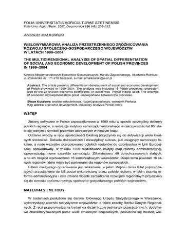 FOLIA UNIVERSITATIS AGRICULTURAE STETINENSIS Folia Univ. Agric. Stetin. 2007, Oeconomica 256 (48), 205–212 Arkadiusz MALKOWSKI WIELOWYMIAROWA ANALIZA PRZESTRZENNEGO ZRÓŻNICOWANIA ROZWOJU SPOŁECZNO-GOSPODARCZEGO WOJEWÓDZTW W LATACH 1999–2004 THE MULTIDIMENSIONAL ANALYSIS OF SPATIAL DIFFERENTIATION OF SOCIAL AND ECONOMIC DEVELOPMENT OF POLISH PROVINCES IN 1999–2004 Katedra Międzynarodowych Stosunków Gospodarczych i Handlu Zagranicznego, Akademia Rolnicza ul. Żołnierska 47, 71-210 Szczecin, e-mail: [email protected] Abstract. The article presents differentiation development of social and economic development of Polish provinces in 1999–2004. The analysis was included 16 Polish provinces, characterized by the 21 chosen economic coefficients. In audits was Perkal indeks used. The analysis of economic development show great disproportions between the provinces. Słowa kluczowe: analiza wskaźnikowa, rozwój gospodarczy, wskaźnik Perkala. Key words: economic development, indicatory analysis,Perkal index. WSTĘP Zmiany polityczne w Polsce zapoczątkowane w 1989 roku w sposób szczególny dotknęły polskich regionów, a restytucja instytucji samorządu terytorialnego w rzeczywistości lat 90. stała się jednym z symboli przemian ustrojowych w naszym kraju. Oddanie władzy w ręce społeczności lokalnej przyczyniło się do aktywizacji wielu lokalnych środowisk. Dekada doświadczeń i niewątpliwy sukces, jaki osiągnęły samorządy lokalne, a nade wszystko przygotowanie polskich regionów do członkostwa w Unii Europejskiej, spowodowały, iż w roku 1999 zrealizowano kolejny etap reformy administracyjnej, wprowadzając nowe szczeble samorządu. Zlikwidowano 49 dotychczasowych słabych, a na ich miejsce wprowadzono 16 samorządowych województw. Dzięki temu powstało 16 silnych regionów, które miały być partnerami dla regionów europejskich. Celem niniejszego opracowania jest wskazanie, w jakim stopniu okres 6 lat poprzedzających przystąpienie do UE został wykorzystany przez polskie regiony, w jakim stopniu reforma administracyjna i cała zmiana filozofii zarządzania rozwojem regionalnym przyczyniły się do wzrostu poziomu rozwoju społeczno-gospodarczego polskich województw. MATERIAŁY I METODY W badaniach posłużono się danymi Głównego Urzędu Statystycznego w Warszawie, wykorzystując roczniki statystyczne województw, a także zasoby Banku Danych Regionalnych. Z racji przeprowadzania badań na dużej liczbie jednostek przestrzennych, dodatkowo charakteryzowanych przez wiele zmiennych cząstkowych, posłużono się metodą wie- 206 A. Malkowski lowymiarowej analizy porównawczej, określaną w literaturze przedmiotu jako Z-scores (Smith 1972). W polskiej literaturze jest ona bliżej znana jako wskaźnik Perkala (Parysek i Wojtasiewicz 1979; Chojnicki i Czyż 1991; Sobala-Gwosdz 2004). Badaniami objęto dwa okresy. Do analiz wykorzystano dane pochodzące z roku 1999, które charakteryzowały obiekty badań w chwili ich powstania, a także dane z roku 2004 wskazujące na poziom rozwoju społeczno-gospodarczego polskich województw w chwili wejścia Polski do Unii Europejskiej. WYKORZYSTANIE WIELOWYMIAROWEJ ANALIZY PORÓWNAWCZEJ W BADANIACH REGIONALNYCH Problematyka badania i porównywania struktur gospodarczych w aspekcie przestrzennym stanowiła od dawna ważny kierunek badań ekonomicznych. Początki teorii ekonomicznej analizy przestrzennej sięgają początków XIX w., a formułowane teorie odzwierciedlają różne aspekty ekonomicznego rozwoju jednostek przestrzennych (Malina 2004). Ważnymi krokami na tej drodze były teorie lokalizacyjne von Thünena i Webera (1909), oraz geograficzne teorie ośrodków centralnych Christallera (1933) i Löscha (1961). Dzięki prowadzonym badaniom przestrzeni ekonomicznej stało się możliwe, w zakresie kształtowania podstaw rozwoju regionalnego, podejmowanie decyzji opartych na gruntownej wiedzy teoretycznej, popartej badaniami empirycznymi. Pozwoliło to na rozpatrywanie tego złożonego zagadnienia nie tylko w ujęciu statycznym, ale przede wszystkim dało szansę uchwycenia dynamicznych procesów ilościowych i jakościowych, które nierozerwalnie związane są z rozwojem społeczno-gospodarczym jednostek przestrzennych. Znalazło to swoje odzwierciedlenie w przejściu od klasycznych teorii wzrostu i rozwoju, poszukujących głównych czynników rozwoju w zasobach kapitału, pracy i ziemi, do nowych koncepcji podkreślających znaczenie niematerialnych czynników rozwoju. Przeprowadzona w 1999 roku w Polsce reforma administracyjna, oddająca wiele kompetencji, dotyczących kształtowania polityki regionalnej, władzom samorządowym, a także perspektywa pełnego członkostwa w UE spowodowały głębokie zmiany w podejściu do kształtowania koncepcji zarządzania rozwojem polskich regionów. W badaniach ekonomicznych więcej miejsca poświęcano problematyce zróżnicowania poziomu rozwoju gospodarczego gmin, powiatów i województw. Sprzyjały temu przeobrażenia polityki strukturalnej UE, w której wskazywano na istotną rolę regionów w budowaniu zintegrowanej przestrzeni europejskiej. Reforma pozwoliła wykreować silne województwa, które miały stać się podmiotem polityki regionalnej UE. Polskie regiony muszą być wystarczająco silne, by mogły prowadzić własną politykę rozwoju. Powinny także wykształcić konkurencyjne układy gospodarcze, także w kontekście międzynarodowym (Gorzelak i Jałowiecki 2000). Nowe spojrzenie na rolę silnych województw w polskiej i europejskiej przestrzeni ekonomicznej wskazuje na potrzebę prowadzenia badań empirycznych ujmujących problematykę rozwoju społeczno-gospodarczego. Do analiz tych coraz częściej wykorzystuje się wskaźniki syntetyczne, pozwalające na uchwycenie dynamiki procesów czasowo-przestrzennych. Jednym z najciekawszych nurtów badań nad rozwojem społeczno-gospodarczym w układach lokalnych i regionalnych Wielowymiarowa analiza przestrze