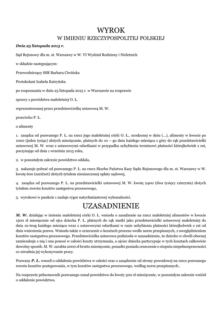 WYROK W IMIENIU RZECZYPOSPOLITEJ POLSKIEJ Dnia 25 listopada 2015 r. Sąd Rejonowy dla m. st. Warszawy w W. VI Wydział Rodzinny i Nieletnich w składzie następującym: Przewodniczący SSR Barbara Ciwińska Protokolant Izabela Katryńska po rozpoznaniu w dniu 25 listopada 2015 r. w Warszawie na rozprawie sprawy z powództwa małoletniej O. Ł. reprezentowanej przez przedstawicielkę ustawową M. W. przeciwko P. Ł. o alimenty 1. zasądza od pozwanego P. Ł. na rzecz jego małoletniej córki O. Ł., urodzonej w dniu (...), alimenty w kwocie po 1000 (jeden tysiąc) złotych miesięcznie, płatnych do 10 – go dnia każdego miesiąca z góry do rąk przedstawicielki ustawowej M. W. wraz z ustawowymi odsetkami w przypadku uchybienia terminowi płatności którejkolwiek z rat, poczynając od dnia 1 września 2015 roku, 2. w pozostałym zakresie powództwo oddala, 3. nakazuje pobrać od pozwanego P. Ł. na rzecz Skarbu Państwa Kasy Sądu Rejonowego dla m. st. Warszawy w W. kwotę 600 (sześćset) złotych tytułem nieuiszczonej opłaty sądowej, 4. zasądza od pozwanego P. Ł. na przedstawicielki ustawowej M. W. kwotę 2400 (dwa tysięcy czterysta) złotych tytułem zwrotu kosztów zastępstwa procesowego, 5. wyrokowi w punkcie 1 nadaje rygor natychmiastowej wykonalności. UZASADNIENIE M. W. działając w imieniu małoletniej córki O. Ł. wniosła o zasadzenie na rzecz małoletniej alimentów w kwocie 1500 zł miesięcznie od ojca dziecka P. Ł. płatnych do rąk matki jako przedstawicielki ustawowej małoletniej do dnia 10-teog każdego miesiąca wraz z ustawowymi odsetkami w razie uchybienia płatności którejkolwiek z rat od dnia wniesienia pozwu. Wniosła także o orzeczenie o kosztach procesu wedle norm przepisanych, z uwzględnieniem kosztów zastępstwa procesowego. Przedstawicielka ustawowa podniosła w uzasadnieniu, że dziecko w chwili obecnej zamieszkuje z nią i ona ponosi w całości koszty utrzymania, a ojciec dziecka partycypuje w tych kosztach całkowicie dowolny sposób. M. W. zarabia 2000 zł brutto miesięcznie, ponadto posiada orzeczenie o stopniu niepełnosprawności co utrudnia jej wykonywanie pracy. Pozwany P. Ł. wnosił o oddalenia powództwa w całości oraz o zasądzenie od strony powodowej na rzecz pozwanego zwrotu kosztów postępowania, w tym kosztów zastępstwa procesowego, według norm przepisanych.. Na rozprawie pełnomocnik pozwanego uznał powództwo do kwoty 500 zł miesięcznie, w pozostałym zakresie wniósł o oddalenie powództwa. Pełnomocnik pozwanego podniósł, że pozwany co miesiąc przekazuje na dziecko 400 zł, a jak widuje się z dzieckiem to zawsze kupuje jakieś prezenty. Pozwany zarabia około 4000 brutto miesięcznie, aktualnie mieszka z rodzicami i w związku z tym partycypuje w kosztach utrzymania lokalu. Sąd Rejonowy ustalił następujący stan faktyczny : Małoletnia O. Ł. ur. (...), ma dwa lata, jest córką M. W. i P. Ł. (odpis zupełny aktu urodzenia k. 3). Pozwany płacił na dziecko 400 miesięcznie od sierpnia 2015 roku (potwierdzenia przelewu k. 59-62). Powódka w uzasadnieniu do pozwu przedstawiła koszty utrzymania dziecka wyliczone na kwotę 2. 166 zł miesięcznie (k. 2). Koszty te wynoszą realnie około 1.700 złotych miesięcznie na co składają się ; 350 zł koszty mieszkaniowe, 400 zł koszty wyżywienia, 200 zł na ubrania i buty, 550 zł miesięcznie odpłatna opieka oraz 200 zł na dodatkowe wydatki taki jak leczenie, zabawki, rozrywka, wypoczynek czy inne potrzeby. M. W., lat 29, panna wykształcenie wyższe – ekonomia, pracuje jako specjalista ds. rozliczeń otrzymując wynagrodzenie 2000 zł brutto miesięcznie nadto pracuje na umowę zlecenia z której ostatnio otrzymała 1600 zł (umowa o prace na czas nieokreślony k.5-6) Ma orzeczony stopień niepełnosprawności lecz pracuje na pełny etat 7 godzin dziennie (orzeczenie o stopnie niepełnosprawności k.7-9). Dla małoletniej O. Ł., powódka opłaca opiekunkę 550 zł za miesiąc od poniedziałku do piątku. M. W. twierdzi, że stara się również o możliwość opieki żłobkowej. M. W. nie posiada własnego mieszkania, mieszka z dzieckiem w mieszkaniu jej mamy. Mieszkanie jest o powierzchni 48 mkw, a wszystkie opłaty to około 700 zł miesięcznie. M. W. spłaca kredyt zaciągnięty na zakup szafy, który spłaca po 150 zł gdzie pozostało jej 500 zł do jego spłaty. Pozwany P. Ł. ma 30 lat, kawaler, wykształcenie średnie, ukończył technikum samochodowe – technik mechanik, posiada prawo jazdy kat. B i C. Pozwany obecnie pracuje taksówkarzem na podstawie umowy o współpracy ( kopia umowy k. 57-58) od 2009 roku, jest zarejestrowany w (...) i jeździ samochodem marki T. (...) z 2015 roku. Pozwany ma własny samochód marki T. (...) z 2007 roku, cena rynkowa której wynosi około 20 tys. zł, który wykorzystują w celach prywatnych. Średni dochód pozwanego za ostatnie 6 miesięcy wynosi 3900 zł brutto, z czego 1092 zł idzie na składki ZUS i 22 zł na spłatę podatku na podstawie tzw. karty podatkowej (zaświadczenie o zarobkach k. 54, deklaracja o wysokości składki ZUS k. 55). Wcześniej pozwany pracował w S. T. na własnym samochodzie, ale zmienił prace bo jak twierdzi, nie było go stać na utrzymanie samochodu. Wynagrodzenie pozwanego jak on twierdzi, wynika ze stawki 9 zł za godzinę i prowizji uzależnionej od ilości oraz długości odbytych kursów z klientami. Pozwany twierdzi że wypracowuje miesięcznie ok. 300 godzin pracy i w związku z tym nie ma możliwości podjęcia dodatkowej pracy. Pozwany opłaca dwa kredyty konsumenckie po 100 zł za rower i stół który został zakupiony do mieszkania w którym mieszka małoletnia córka pozwanego wraz z powódką. Pozwany niema własnego mieszkania i obecnie mieszka z rodzicami w ich mieszkaniu o powierzchni około 70 mkw gdzie, jak twierdzi dokłada się do czynszu 623 zł łącznie z opłatą za garaż. Pozwany przyjeżdża do córki 3 razy w tygodniu i zabiera w soboty