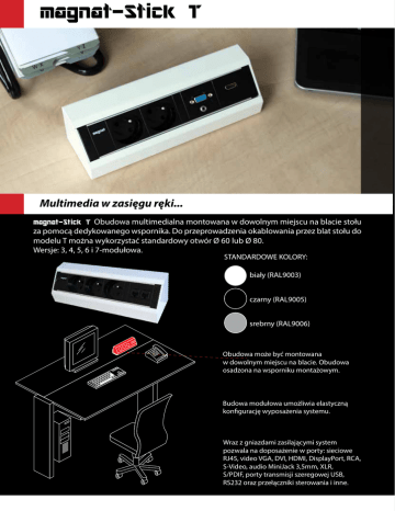 magnat-Stick T Multimedia w zasięgu ręki... magnat-Stick T Obudowa multimedialna montowana w dowolnym miejscu na blacie stołu za pomocą dedykowanego wspornika. Do przeprowadzenia okablowania przez blat stołu do modelu T można wykorzystać standardowy otwór Ø 60 lub Ø 80. Wersje: 3, 4, 5, 6 i 7-modułowa. STANDARDOWE KOLORY: biały (RAL9003) czarny (RAL9005) srebrny (RAL9006) Obudowa może być montowana w dowolnym miejscu na blacie. Obudowa osadzona na wsporniku montażowym. Budowa modułowa umożliwia elastyczną konfigurację wyposażenia systemu. Wraz z gniazdami zasilającymi system pozwala na doposażenie w porty: sieciowe RJ45, video VGA, DVI, HDMI, DisplayPort, RCA, S-Video, audio MiniJack 3,5mm, XLR, S/PDIF, porty transmisji szeregowej USB, RS232 oraz przełączniki sterowania i inne. długość (mm) 73 mm magnat 3 4 78 mm 2 78 mm 1 Wymiary wersji T (długość obudowy): Wersja 3-modułowa 4-modułowa 5-modułowa 6-modułowa 7-modułowa Długość 191 mm 234 mm 277 mm 320 mm 363 mm Dobór i konfiguracje wyposażenia w moduły zasilania oraz moduły multimedialne. Montaż wspornika do blatu za pomocą wkrętów do drewna. 1 Osadzenie obudowy na wsporniku montażowym. 2 Mocowanie obudowy do wspornika za pomocą śrub. 3 ver.20161008 MAXBERT s.c., ul. Krakowiaków 80/98, 02-255 Warszawa, tel. +48 22 490 38 38, www.maxbert.pl