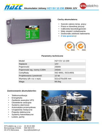 Akumulator żelowy HZY EV 12-230 230Ah 12V Cechy akumulatora: • • • • • • Szeroki zakres temp. pracy Praca w dowolnej pozycji Całkowita bezobsługowość Mały stopień rozładowania Doskonała zdolność ładowania 2 lata gwarancji Parametry techniczne Model HZY EV 12-230 Napięcie 12V Pojemność 230Ah Pojemność wg. normy C20hr 245Ah Certyfikaty ISO 9001, ISO14001 Projektowana żywotność 12 lat Wymiary (dł x sz x wys) 521x270x205 mm Waga 69,5kg Zastosowanie akumulatorów: • • • • • • • • • • Telekomunikacja Energetyka Zasilanie awaryjne UPS Oświetlenie awaryjne Systemy alarmowe Automatyka przemysłowa Urządzenia medyczne Pojazdy elektryczne Systemy fotowoltaiczne Łodzie, jachty STS elektro sp. z o.o. Borowskiego 2/310A 03-475 Warszawa 22 49 23 390 508 550 673 [email protected]
