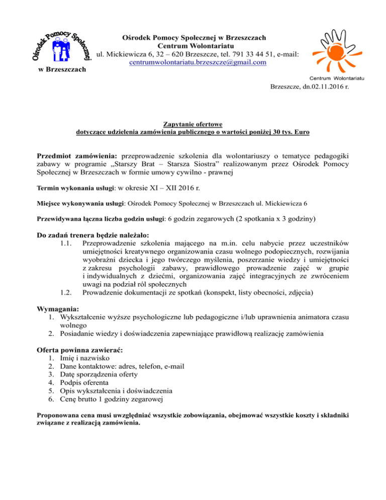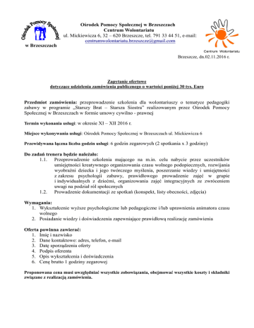 Ośrodek Pomocy Społecznej w Brzeszczach Centrum Wolontariatu ul. Mickiewicza 6, 32 – 620 Brzeszcze, tel. 791 33 44 51, e-mail: [email protected] w Brzeszczach Brzeszcze, dn.02.11.2016 r. Zapytanie ofertowe dotyczące udzielenia zamówienia publicznego o wartości poniżej 30 tys. Euro Przedmiot zamówienia: przeprowadzenie szkolenia dla wolontariuszy o tematyce pedagogiki zabawy w programie „Starszy Brat – Starsza Siostra” realizowanym przez Ośrodek Pomocy Społecznej w Brzeszczach w formie umowy cywilno - prawnej Termin wykonania usługi: w okresie XI – XII 2016 r. Miejsce wykonywania usługi: Ośrodek Pomocy Społecznej w Brzeszczach ul. Mickiewicza 6 Przewidywana łączna liczba godzin usługi: 6 godzin zegarowych (2 spotkania x 3 godziny) Do zadań trenera będzie należało: 1.1. Przeprowadzenie szkolenia mającego na m.in. celu nabycie przez uczestników umiejętności kreatywnego organizowania czasu wolnego podopiecznych, rozwijania wyobraźni dziecka i jego twórczego myślenia, poszerzanie wiedzy i umiejętności z zakresu psychologii zabawy, prawidłowego prowadzenie zajęć w grupie i indywidualnych z dziećmi, organizowania zajęć integracyjnych ze zwróceniem uwagi na podział ról społecznych 1.2. Prowadzenie dokumentacji ze spotkań (konspekt, listy obecności, zdjęcia) Wymagania: 1. Wykształcenie wyższe psychologiczne lub pedagogiczne i/lub uprawnienia animatora czasu wolnego 2. Posiadanie wiedzy i doświadczenia zapewniające prawidłową realizację zamówienia Oferta powinna zawierać: 1. Imię i nazwisko 2. Dane kontaktowe: adres, telefon, e-mail 3. Datę sporządzenia oferty 4. Podpis oferenta 5. Opis wykształcenia i doświadczenia 6. Cenę brutto 1 godziny zegarowej Proponowana cena musi uwzględniać wszystkie zobowiązania, obejmować wszystkie koszty i składniki związane z realizacją zamówienia. Kryteria wyboru ofert: 1. Oferty wybierane będą według poniższych kryteriów: a) cena brutto 1 godzinę – waga kryterium – 90 % , b) doświadczenie – waga kryterium -10% 2. Sposób obliczania ceny oferty zamawiający ustalił następująco : a) ofercie o najniższej cenie za 1 godzinę przyznana zostanie maksymalna ilość punktów (90), pozostałym zaś ofertom przyznana zostanie odpowiednia ilość punktów obliczona na podstawie następującego wzoru : najniższa cena ilość punktów oferty badanej = ----------------------------- x 90 cena w ofercie badanej b) ofertom zawierającym doświadczenie w przedmiocie zamówienia: - za zrealizowane 50 godzin zajęć zgodnych z przedmiotem zamówienia zostanie przyznane 5 pkt - za każde kolejne 10 godzin zostanie przyznany 1 pkt, jednak nie więcej niż 5 pkt Suma punktów za doświadczenie nie może przekroczyć 10 punktów. 3. Za najkorzystniejszą zostanie uznana oferta, która uzyska najwyższą łączną liczbę punktów wynikającą z oceny kryteriów wymienionych powyżej. Ośrodek zastrzega sobie prawo do unieważnienia postępowania na każdym jego etapie bez podania przyczyny, a także do pozostawienia postępowania bez wyboru oferty (również w przypadku, kiedy najkorzystniejsza oferta przekroczy wartość środków, które zamawiający zamierza przeznaczyć na wykonanie zamówienia). Ofertę należy złożyć w sekretariacie Ośrodka Pomocy Społecznej w Brzeszczach, ul. Mickiewicza 6 (pokój nr 4, II piętro) bądź na adres e-mail [email protected], do dnia 09.11.2016r. do godz.15.00 Załącznik nr 1 Oświadczenie Oświadczam, że: 1. Wyrażam zgodę na przetwarzanie danych osobowych1 w celu przeprowadzenia postępowania o udzielenie zamówienia, oświadczenie dotyczy również wyrażenia zgody na opublikowanie danych osobowych (imienia, nazwiska lub nazwy firmy oraz jej siedziby) oferenta wybranego do realizacji zamówienia, na stronie internetowej Ośrodka Pomocy Społecznej w Brzeszczach oraz na tablicy ogłoszeń w siedzibie Ośrodka. 2. Posiadam niezbędne uprawnienia (jeżeli przepisy prawa nakładają obowiązek ich posiadania), wiedzę i doświadczenie, niezbędne do wykonania zamówienia /dysponuję osobami zdolnymi do wykonania zamówienia (podkreślić właściwe). Data………………….. 1 Podpis………………….. Ustawa z dnia 29 sierpnia 1997r. o ochronie danych osobowych (tj. DZ.U z 2016r. poz.677) Załącznik nr 2 ………………………..……… Podmiot gospodarczy - pieczątka OŚWIADCZENIE Niniejszym oświadczam, że…………………………………………………….(nazwa firmy) z siedzibą w ……………………………………………(adres siedziby), nie zalega z płatnościami na rzecz podmiotów publicznych i prywatnych, a tym samym: nie zalega z opłacaniem podatków do US, nie zalega opłacaniem składek na ubezpieczenie zdrowotne i społeczne do ZUS, nie figuruje w Krajowym Rejestrze Długów. ……………………………………………………….… (data, pieczątka i podpis) Załącznik nr 3 Odpowiedź na zapytanie ofertowe Zamawiający: Ośrodek Pomocy Społecznej w Brzeszczach, ul. Mickiewicza 6 Przedmiot zamówienia: trening pedagogiki zabawy dla wolontariuszy w programie „Starszy Brat – Starsza Siostra” w 2016 r. Dane oferenta: ………………………………………………………………………………… ………………………………………………………………………………………………….. ………………………………………………………………………………………………….. Wykształcenie oferenta: ………………………… kierunek: ………………………………. Opis doświadczenia związanego z realizacją zadania (z podaniem miejsca i okresu realizacji zadania): …………………………………………………………………………………………………. …………………………………………………………………………………………………. ………………………