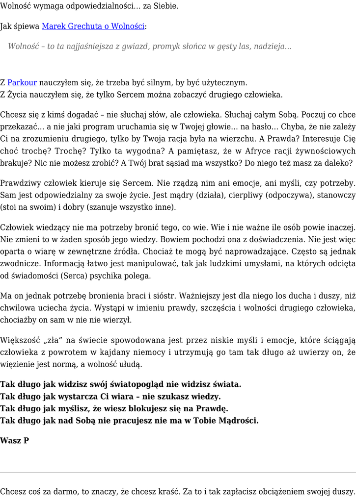 Wolność wymaga odpowiedzialności… za Siebie. Jak śpiewa Marek Grechuta o Wolności: Wolność – to ta najjaśniejsza z gwiazd, promyk słońca w gęsty las, nadzieja… Z Parkour nauczyłem się, że trzeba być silnym, by być użytecznym. Z Życia nauczyłem się, że tylko Sercem można zobaczyć drugiego człowieka. Chcesz się z kimś dogadać – nie słuchaj słów, ale człowieka. Słuchaj całym Sobą. Poczuj co chce przekazać… a nie jaki program uruchamia się w Twojej głowie… na hasło… Chyba, że nie zależy Ci na zrozumieniu drugiego, tylko by Twoja racja była na wierzchu. A Prawda? Interesuje Cię choć trochę? Trochę? Tylko ta wygodna? A pamiętasz, że w Afryce racji żywnościowych brakuje? Nic nie możesz zrobić? A Twój brat sąsiad ma wszystko? Do niego też masz za daleko? Prawdziwy człowiek kieruje się Sercem. Nie rządzą nim ani emocje, ani myśli, czy potrzeby. Sam jest odpowiedzialny za swoje życie. Jest mądry (działa), cierpliwy (odpoczywa), stanowczy (stoi na swoim) i dobry (szanuje wszystko inne). Człowiek wiedzący nie ma potrzeby bronić tego, co wie. Wie i nie ważne ile osób powie inaczej. Nie zmieni to w żaden sposób jego wiedzy. Bowiem pochodzi ona z doświadczenia. Nie jest więc oparta o wiarę w zewnętrzne źródła. Chociaż te mogą być naprowadzające. Często są jednak zwodnicze. Informacją łatwo jest manipulować, tak jak ludzkimi umysłami, na których odcięta od świadomości (Serca) psychika polega. Ma on jednak potrzebę bronienia braci i sióstr. Ważniejszy jest dla niego los ducha i duszy, niż chwilowa uciecha życia. Wystąpi w imieniu prawdy, szczęścia i wolności drugiego człowieka, chociażby on sam w nie nie wierzył. Większość „zła” na świecie spowodowana jest przez niskie myśli i emocje, które ściągają człowieka z powrotem w kajdany niemocy i utrzymują go tam tak długo aż uwierzy on, że więzienie jest normą, a wolność ułudą. Tak Tak Tak Tak długo długo długo długo jak jak jak jak widzisz swój światopogląd nie widzisz świata. wystarcza Ci wiara – nie szukasz wiedzy. myślisz, że wiesz blokujesz się na Prawdę. nad Sobą nie pracujesz nie ma w Tobie Mądrości. Wasz P Chcesz coś za darmo, to znaczy, że chcesz kraść. Za to i tak zapłacisz obciążeniem swojej duszy. Zdobywanie, tworzenie i pracowanie jest czymś pięknym. Niestety w tym świecie praca kojarzy się z czymś negatywnym. To jednak zrozumiałe. Z dużej części naszej pracy okrada się nas legalnie. Często też środowiska, w których się pracuje są szkodliwe i toksyczne. Nie tylko na poziomie fizycznym, ale także emocjonalnie. Stres, konkurencja i strach przed przełożonym są praktycznie normą… Można inaczej. Można poszukać lepszej pracy, można z dystansem podchodzić do obecnej. Można, ale… jak? Wymaga to pracy nad sobą. Nieważne co by się działo, to przecież Ciebie Ci nie zabiorą. Warto więc inwestować w Siebie. Warto zmienić swoją postawę i zaakceptować obecną sytuację. Popatrzeć na wszystko z dystansu i spokojnie podjąć decyzję. Coś lub ktoś Cię denerwuje? Siądź sobie spokojnie w domu – wejdź w radość, czyli zrób coś co przyniesie Ci uśmiech, poprawi humor. Następnie wyobraź sobie obiekt, który Cię denerwuje w krzywym zwierciadle. Dodaj mu skrzydła królika, kapelusz klauna, nogi węża, czy uszy ryby Po prostu zobacz go w inny sposób… Kiedy wystarczająco dobrze wypalisz w swojej głowie taki obraz – przypomnij go sobie w pracy, by nabrać dystansu do całej sytuacji. Ileż to roboty… Trzeba siąść i sobie coś wyobrazić… Już chyba łatwiej się nad Sobą użalać. Prawda? A jaka później satysfakcja… Pamiętaj też, że czasami ktoś nas denerwuje, bo widzimy w nim coś, co w nas się nam nie podoba, tylko nie chcemy się przed sobą do tego przyznać Wasz P Pracując nad sobą wiele razy zastanawiałem się jakim powinien być człowiek naprawdę dobry. Różne są opinie. Jedni powiedzą, że ma nastawiać drugi policzek, inni, że ma mieć twardy tyłek. Słyszy się, że dobry ma żyć w nędzy i ubóstwie, a bogactwo utożsamiane jest ze złem. Zgodzę się, że we wszystkim tym jest ziarno prawdy. Nie ma jednak czasu by je stamtąd wyłuskiwać. Znowu zwrócę się do Serca. Serce, serce powiedz przecie jakim człowiek ma być w świecie? Człowiek prawdziwy nie krzywdzi innych i nie ulega emocjom. Panuje nad swoimi ciałami, myślami i energiami. Popełnia błędy, ale zawsze je naprawia, bo jest świadom wszystkiego w czym bierze udział. Człowiek dobry widzi w innych przyjaciół i rodzinę. Przed zagubionymi ostrzega i broni innych. Jest aktywny, ale rozumie, że każdy ma prawo do błędów wynikające z prawa wolnej woli. Szanuje je, ale zawsze stanie w jego obronie. Skoro jest dobry, to walczy ze złem. Pleni niskie zachowania i wyraźnie wskazuje na błędy. Wręcz wytyka je palcami, zwłaszcza u Siebie. Dzięki temu świadomie pracuje nad Sobą i staje się doskonalszym jako człowiek. Dobry człowiek jest pracowity i uczciwą pracą swoich rąk zdobywa wszystko, czego potrzebuje. Nie wyręcza się innymi, ale w gronie przyjaciół pomaga jeśli może. Cierpliwie wskazuje drogi zagubionym, ale nie wyręcza ich w pracy. Rozumie, że okradanie innych z ich doświadczeń jest przestępstwem duchowym. Dobry człowiek jest szczery wobec siebie i innych. Jeśli nie chce o czymś mówić, to jasno to zaznacza. Nie ucieka się do kłamstwa, czy podstępu. Wspiera prawdę oceniając i rachując każdą sytuację. Nie osądza, bo wie, że każdy sam osądzi się gdy przyjdzie na to czas. Człowiek dobry kieruje się Sercem Wasz P … należy do umysłu i odciętej od świadomości psychiki. One są narzędziami człowieka. Jak często jednak nim rządzą… Słowo wyjaśnienia, co do używanych przeze mnie pojęć: Umysł jest programem. Można wiązać go z „gadzimi”, zwierzęcymi instynktami, więc egoizme