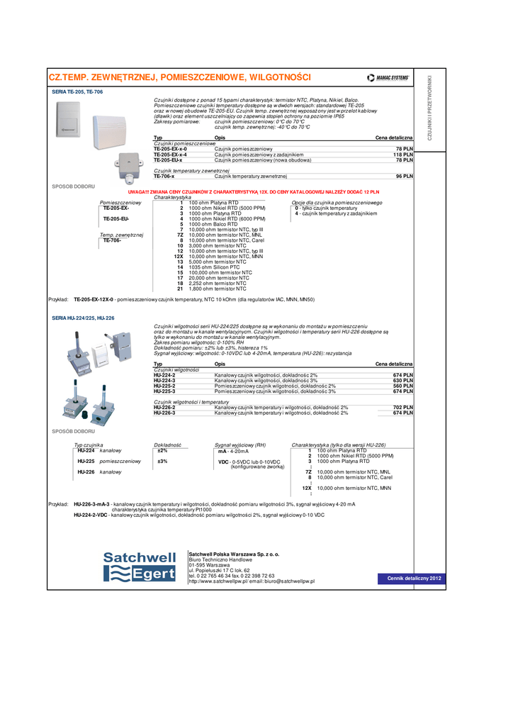 SERIA TE‐ 205, TE‐ 706 Czujniki dostępne z ponad 15 typami charakterystyk: termistor NTC, Platyna, Nikiel, Balco. Pomieszczeniowe czujniki temperatury dostępne są w dwóch wersjach: standardowej TE-205 oraz w nowej ob udowie TE-205-EU. Czujnik temp. zewnętrznej wyposażony jest w przelot kab lowy (dławik) oraz element uszczelniajcy co zapewnia stopień ochrony na poziomie IP65 Zakresy pomiarowe: czujnik pomieszczeniowy: 0°C do 70°C czujnik temp. zewnętrznej: -40°C do 70°C Typ Opis Czujniki pomieszczeniowe TE-205-EX-x-0 Czujnik pomieszczeniowy TE-205-EX-x-4 Czujnik pomieszczeniowy z zadajnikiem TE-205-EU-x Czujnik pomieszczeniowy (nowa obudowa) Cena detaliczna CZUJNIKI I PRZETWORNIKI CZ.TEMP. ZEWNĘTRZNEJ, POMIESZCZENIOWE, WILGOTNOŚCI 78 PLN 118 PLN 78 PLN Czujnik temperatury zewnetrznej TE-706-x Czujnik temperatury zewnetrznej 96 PLN SPOSÓB DOBORU UWAGA!!! ZMIANA CENY CZUJNIKÓW Z CHARAKTERYSTYKĄ 12X. DO CENY KATALOGOWEJ NALZEŻY DODAĆ 12 PLN Pomieszczeniowy TE-205-EXTE-205-EUTemp. zewnętrznej TE-706- Przykład: Charakterystyka 1 100 ohm Platyna RTD 2 1000 ohm Nikiel RTD (5000 PPM) 3 1000 ohm Platyna RTD 4 1000 ohm Nikiel RTD (6000 PPM) 5 1000 ohm Balco RTD 7 10,000 ohm termistor NTC, typ III 7Z 10,000 ohm termistor NTC, MNL 8 10,000 ohm termistor NTC, Carel 10 3,000 ohm termistor NTC 12 10,000 ohm termistor NTC, typ III 12X 10,000 ohm termistor NTC, MNN 13 5,000 ohm termistor NTC 14 1035 ohm Silicon PTC 15 100,000 ohm termistor NTC 17 20,000 ohm termistor NTC 18 2,252 ohm termistor NTC 21 1,800 ohm termistor NTC Opcje dla czujnika pomieszczeniowego 0 - tylko czujnik temperatury 4 - czujnik temperatury z zadajnikiem TE-205-EX-12X-0 - pomieszczeniowy czujnik temperatury, NTC 10 kOhm (dla regulatorów IAC, MNN, MN50) SERIA HU‐ 224/225, HU‐ 226 Czujniki wilgotności serii HU-224/225 dostępne są w wykonaniu do montażu w pomieszczeniu oraz do montażu w kanale wentylacyjnycm. Czujniki wilgotności i temperatury serii HU-226 dostępne są tylko w wykonaniu do montażu w kanale wentylacyjnym. Zakres pomiaru wilgotnośc: 0-100% RH Dokładność pomiaru: ±2% lub ±3%, histereza 1% Sygnał wyjściowy: wilgotność: 0-10VDC lub 4-20mA, temperatura (HU-226): rezystancja Typ Czujniki wilgotności HU-224-2 HU-224-3 HU-225-2 HU-225-3 Opis Cena detaliczna Kanałowy czujnik wilgotności, dokładnośc 2% Kanałowy czujnik wilgotności, dokładnośc 3% Pomieszczeniowy czujnik wilgotności, dokładnośc 2% Pomieszczeniowy czujnik wilgotności, dokładnośc 3% Czujnik wilgotności i temperatury HU-226-2 Kanałowy czujnik temperatury i wilgotności, dokładność 2% HU-226-3 Kanałowy czujnik temperatury i wilgotności, dokładność 2% 674 PLN 630 PLN 560 PLN 674 PLN 702 PLN 674 PLN SPOSÓB DOBORU Typ czujnika HU-224 kanałowy Przykład: HU-225 pomieszczeniowy HU-226 kanałowy Dokładność ±2% ±3% Sygnał wyjściowy (RH) mA - 4-20mA VDC - 0-5VDC lub 0-10VDC (konfigurowane zworką) Charakterystyka (tylko dla wersji HU-226) 1 100 ohm Platyna RTD 2 1000 ohm Nikiel RTD (5000 PPM) 3 1000 ohm Platyna RTD : 7Z 10,000 ohm termistor NTC, MNL 8 10,000 ohm termistor NTC, Carel : 12X 10,000 ohm termistor NTC, MNN : HU-226-3-mA-3 - kanałowy czujnik temperatury i wilgotności, dokładność pomiaru wilgotności 3%, sygnał wyjściowy 4-20 mA charakterystyka czujnika temperatury Pt1000 HU-224-2-VDC - kanałowy czujnik wilgotności, dokładność pomiaru wilgotności 2%, sygnał wyjściowy 0-10 VDC Satchwell Polska Warszawa Sp. z o. o. Biuro Techniczno Handlowe 01-595 Warszawa ul. Popiełuszki 17 C lok. 62 tel. 0 22 765 46 34 fax. 0 22 398 72 63 http://www.satchwellpw.pl/ email: [email protected] Cennik detaliczny 2012