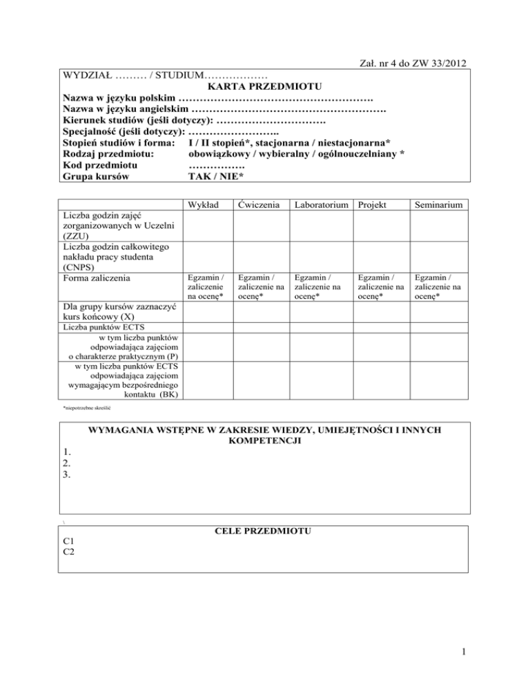 Zał. nr 4 do ZW 33/2012 WYDZIAŁ ……… / STUDIUM……………… KARTA PRZEDMIOTU Nazwa w języku polskim ………………………………………………. Nazwa w języku angielskim ………………………………………………. Kierunek studiów (jeśli dotyczy): …………………………. Specjalność (jeśli dotyczy): …………………….. Stopień studiów i forma: I / II stopień*, stacjonarna / niestacjonarna* Rodzaj przedmiotu: obowiązkowy / wybieralny / ogólnouczelniany * Kod przedmiotu ……………. Grupa kursów TAK / NIE* Liczba godzin zajęć zorganizowanych w Uczelni (ZZU) Liczba godzin całkowitego nakładu pracy studenta (CNPS) Forma zaliczenia Wykład Ćwiczenia Laboratorium Projekt Seminarium Egzamin / zaliczenie na ocenę* Egzamin / zaliczenie na ocenę* Egzamin / zaliczenie na ocenę* Egzamin / zaliczenie na ocenę* Egzamin / zaliczenie na ocenę* Dla grupy kursów zaznaczyć kurs końcowy (X) Liczba punktów ECTS w tym liczba punktów odpowiadająca zajęciom o charakterze praktycznym (P) w tym liczba punktów ECTS odpowiadająca zajęciom wymagającym bezpośredniego kontaktu (BK) *niepotrzebne skreślić WYMAGANIA WSTĘPNE W ZAKRESIE WIEDZY, UMIEJĘTNOŚCI I INNYCH KOMPETENCJI 1. 2. 3. \ CELE PRZEDMIOTU C1 C2 1 PRZEDMIOTOWE EFEKTY KSZTAŁCENIA Z zakresu wiedzy: PEK_W01 PEK_W02 … Z zakresu umiejętności: PEK_U01 PEK_U02 … Z zakresu kompetencji społecznych: PEK_K01 PEK_K02 TREŚCI PROGRAMOWE Forma zajęć - wykład Liczba godzin Wy1 Wy2 Wy3 Wy4 Wy5 …. Suma godzin Forma zajęć - ćwiczenia Liczba godzin Forma zajęć - laboratorium Liczba godzin Ćw1 Ćw2 Ćw3 Ćw4 .. Suma godzin La1 La2 La3 La4 La5 … Suma godzin Forma zajęć - projekt Liczba godzin Pr1 Pr2 Pr3 Pr4 … Suma godzin 2 Forma zajęć - seminarium Liczba godzin Se1 Se2 Se3 … Suma godzin STOSOWANE NARZĘDZIA DYDAKTYCZNE N1. N2. N3. OCENA OSIĄGNIĘCIA PRZEDMIOTOWYCH EFEKTÓW KSZTAŁCENIA Oceny (F – formująca (w trakcie semestru), P – podsumowująca (na koniec semestru) F1 F2 F3 Numer efektu kształcenia Sposób oceny osiągnięcia efektu kształcenia P LITERATURA PODSTAWOWA I UZUPEŁNIAJĄCA LITERATURA PODSTAWOWA: [1] [2] [3] [4] LITERATURA UZUPEŁNIAJĄCA: [1] [2] [3] OPIEKUN PRZEDMIOTU (IMIĘ, NAZWISKO, ADRES E-MAIL) 3 MACIERZ POWIĄZANIA EFEKTÓW KSZTAŁCENIA DLA PRZEDMIOTU …………………………… Z EFEKTAMI KSZTAŁCENIA NA KIERUNKU ……………………….. I SPECJALNOŚCI …………………………….. Przedmiotowy efekt kształcenia Odniesienie przedmiotowego efektu do efektów kształcenia zdefiniowanych dla kierunku studiów i specjalności (o ile dotyczy)** Cele przedmiotu*** Treści programowe*** PEK_W01 (wiedza) PEK_W02 … … PEK_U01 (umiejętności) PEK_U02 … PEK_K01 (kompetencje) PEK_K02 … ** - wpisać symbole kierunkowych/specjalnościowych efektów kształcenia *** - z tabeli powyżej Numer narzędzia dydaktycznego***