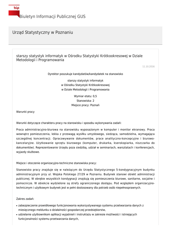 Biuletyn Informacji Publicznej GUS Urząd Statystyczny w Poznaniu starszy statystyk informatyk w Ośrodku Statystyki Krótkookresowej w Dziale Metodologii i Programowania 11.10.2016 Dyrektor poszukuje kandydatów/kandydatek na stanowisko starszy statystyk informatyk w Ośrodku Statystyki Krótkookresowej w Dziale Metodologii i Programowania Wymiar etatu: 0,5 Stanowiska: 2 Miejsce pracy: Poznań Warunki pracy Warunki dotyczące charakteru pracy na stanowisku i sposobu wykonywania zadań: Praca administracyjno-biurowa na stanowisku wyposażonym w komputer i monitor ekranowy. Praca wewnątrz pomieszczenia, lekka z przewagą wysiłku umysłowego, siedząca, samodzielna, wymagająca szczególnej koncentracji. Opracowywanie dokumentów, prace analityczno-koncepcyjne i biurowokancelaryjne. Użytkowanie sprzętu biurowego (komputer, drukarka, kserokopiarka, niszczarka do dokumentów). Reprezentowanie Urzędu poza siedzibą, udział w seminariach, warsztatach i konferencjach, wyjazdy służbowe. Miejsce i otoczenie organizacyjno-techniczne stanowiska pracy: Stanowisko pracy znajduje się w należącym do Urzędu Statystycznego 5-kondygnacyjnym budynku administracyjnym przy ul. Wojska Polskiego 27/29 w Poznaniu. Budynek stanowi obiekt administracji publicznej. W obrębie wszystkich kondygnacji znajdują się pomieszczenia biurowe, sanitarne, socjalne i pomocnicze. W obiekcie wydzielone są strefy ograniczonego dostępu. Pod względem organizacyjnotechnicznym i użytkowym budynek jest w pełni dostosowany dla potrzeb osób niepełnosprawnych. Zakres zadań: ● zabezpieczenie prawidłowego funkcjonowania wykorzystywanego systemu przetwarzania danych z miesięcznego meldunku o działalności gospodarczej przedsiębiorstw, ● udzielanie użytkownikom aplikacji wyjaśnień i instruktażu w zakresie możliwości i istniejących funkcjonalności systemu przetwarzania danych, ● współuczestniczenie w pracach projektowo- programistycznych dotyczących systemów pozyskania, przetwarzania i przechowywania danych dla statystyki krótkookresowej, uwzględniających nowe rozwiązania i technologie, ● obsługa istniejących baz danych oraz prace projektowe związane z tworzeniem nowych baz związanych ze specjalizacją Ośrodka, ● wsparcie informatyczne prac projektowo-programistycznych związanymi z opracowaniem i analizą wyników innych badań statystycznych w tym badań masowych. ● Wymagania niezbędne: ● wykształcenie: średnie ● znajomość języka angielskiego na poziomie komunikatywnym, ● znajomość języka SQL i zagadnień związanych z budową relacyjnych baz danych, ● podstawowa znajomość technologii informatycznych i języków programowania, ● podstawowa umiejętność projektowania i analizy, ● gotowość do samodzielnego oraz zespołowego rozszerzania kompetencji wymaganych w realizowanych projektach, ● rzetelność, ● organizacja pracy i orientacja na osiąganie celów, ● wykorzystanie wiedzy i doskonalenie zawodowe, ● współpraca, ● komunikacja interpersonalna, ● komunikacja pisemna, ● posiadanie obywatelstwa polskiego, ● korzystanie z pełni praw publicznych, ● nieskazanie prawomocnym wyrokiem za umyślne przestępstwo lub umyśle przestępstwo skarbowe. Wymagania dodatkowe: ● wykształcenie wyższe profilowe (ekonomiczne/techniczne/ informatyczne), ● praktyczna znajomość jednego z czołowych silników RDBMS (np. Microsoft SQL Server, Oracle, Sybase), ● podstawowa znajomość architektury i zagadnień związanych z hurtowniami danych, ● znajomość podstawowych zagadnień związanych ze statystyką publiczną, ● myślenie analityczne ● kreatywność. Dokumenty i oświadczenia niezbędne: ● życiorys/CV i list motywacyjny, ● kopie dokumentów potwierdzających spełnienie wymagania niezbędnego w zakresie wykształcenia, ● oświadczenie o posiadaniu obywatelstwa polskiego albo kopia dokumentu potwierdzającego posiadanie polskiego obywatelstwa, ● oświadczenie o wyrażeniu zgody na przetwarzanie danych osobowych do celów naboru, ● oświadczenie o korzystaniu z pełni praw publicznych, ● oświadczenie o nieskazaniu prawomocnym wyrokiem za umyślne przestępstwo lub umyślne przestępstwo skarbowe. Dokumenty i oświadczenia dodatkowe: kopie dokumentów potwierdzających spełnienie wymagania dodatkowego w zakresie wykształcenia. Terminy i miejsce składania dokumentów: ● dokumenty należy złożyć do: 28 października 2016 r. ● decyduje data: stempla pocztowego/osobistego dostarczenia oferty do urzędu ● miejsce składania dokumentów: Urząd Statystyczny w Poznaniu Sekretariat ul. Wojska Polskiego 27/29 60-624 Poznań koniecznie z dopiskiem - Oferta nr 12/2016 Inne informacje: W miesiącu poprzedzającym datę upublicznienia ogłoszenia wskaźnik zatrudnienia osób niepełnosprawnych w urzędzie, w rozumieniu przepisów o rehabilitacji zawodowej i społecznej oraz zatrudnianiu osób niepełnosprawnych wynosi co najmniej 6%. Kandydatki/kandydaci proszeni są o odniesienie się w liście motywacyjnym do spełniania wymagań niezbędnych i dodatkowych. List motywacyjny musi być opatrzone własnoręcznym podpisem a oświadczenia muszą być opatrzone datą i własnoręcznym podpisem. Prosimy o skorzystanie ze wzorów oświadczeń zamieszczonych na stronie: http://bip.stat.gov.pl/ogloszenia/wolne-stanowiska-pracy/urzad-statystyczny-w-poznaniu/ Kandydatki/kandydaci zakwalifikowani zostaną powiadomieni telefonicznie lub e-mailem o terminie postępowania rekrutacyjnego. Oferty kandydatek/kandydatów niezakwalifikowanych zostaną komisyjnie zniszczone po zakończeniu procedury naboru. Dodatkowe informacje można uzyskać pod nr tel. 61 27-98-267. Do składania dokumentów zachęcamy również osoby niepełnosprawne. Nasz urząd jest pracodawcą równych szans i wszystkie aplikacje są rozważane z równą uwagą bez względu na płeć, wiek, niepełnosprawność, rasę, narodowość, przekonania polityczne, przynależność