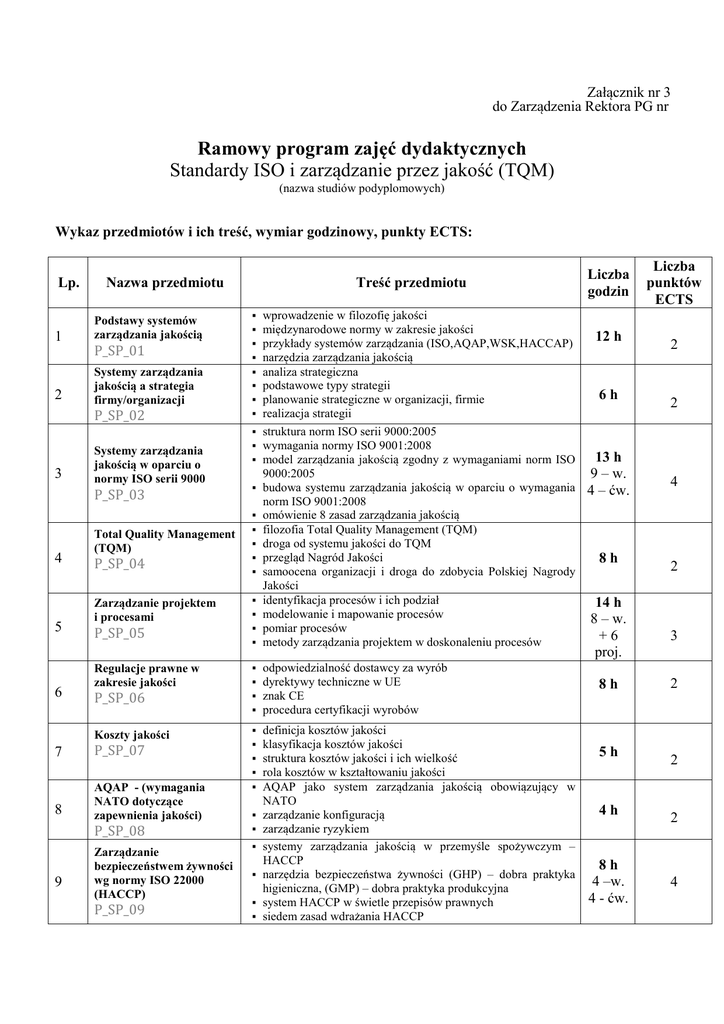 Ramowy program zajęć dydaktycznych Standardy ISO i zarządzanie