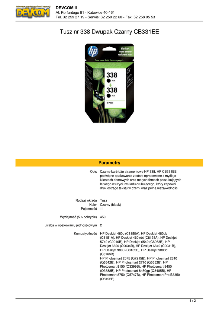 DEVCOM II Al. Korfantego 81 - Katowice 40-161 Tel. 32 259 27 19 - Serwis: 32 259 22 60 - Fax: 32 258 05 53 Tusz nr 338 Dwupak Czarny CB331EE Parametry Opis Czarne kartridże atramentowe HP 338, HP CB331EE podwójne opakowanie zostało opracowane z myślą o klientach domowych oraz małych firmach poszukujących łatwego w użyciu wkładu drukującego, który zapewni druk ostrego tekstu w czerni oraz pełną niezawodność. Rodzaj wkładu Tusz Kolor Czarny (black) Pojemność 11 Wydajność (5% pokrycie) 450 Liczba w opakowaniu jednostkowym 2 Kompatybilność HP Deskjet 460c (C8150A), HP Deskjet 460cb (C8151A), HP Deskjet 460wbt (C8153A), HP Deskjet 5740 (C9016B), HP Deskjet 6540 (C8963B), HP Deskjet 6620 (C9034B), HP Deskjet 6840 (C9031B), HP Deskjet 9800 (C8165B), HP Deskjet 9800d (C8166B) HP Photosmart 2575 (Q7215B), HP Photosmart 2610 (Q5542B), HP Photosmart 2710 (Q5552B), HP Photosmart 8150 (Q3399B), HP Photosmart 8450 (Q3388B), HP Photosmart 8450gp (Q3485B), HP Photosmart 8750 (Q5747B), HP Photosmart Pro B8350 (Q8492B) 1/2 DEVCOM II Al. Korfantego 81 - Katowice 40-161 Tel. 32 259 27 19 - Serwis: 32 259 22 60 - Fax: 32 258 05 53 HP Officejet 6210 (Q5801B), HP Officejet 7210 (Q5560B), HP Officejet 7310 (Q5562B), HP Officejet 7410 (Q5569B), HP Officejet H470 (CB026A), HP Officejet H470b (CB027A), HP Officejet H470wbt (CB028A), HP Officejet Pro K7100 (CB041B) HP PSC 1510 (Q5880B), HP PSC 1610 (Q5587B), HP PSC 2355 (Q5789B), HP PSC 2355p (Q5793B) 2/2 Powered by TCPDF (www.tcpdf.org)