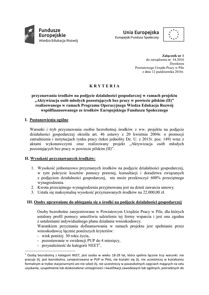 Załącznik nr 1 do zarządzenia nr 34.2016 Dyrektora Powiatowego Urzędu Pracy w Pile z dnia 12 października 2016r. KRYTERIA przyznawania środków na podjęcie działalności gospodarczej w ramach projektu ,,Aktywizacja osób młodych pozostających bez pracy w powiecie pilskim (II)” realizowanego w ramach Programu Operacyjnego Wiedza Edukacja Rozwój współfinansowanego ze środków Europejskiego Funduszu Społecznego I. Postanowienia ogólne Warunki i tryb przyznawania osobie bezrobotnej środków z ww. projektu na podjęcie działalności gospodarczej określa art. 46 ustawy z 20 kwietnia 2004r. o promocji zatrudnienia i instytucjach rynku pracy (tekst jednolity Dz. U. z 2015r. poz. 149) wraz z aktami wykonawczymi oraz realizowany projekt ,,Aktywizacja osób młodych pozostających bez pracy w powiecie pilskim (II)”. II. Wysokość przyznawanych środków: 1. Wysokość jednorazowo przyznanych środków na podjęcie działalności gospodarczej, w tym pokrycie kosztów pomocy prawnej, konsultacji i doradztwa związanych z podjęciem działalności gospodarczej, nie może przekroczyć 600% przeciętnego wynagrodzenia. 2. Kwota przeciętnego wynagrodzenia przyjmowana jest na dzień zawarcia umowy. 3. Ustala się maksymalną wysokość przyznawanych środków na 22.000,00 zł. III. Osoby uprawnione do ubiegania się o środki na podjęcie działalności gospodarczej Osoby bezrobotne zarejestrowane w Powiatowym Urzędzie Pracy w Pile, dla których ustalony profil pomocy umożliwia udzielenie tej formy wsparcia i jest ona zgodna z ustaleniami indywidualnego planu działania wnioskodawcy. Warunkiem przyznania dofinansowania w ramach projektu jest spełnianie przez wnioskodawcę łącznie poniższych kryteriów: - wiek poniżej 30 roku życia, - pozostawanie w ewidencji PUP do 4 miesięcy, - przynależność do kategorii NEET1, 1 Osobą bezrobotną z kategorii NEET, jest osoba w wieku 18-29 lat, która spełnia łącznie trzy warunki: nie pracuje (tj. jest bezrobotna, zarejestrowana w PUP w Pile), nie kształci się (tj. nie uczestniczy w kształceniu formalnym w trybie stacjonarnym) ani nie szkoli (tj. nie uczestniczy w pozaszkolnych zajęciach mających na celu uzyskanie, uzupełnienie lub doskonalenie umiejętności i kwalifikacji zawodowych lub ogólnych, potrzebnych do - udostępnienie danych teleadresowych oraz pozwalających na identyfikację ze względu na płeć, status na rynku pracy, wiek, wykształcenie i sytuację gospodarstwa domowego. Preferencje: 1. osoby bezrobotne zarejestrowane w PUP zamierzające podjąć działalność gospodarczą na terenie powiatu pilskiego, 2. bezrobotni, którzy nie porzucili pracy i nie zostali zwolnieni dyscyplinarnie w ostatnim zakładzie pracy, 3. osoby nieposiadające zadłużenia wobec Powiatowego Urzędu Pracy w Pile, 4. osoby, których współmałżonkowie pozostający we wspólnocie majątkowej nie realizują umowy przyznającej jednorazowo środki FP na podjęcie działalności gospodarczej lub umowy pożyczki z FP na podjęcie działalności gospodarczej, 5. osoby nie będące poręczycielami w realizowanych umowach zawartych ze Starostą jako organem zatrudnienia. Wyłączenia: osoby bezrobotne zarejestrowane w PUP w okresie zgłoszonego do ewidencji działalności gospodarczej zawieszenia wykonywania działalności gospodarczej. IV. Warunki, jakie muszą być spełnione przy ubieganiu się o przyznanie środków na podjęcie działalności gospodarczej 1. w okresie 12 miesięcy poprzedzających złożenie wniosku osoba bezrobotna: a) nie odmówiła – bez uzasadnionej przyczyny – przyjęcia propozycji odpowiedniej pracy lub innej formy pomocy określonej w ustawie z dnia 20 kwietnia 2004r. o promocji zatrudnienia i instytucjach rynku pracy oraz udziału w działaniach w ramach Programu Aktywizacja i Integracja o którym mowa w art. 62a ustawy, b) nie przerwała z własnej winy szkolenia, stażu, realizacji indywidualnego planu działania, udziału w działaniach w ramach Programu Aktywizacja i Integracja, o którym mowa w art. 62a ustawy, wykonywania prac społecznie użytecznych lub innej formy pomocy określonej w ustawie, c) po skierowaniu podjęła szkolenie, przygotowanie zawodowe dorosłych, staż, prace społecznie użyteczne lub inną formę pomocy określoną w ustawie, 2. niekorzystanie z bezzwrotnych środków Funduszu Pracy lub innych środków publicznych na podjęcie działalności gospodarczej lub rolniczej, założenie lub przystąpienie do spółdzielni socjalnej, 3. nieposiadanie wpisu do ewidencji działalności gospodarczej w okresie 12 miesięcy bezpośrednio poprzedzających dzień złożenia wniosku, , a w przypadku jego posiadania działalność została zakończona co najmniej przed upływem 12 miesięcy bezpośrednio poprzedzających dzień złożenia wniosku, 4. niepodejmowanie zatrudnienia w okresie 12 miesięcy od dnia rozpoczęcia prowadzenia działalności gospodarczej, wykonywania pracy, przy czym weryfikacji podlega fakt: czy brała ona udział w tego typu formie aktywizacji finansowanej ze środków publicznych, w okresie ostatnich 4 tygodni). 5. niekaralność w okresie 2 lat przed dniem złożenia wniosku za przestępstwa przeciwko obrotowi gospodarczemu, w rozumieniu ustawy z dnia 6 czerwca 1997 roku – Kodeks karny lub ustawy z dnia 28 października 2002 roku o odpowiedzialności podmiotów zbiorowych za czyny zabronione pod groźbą kary, 6. rezygnacja z możliwości zawieszenia prowadzenia działalności gospodarczej w okresie 12 miesięcy od dnia rozpoczęcia prowadzenia działalności gospodarczej, 7. niezłożenie wniosku do innego starosty o przyznanie środków na podjęcie działalności gospodarczej lub wniosku o przyznanie środków na założenie lub przystąpienie do spółdzielni socjalnej, 8. ekonomiczna opłacalność przedsięwzięcia wynikająca z biznesplanu, gwarantująca utrzymanie się na rynku przez wymagany – minimalny okres 12 miesięcy, 9. w przypadku ubiegania 