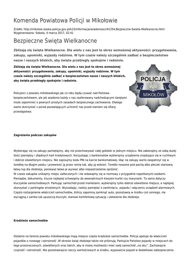 Komenda Powiatowa Policji w Mikołowie Źródło: http://mikolow.slaska.policja.gov.pl/k15/informacje/wiadomosci/41254,Bezpieczne-Swieta-Wielkanocne.html Wygenerowano: Sobota, 4 marca 2017, 02:41 Bezpieczne Święta Wielkanocne Zbliżają się święta Wielkanocne. Dla wielu z nas jest to okres wzmożonej aktywności: przygotowania, zakupy, upominki, wyjazdy rodzinne. W tym czasie należy szczególnie zadbać o bezpieczeństwo nasze i naszych bliskich, aby święta przebiegły spokojnie i radośnie. Zbliżają się święta Wielkanocne. Dla wielu z nas jest to okres wzmożonej aktywności: przygotowania, zakupy, upominki, wyjazdy rodzinne. W tym czasie należy szczególnie zadbać o bezpieczeństwo nasze i naszych bliskich, aby święta przebiegły spokojnie i radośnie. Policjanci z powiatu mikołowskiego jak co roku będą czuwać nad Państwa bezpieczeństwem, ale jak wiadomo każdy z nas zaaferowany nadchodzącymi świętami może zapomnieć o pewnych prostych zasadach bezpiecznego zachowania. Dlatego warto skorzystać z porad pozwalających uchronić nas przed staniem się ofiarą przestępstwa: Zagrożenia podczas zakupów Wybierając się na zakupy pamiętajmy, aby nie przechowywać całej gotówki w jednym miejscu. Nie zabierajmy ze sobą dużej ilości pieniędzy i zbędnych kart kredytowych. Korzystając z bankomatów wybierajmy urządzenia znajdujące się w ruchliwym i dobrze oświetlonym miejscu. Nie zapisujmy kodu PIN na karcie bankomatowej. Idąc na zakupy warto zaopatrzyć się w torebkę na długim pasku i przewiesić ją przez ramię tak, aby ją widzieć. Torebki noszone pod pachą albo plecaki stanowią łatwy łup dla złodzieja, ponieważ łatwo je wyrwać albo niepostrzeżenie opróżnić. W czasie zakupów unikajmy miejsc zatłoczonych i nie wdawajmy się w rozmowy z przygodnie napotkanymi osobami. Pieniądze, dokumenty, klucze najlepiej schowajmy do wewnętrznych kieszeni kurtki czy marynarki. To samo dotyczy kluczyków samochodowych. Parkując samochód przed marketami, wybierajmy tylko dobrze oświetlone miejsca, a najlepiej skorzystać z parkingów strzeżonych. Wysiadając, należy pamiętać o zamknięciu pojazdu i włączeniu urządzeń alarmowych. Często roztargnienie właścicieli samochodów, którzy zapomną zamknąć auto, pozostawią w środku coś cennego, nie wyciągną z zamka lub upuszczą kluczyki, stanowi komfortową sytuację i ułatwienie dla złodzieja. Kradzieże samochodów Ostatnio na terenie powiatu mikołowskiego mają miejsce częste kradzieże samochodów. Policja apeluje do właścicieli pojazdów o rozwagę i ostrożność .W okresie świąt złodzieje także nie próżnują. Parkujcie Państwo pojazdy w miejscach do tego przeznaczonych, oświetlonych oraz takich, aby w miarę możliwości mieć swój samochód „na oku”. Zachowajcie czujność i ostrożność. Nie pozostawiajcie rzeczy wartościowych w środku, wyposażcie pojazd w dodatkowe zabezpieczenia oraz nie zapominajcie o jego zamknięciu. Przestrzegamy też przed przypadkowym pozostawianiem dokumentów do pojazdu lub zapasowych kluczyków w samochodzie. O wszelkich budzących Państwa niepokój sytuacjach należy informować policję. Zakupy przez internet – uważajcie na oszustów Święta, to czas robienia upominków dla najbliższych. Współcześnie jednym z najszybszych i najwygodniejszych sposobów robienia zakupów są zakupy internetowe. Tu też nie dajmy się oszustom! Uważajmy na ,,super okazje". Nie zawsze to, co widoczne jest na zdjęciu musi być takie samo w rzeczywistości, lub nabyte przez sprzedawcę w sposób legalny. Przed przystąpieniem do zakupów internetowych należy sprawdzić wiarygodność sprzedawcy, jego poprzednie aukcje oraz opinie kupujących na jego temat. Opinia innych klientów jest dobrym źródłem informacji o rzetelności sprzedawcy. Z przelaniem pieniędzy w przypadku aukcji należy czekać do jej zakończenia. Sprawdźmy, czy sprzedawca umożliwia opłatę przy odbiorze - to również wskazuje na jego wiarygodność. Jeśli dostaliśmy maila z informacją o wygraniu aukcji, sprawdźmy czy wiadomość pochodzi od rzeczywistego sprzedawcy, zwłaszcza, gdy podany w niej jest nr konta, na który należy przelać należność. Gdy mamy wątpliwości nawiążmy korespondencję ze sprzedającym. W razie jakichkolwiek wątpliwości można skontaktować się z obsługą portalu aukcyjnego. Więcej o tym, jak ochronić się przed oszustwami internetowymi: http://www.zyjbezpiecznie.policja.pl/portal/zb/836/48715/Bezpieczne_zakupy_przez_Internet.html Uwaga na niezapowiedzianych „gości” W okresie przedświątecznym i w święta zdarza się, że odwiedzają nas różne osoby np. potrzebujące pomocy lub akwizytorzy. Wobec takich osób także należy zachować ostrożność. Nie powinniśmy wpuszczać ich, gdy jesteśmy sami w domu, a rozmowę z nimi prowadzić ostrożnie. Nigdy nie wiemy kim tak naprawdę jest osoba stojąca za drzwiami. Obcym nie powinniśmy także mówić o swoim życiu, najbliższych planach – szczególnie związanych z finansami lub wyjazdem. Niczego nie podpisujmy i nie przekazujmy jeżeli nie jesteśmy pewni, czy cokolwiek zamawialiśmy my lub ktoś z naszych bliskich. Należy dokładnie potwierdzić każdą taką sytuację, w szczególności, gdy mamy zamiar odbierać przesyłki czy podpisywać nieznane nam dokumenty. Jeśli mamy wątpliwości sprawdźmy, czy dana osoba jest tą, za którą się podaje, np. dzwoniąc do firmy, w której rzekomo pracuje. Niepokojące są także telefony od osób, które podając się za członka rodziny i usiłują podstępem wyłudzić od nas pieniądze. Wszelkie tego typu incydenty prosimy sygnalizować policji i w żadnym wypadku nie przekazywać gotówki obcym ludziom. W takich sytuacjach powinno się kierować rozsądkiem, a każdy przypadek należy potwierdzić kontaktując się z kimś z rodziny. Bezpiecznie w podróży Autobus, tramwaj, pociąg: Poruszając się tymi ś
