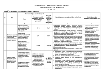 Sprawozdanie z wykonania planu działalności Sądu R e j o n o w e g o w Suwałkach za r o k 2 0 1 2 CZĘŚĆ A: Realizacja najważniejszych celów w roku 2012 Mierniki określające stopień realizacji celu Lp. Cel 1 2 1. 2. Zwiększanie sprawności postępowań sądowych oraz stopniowe ograniczanie poziomu zaległości sądowych Ułatwianie dostępu obywateli do wymiaru sprawiedliwości oraz wzmacnianie ochrony prawnej obywateli Nazwa Planowana wartość do osiągnięcia na koniec roku, którego dotyczy sprawozdanie 3 4 Osiągnięta wartość na koniec roku, którego dotyczy sprawozdanie 5 wskaźnik opanowania wpływu (odniesienie liczby spraw załatwionych przez sądy do liczby spraw wpływających) 100% 98,7% odsetek spraw rozpatrywanych przez sądy I instancji, w których czas trwania postępowania przekracza 12 miesięcy 0,8 % 3,68% średni czas trwania postępowania w sprawach cywilnych, karnych i gospodarczych (z wyłączeniem spraw wieczystoksięgowych i rejestrowych) (w miesiącach) 1,4 (m-ca) 1,37(m-ca) udział wniosków o wpis do rejestrów (NKW) składanych drogą elektroniczną w ogólnej liczbie składanych wniosków udział odpisów z rejestrów (NKW) wydanych drogą elektroniczną w ogólnej liczbie wydanych odpisów uzależniona od postępu prac wdrożeniowych projektu eusługi w zakresie rejestrów sądowych i terminu zakończenia prac legislacyjnych i wejścia w życie aktów wykonawczych wartość mierników będzie monitorowana od momentu uruchomienia e-usług. w 2012 r. nie określono i nie mierzono wartości mierników Najważniejsze planowane zadania służące realizacji celu Najważniejsze podjęte podzadania służące realizacji celu 6 1. Usprawnienie zarządzania sądem - sukcesywne wdrażanie pilotażowego programu modernizacji procesów zarządzania organizacją, w tym modernizacji pracy i modernizacji zarządzania kadrami. 2. Przyspieszenie postępowań karnych poprzez m.in. koncentrację postępowania dowodowego, redukcję liczby czynności procesowych, szersze korzystanie z możliwości art. 349 kpk oraz szersze korzystanie z metod konsensualnych. 3. Zwiększenie obszaru funkcjonowania systemu informatycznego obsługującego wydziały procesowe sądu (np. poprzez wdrożenie elektronicznego obiegu dokumentów, zastąpienie tradycyjnych urządzeń biurowych urządzeniami prowadzonymi przy wykorzystaniu systemu informatycznego). 4. Wdrożenie procedur usprawniających tok postępowań karnych, karnych wykonawczych, cywilnych i gospodarczych oraz pracy i ubezpieczeń społecznych - w miarę ich nowelizowania. 5. Badanie obciążenia pracą. 6. Promowanie zasad etycznego postępowania w bieżącej pracy jednostki. 1. Wprowadzenie e-usług w zakresie Ksiąg Wieczystych oraz elektronicznych form uiszczania opłat sądowych - w miarę postępu prac legislacyjnych i wdrożeniowych. 2. Promowanie alternatywnych metod rozwiązywania sporów. 3. Rozwijanie systemu wsparcia dla osób pokrzywdzonych przestępstwem. 4. Wprowadzanie w miarę możliwości prawnych nowego środka zapobiegawczego w postaci elektronicznie monitorowanego zakazu zbliżania się oskarżonego (podejrzanego) do pokrzywdzonego lub innej osoby. 5. Bieżąca aktualizacja strony internetowej oraz poszerzanie jej zawartości o informacje dotyczące funkcjonowania wymiaru sprawiedliwości. 7 1. Sukcesywnie wdrażano pilotażowy program modernizacji procesów zarządzania sądem. 2. Działalność orzecznicza - dążono do wydawana orzeczeń w rozsądnych terminach. 3.Zwiększenie obszaru funkcjonowania systemu informatycznego do obsługi wydziałów procesowych (w wydziałach zastąpiono tradycyjne urządzenia biurowe urządzeniami elektronicznymi). 4. Badano obciążenie pracą i w miarę potrzeb dokonywano alokacji orzeczników i urzędników. 5. Propagowano zasady etycznego postępowanie w bieżącej pracy. 1. Promowano alternatywne metody rozwiązywania metod oraz rozpowszechniano broszury informacyjne dotyczące mediacji w prawie karnym oraz w sprawach nieletnich. 2. Na bieżąco aktualizowano stronę internetową oraz poszerzano jej zawartość o informacje dotyczące funkcjonowania jednostki i wymiaru sprawiedliwości. CZĘŚĆ D: Informacja dotycząca realizacji celów objętych planem działalności na rok 2012 Zaplanowane poziomy mierników „wskaźnik opanowania wpływu" oraz „odsetek spraw rozpatrywanych przez sądy I instancji, w których czas trwania postępowania przekracza 12 miesięcy" nie zostały osiągnięty z uwagi na: - wydłużenie czasu sporządzania opinii przez biegłych w sprawach; - zwiększony wpływ spraw cywilnych, - obciążenie sędziów sprawami o skomplikowanym stanie faktycznym i prawnym, które wymagały prowadzenia obszernego postępowania dowodowego, - absencje chorobowe w grupie orzeczników. 18 marca 2013 r. data (podpisy kierownictwa jednostki)