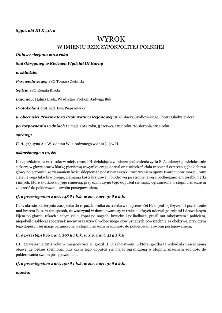 Sygn. akt III K 51/12 WYROK W IMIENIU RZECZYPOSPOLITEJ POLSKIEJ Dnia 27 sierpnia 2012 roku Sąd Okręgowy w Kielcach Wydział III Karny w składzie: Przewodniczący SSO Tomasz Zieliński Sędzia SSO Renata Broda Ławnicy: Halina Brela, Władysław Prokop, Jadwiga Buk Protokolant prot. sąd. Ewa Pieprzowska w obecności Prokuratora Prokuratury Rejonowej w. K. Jacka Szydłowskiego, Piotra Gładysiewicza po rozpoznaniu w dniach 14 maja 2012 roku, 5 czerwca 2012 roku, 20 sierpnia 2012 roku sprawy: F. A. (1), syna A. i W. z domu W., urodzonego w dniu (...) w H. oskarżonego o to, że: I. 17 października 2011 roku w miejscowości H. działając w zamiarze pozbawienia życia E. A. uderzył go wielokrotnie siekierą w głowę oraz w klatkę piersiową w wyniku czego doznał on uszkodzeń ciała w postaci czterech głębokich ran głowy połączonych ze złamaniem kości sklepienia i podstawy czaszki, rozerwaniem opony twardej oraz mózgu, rany ciętej lewego łuku brwiowego, złamania kości krzyżowej i biodrowej po stronie lewej z podbiegnięciem torebki nerki i innych, które skutkowały jego śmiercią, przy czym czynu tego dopuścił się mając ograniczoną w stopniu znacznym zdolność do pokierowania swoim postępowaniem, tj. o przestępstwo z art. 148 § 1 k.k. w zw. z art. 31 § 2 k.k. II. w okresie od sierpnia 2003 roku do 17 października 2011 roku w miejscowości H. znęcał się fizycznie i psychicznie nad bratem E. A. w ten sposób, że wszczynał w domu awantury w trakcie których uderzał go rękami i drewnianym kijem po głowie, rekach i całym ciele, kopał po nogach, brzuchu i pośladkach, groził mu zabójstwem i pobiciem, niepokoił i zakłócał spoczynek nocny oraz używał wobec niego słów uznanych powszechnie za obelżywe, przy czym tego dopuścił się mając ograniczoną w stopniu znacznym zdolność do pokierowania swoim postępowaniem, tj. o przestępstwo z art. 207 § 1 k.k. w zw. z art. 31 § 2 k.k. III. 22 września 2011 roku w miejscowości H. groził H. S. zabójstwem, u której groźba ta wzbudziła uzasadnioną obawę, że będzie spełniona, przy czym tego dopuścił się mając ograniczoną w stopniu znacznym zdolność do pokierowania swoim postępowaniem, tj. o przestępstwo z art. 190 § 1 k.k. w zw. z art. 31 § 2 k.k. orzeka: I. oskarżonego F. A. (1) uznaje za winnego popełnienia zarzucanego mu w punkcie I aktu oskarżenia czynu z tym, iż przyjmuje, że działał on w zamiarze bezpośrednim pozbawienia życia E. A., co stanowi przestępstwo z art. 148 § 1 kk w zw. z art. 31 § 2 kk i na podstawie tych przepisów, przyjmując za podstawę wymiaru kary przepis art. 148 § 1 kk skazuje oskarżonego F. A. (1) na karę 10 ( dziesięciu ) lat pozbawienia wolności; II. oskarżonego F. A. (1) uznaje za winnego popełnienia zarzucanego mu w punkcie II aktu oskarżenia czynu, stanowiącego przestępstwo z art. 207 § 1 kk w zw. z art. 31 § 2 kk i na podstawie tych przepisów, przyjmując za podstawę wymiaru kary przepis art. 207 § 1 kk skazuje oskarżonego F. A. (1) na karę 1 ( jednego) roku pozbawienia wolności; III. oskarżonego F. A. (1) uznaje za winnego popełnienia zarzucanego mu w punkcie III aktu oskarżenia czynu, stanowiącego przestępstwo z art. 190 § 1 kk w zw. z art. 31 § 2 kk i na podstawie tych przepisów, przyjmując za podstawę wymiaru kary przepis art. 190 § 1 kk skazuje oskarżonego F. A. (1) na karę 4 ( czterech ) miesięcy pozbawienia wolności; IV. na podstawie art. 85 kk i art. 86 § 1 kk orzeczone oskarżonemu F. A. (1) w punktach I, II i III wyroku kary pozbawienia wolności łączy i jako karę łączną wymierza oskarżonemu F. A. (1) karę 10 ( dziesięciu ) lat pozbawienia wolności; V. na podstawie art. 63 § 1 kk zalicza oskarżonemu F. A. (1) na poczet orzeczonej kary łącznej pozbawienia wolności okres jego tymczasowego aresztowania w sprawie od dnia 19 października 2011 roku; VI. na podstawie art. 44 § 2 kk orzeka przepadek na rzecz Skarbu Państwa dowodów rzeczowych w postaci siekiery oraz kołka, opisanych pod pozycjami 1 i 7 na karcie 225 akt sprawy; VII. zwalnia oskarżonego F. A. (1) od zapłaty na rzecz Skarbu Państwa kosztów sądowych; VIII. zasądza od Skarbu Państwa na rzecz adwokat A. K. kwotę 1.402,20 zł ( jeden tysiąc czterysta dwa złote dwadzieścia groszy), w tym kwotę 262,20 zł ( dwieście sześćdziesiąt dwa złote dwadzieścia groszy ) jako należny podatek VAT, tytułem zwrotu kosztów nieopłaconej pomocy prawnej udzielonej z urzędu oskarżonemu F. A. (1). Sygn. akt III K 51/12 UZASADNIENIE Sąd ustalił następujący stan faktyczny: F. A. (1) mieszkał wraz z bratem E. oraz niepełnosprawną umysłowo siostrą J. w drewnianym domu w miejscowości H.. Przeprowadził się tam pod koniec lat 90-ych z P., gdzie pracował jako górnik. W H. utrzymywał się z prac dorywczych w lesie. Natomiast E. A. pracował dorywczo jako cieśla. Stosunki między braćmi nie układały się najlepiej. Dochodziło między nimi do awantur, w trakcie których F. A. (1) znieważał E. A. słowami wulgarnymi. F. A. (1) miał pretensje do brata, że ten przychodząc do domu w stanie nietrzeźwym mówił do siebie coś niezrozumiale. Obaj bracia nadużywali alkoholu. Natomiast od śmierci w sierpniu 2003 roku trzeciego z braci A. – J., postępowanie F. A. (1) wobec E. A. stawało się coraz bardziej naganne i przybrało postać fizycznego i psychicznego znęcania się nad bratem. F. A. (1), najczęściej pod wpływem alkoholu, wszczynał awantury, podczas których bił E. A. rękami i kijem po głowie, rękach i całym ciele, kopał po nogach, brzuchu i pośladkach, groził mu zabójstwem i pobiciem, niepokoił i zakłócał spoczynek nocny oraz używał wobec niego słów uznanych powszechnie za obelżywe. E. A. nie bronił się przed biciem ze strony brata, jedynie raz, atakowany, uderzył go drewnem w głowę ( dowód: częściowo wyjaśnienia oskarżonego – k. 52-54, 110-113 t. I, k. 237-239 t
