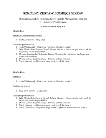 SZKOLNY ZESTAW PODRĘCZNIKÓW obowiązujących w Samorządowej Szkole Muzycznej I stopnia w Tarnowie Podgórnym w roku szkolnym 2014/2015 KLASA I c.6 Rytmika z kształceniem słuchu 1. Józef Karol Lasocki – Mały solfeż Materiały pomocnicze: 1. Anna Wacławczyk – Ćwiczenia rytmiczne dla dzieci zeszyt 1 2. Lidia Florek, Ilona Tomera-Chmiel, Tatiana Stachak – Nasza muzyka podręcznik do kształcenia słuchu i rytmiki kl.I 3. Urszula Smoczyńska-Nachtman, Renata Chrzanowska – Śpiewam słucham gram – podręcznik do klasy I 4. Dorota Gellner, Barbara Kolago –Piosenki zielonej półnutki 5. Maria Wacholc – solfeż elementarny –podręcznik dla klasy I KLASA II c.6 Rytmika 1. Anna Wacławczyk – Ćwiczenia rytmiczne dla dzieci zeszyt 2 Kształcenie słuchu 1. Józef Karol Lasocki – Mały solfeż Materiały pomocnicze: 1. Lidia Florek, Ilona Tomera-Chmiel, Tatiana Stachak – Nasza muzyka podręcznik do kształcenia słuchu i rytmiki kl.II 2. Dorota Gellner, Barbara Kolago –Piosenki zielonej półnutki 3. Maria Wacholc – solfeż elementarny –podręcznik dla klasy II 4. Maria Ćwiklińska, Małgorzata Rogozińska –Dyktanda elementarne dla klasy II KLASA III c.6 Rytmika 1. Anna Wacławczyk – Ćwiczenia rytmiczne dla dzieci zeszyt 2 i 3 Kształcenie słuchu 1. Józef Karol Lasocki – Mały solfeż Materiały pomocnicze: 1. Lidia Florek, Ilona Tomera-Chmiel, Tatiana Stachak – Nasza muzyka podręcznik do kształcenia słuchu i rytmiki kl.III 2. Dorota Gellner, Barbara Kolago –Piosenki zielonej półnutki 3. Maria Wacholc – solfeż elementarny –podręcznik dla klasy III 4. Maria Ćwiklińska, Małgorzata Rogozińska –Dyktanda elementarne dla klasy II i III KLASA IV c.6 Kształcenie słuchu 1. Maria Ćwiklińska, Małgorzata Rogozińska – Dyktanda elementarne dla klasy IV szkoły muzycznej I stopnia. Podręcznik dla nauczyciela 2. Maria Wacholc – Kształcenie poczucia tonalnego i słuchu harmonicznego w szkole muzycznej I stopnia. Podręcznik metodyczny dla nauczycieli, tom I i II. 3. Maria Wacholc –Solfeż elementarny, podręcznik dla klasy IV szkoły muzycznej I stopnia 4. Józef Karol Lasocki – Mały solfeż cz.I Audycje muzyczne 1. Agnieszka Kreiner-Bogdańska – „W krainie muzyki” Materiały pomocnicze: 1. Danuta Wójcik – „ABC form muzycznych” 2. Mieczysław Drobner – „Instrumentoznawstwo i akustyka” KLASA I c.4 Podstawy kształcenia słuchu 1. Maria Ćwiklińska, Małgorzata Rogozińska – Dyktanda elementarne dla klasy IV szkoły muzycznej I stopnia. Podręcznik dla nauczyciela 2. Maria Wacholc – Kształcenie poczucia tonalnego i słuchu harmonicznego w szkole muzycznej I stopnia. Podręcznik metodyczny dla nauczycieli, tom I i II. 3. Maria Wacholc –Solfeż elementarny, podręcznik dla klasy IV szkoły muzycznej I stopnia 4. Józef Karol Lasocki – Mały solfeż cz.I Zespół Materiały pomocnicze: 1. Jadwiga Focha – „Nasze muzykowanie” 2. Krystyna Stasńska – „120 lekcji muzyki” 3. Krzysztof Nowak, Ziemowit Pawlisz, Jerzy Reiser – „Wakacyjne piosenki” KLASA II c.4 Kształcenie słuchu 1. Maria Ćwiklińska, Małgorzata Rogozińska – Dyktanda elementarne dla klasy IV szkoły muzycznej I stopnia. Podręcznik dla nauczyciela 2. Maria Wacholc – Kształcenie poczucia tonalnego i słuchu harmonicznego w szkole muzycznej I stopnia. Podręcznik metodyczny dla nauczycieli, tom I i II. 3. Maria Wacholc –Solfeż elementarny, podręcznik dla klasy IV szkoły muzycznej I stopnia 4. Józef Karol Lasocki – Mały solfeż cz.I Audycje muzyczne 1. Agnieszka Kreiner-Bogdańska – „W krainie muzyki” Materiały pomocnicze: 1. Danuta Wójcik – „ABC form muzycznych” 2. Mieczysław Drobner – „Instrumentoznawstwo i akustyka” KLASA III c.4 Kształcenie słuchu 1. Maria Ćwiklińska, Małgorzata Rogozińska – Dyktanda elementarne dla klasy V szkoły muzycznej I stopnia. Podręcznik dla nauczyciela 2. Maria Wacholc – Kształcenie poczucia tonalnego i słuchu harmonicznego w szkole muzycznej I stopnia. Podręcznik metodyczny dla nauczycieli, tom I i II. 3. Maria Wacholc –Solfeż elementarny, podręcznik dla klasy V szkoły muzycznej I stopnia 4. Józef Karol Lasocki – Mały solfeż cz.I Audycje muzyczne 1. Agnieszka Kreiner-Bogdańska – „W krainie muzyki” Materiały pomocnicze: 2. Danuta Wójcik – „ABC form muzycznych” 3. Mieczysław Drobner – „Instrumentoznawstwo i akustyka” KLASA IV c.4 Kształcenie słuchu 1. Maria Ćwiklińska, Małgorzata Rogozińska – Dyktanda elementarne dla klasy V szkoły muzycznej I stopnia. Podręcznik dla nauczyciela 2. Maria Wacholc – Kształcenie poczucia tonalnego i słuchu harmonicznego w szkole muzycznej I stopnia. Podręcznik metodyczny dla nauczycieli, tom I i II. 3. Maria Wacholc –Solfeż elementarny, podręcznik dla klasy V szkoły muzycznej I stopnia 4. Józef Karol Lasocki – Solfeż cz.II Audycje muzyczne 1. Agnieszka Kreiner-Bogdańska – „W krainie muzyki” Materiały pomocnicze: 1. Danuta Wójcik – „ABC form muzycznych” 2. Mieczysław Drobner – „Instrumentoznawstwo i akustyka” Wyżej wymienione podręczniki są wykorzystywane na zajęciach. Nie jest wymagane posiadanie tych podręczników przez uczniów.