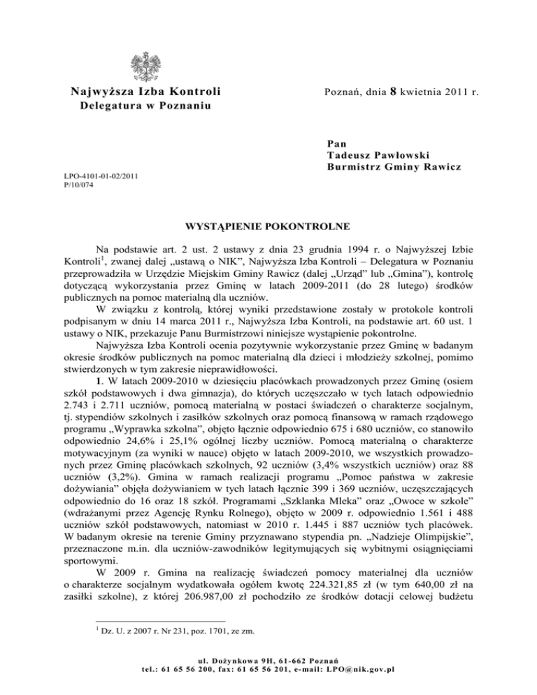 NajwyŜsza Izba Kontroli Poznań, dnia 8 kwietnia 2011 r. Delegatura w Poznaniu Pan Tadeusz Pawłowski Burmistrz Gminy Rawicz LPO-4101-01-02/2011 P/10/074 WYSTĄPIENIE POKONTROLNE Na podstawie art. 2 ust. 2 ustawy z dnia 23 grudnia 1994 r. o NajwyŜszej Izbie Kontroli1, zwanej dalej „ustawą o NIK”, NajwyŜsza Izba Kontroli – Delegatura w Poznaniu przeprowadziła w Urzędzie Miejskim Gminy Rawicz (dalej „Urząd” lub „Gmina”), kontrolę dotyczącą wykorzystania przez Gminę w latach 2009-2011 (do 28 lutego) środków publicznych na pomoc materialną dla uczniów. W związku z kontrolą, której wyniki przedstawione zostały w protokole kontroli podpisanym w dniu 14 marca 2011 r., NajwyŜsza Izba Kontroli, na podstawie art. 60 ust. 1 ustawy o NIK, przekazuje Panu Burmistrzowi niniejsze wystąpienie pokontrolne. NajwyŜsza Izba Kontroli ocenia pozytywnie wykorzystanie przez Gminę w badanym okresie środków publicznych na pomoc materialną dla dzieci i młodzieŜy szkolnej, pomimo stwierdzonych w tym zakresie nieprawidłowości. 1. W latach 2009-2010 w dziesięciu placówkach prowadzonych przez Gminę (osiem szkół podstawowych i dwa gimnazja), do których uczęszczało w tych latach odpowiednio 2.743 i 2.711 uczniów, pomocą materialną w postaci świadczeń o charakterze socjalnym, tj. stypendiów szkolnych i zasiłków szkolnych oraz pomocą finansową w ramach rządowego programu „Wyprawka szkolna”, objęto łącznie odpowiednio 675 i 680 uczniów, co stanowiło odpowiednio 24,6% i 25,1% ogólnej liczby uczniów. Pomocą materialną o charakterze motywacyjnym (za wyniki w nauce) objęto w latach 2009-2010, we wszystkich prowadzonych przez Gminę placówkach szkolnych, 92 uczniów (3,4% wszystkich uczniów) oraz 88 uczniów (3,2%). Gmina w ramach realizacji programu „Pomoc państwa w zakresie doŜywiania” objęła doŜywianiem w tych latach łącznie 399 i 369 uczniów, uczęszczających odpowiednio do 16 oraz 18 szkół. Programami „Szklanka Mleka” oraz „Owoce w szkole” (wdraŜanymi przez Agencję Rynku Rolnego), objęto w 2009 r. odpowiednio 1.561 i 488 uczniów szkół podstawowych, natomiast w 2010 r. 1.445 i 887 uczniów tych placówek. W badanym okresie na terenie Gminy przyznawano stypendia pn. „Nadzieje Olimpijskie”, przeznaczone m.in. dla uczniów-zawodników legitymujących się wybitnymi osiągnięciami sportowymi. W 2009 r. Gmina na realizację świadczeń pomocy materialnej dla uczniów o charakterze socjalnym wydatkowała ogółem kwotę 224.321,85 zł (w tym 640,00 zł na zasiłki szkolne), z której 206.987,00 zł pochodziło ze środków dotacji celowej budŜetu 1 Dz. U. z 2007 r. Nr 231, poz. 1701, ze zm. ul. DoŜy nkow a 9 H, 6 1-6 62 Poznań tel.: 61 65 56 200 , fax : 6 1 65 56 201, e- mail: [email protected] ov.pl państwa. Na realizację tego rodzaju świadczeń w 2010 r. wydatkowano ogółem kwotę 247.460,00 zł (w tym 910,00 zł na zasiłki szkolne), z której kwota 203.859,00 zł sfinansowana została ze środków dotacji celowej budŜetu państwa. Na pomoc stypendialną o charakterze motywacyjnym Gmina wydatkowała ze środków własnych w latach 2009-2010 odpowiednio 7.172,00 zł i 7.369,00 zł. Na realizację zadań związanych z udzielaniem uczniom pomocy finansowej na zakup podręczników w ramach rządowego programu „Wyprawka szkolna” Gmina, ze środków dotacji celowej budŜetu państwa, wydatkowała w tych latach odpowiednio 20.074,90 zł i 29.304,44 zł. 2. NIK ocenia pozytywnie realizację przez Gminę, w ramach programu „Wyprawka szkolna”, pomocy adresowanej do uczniów wskazanych w § 2 ust. 1 rozporządzenia Rady Ministrów z dnia 27 kwietnia 2009 r. w sprawie szczegółowych warunków udzielania pomocy finansowej uczniom na zakup podręczników2 oraz § 2 ust. 1 i 2 rozporządzenia Rady Ministrów z dnia 28 maja 2010 r. w sprawie szczegółowych warunków udzielania pomocy finansowej uczniom na zakup podręczników oraz wypłaty uczniom zasiłku powodziowego na cele edukacyjne3. Ponadto liczba uczniów, którym udzielona została w latach 2009-2010, pomoc w formie dofinansowania zakupu podręczników w trybie przyznanych świadczeń poza kryterium dochodowym, nie przekroczyła 10% ogólnej liczby uczniów w klasach, to jest zgodnie z odpowiednio § 2 ust. 3 i § 2 ust. 4 ww. rozporządzeń Rady Ministrów. Ponadto, NIK ocenia pozytywnie, zachowanie wymaganej, a określonej w art. 90r ust. 4 ustawy z dnia 7 września 1991 r. o systemie oświaty4, relacji kwot wydatkowanych przez Gminę w latach 2009-2010 na zasiłki szkolne, do wartości otrzymanych dotacji celowych. 3. Ustalenia kontroli wykazały, Ŝe treść obowiązujących w badanym okresie na terenie Gminy regulaminów udzielania pomocy materialnej o charakterze socjalnym dla uczniów zamieszkałych na terenie Gminy Rawicz, odpowiadała wymogom określonym w art. 90f ustawy z dnia 7 września 1991 r. o systemie oświaty. 4. NIK ocenia pozytywnie realizację w badanym okresie na terenie Gminy ponadszkolnego zadania edukacyjnego pn. „Wirtualna szkoła gminna”. Działania programu, opartego o wirtualne sale lekcyjne (humanistyczne, matematyczne, językowe, nauk ścisłych i religii), realizowanego w ramach programu profilaktycznego Miejsko-Gminnego Ośrodka Wsparcia, którego beneficjentami byli wszyscy uczniowie szkół podstawowych i gimnazjalnych, miały charakter kompleksowy i słuŜyły zapewnieniu wsparcia dla uczniów wszystkich prowadzonych przez Gminę placówek oświatowych. 5. NIK zwraca uwagę na naruszenie w 2010 r. przez Gminę art. 128 ust. 2 ustawy z dnia 27 sierpnia 2009 r. o finansach publicznych5, polegające na przekroczeniu o 2,38% maksymalnego udziału kwoty dofinansowania zadania własnego (80%). Udział zrealizowanych świadczeń pomocy materialnej o charakterze socjalnym dla uczniów (203.859,00 zł) w łącznych kosztach realizacji tego zadania (247.460,00 zł) wyniósł bowiem 82,38%. W rezultacie, Gmina pobrała dotacj