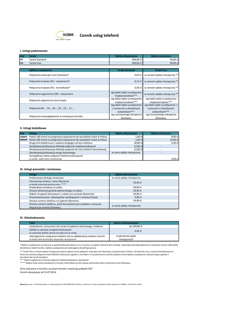 Cennik usług telefonii I. Usługi podstawowe Kod FST FFR Taryfa Taryfa Standard Taryfa Free Opłaty za połączenia Opłata aktywacyjna 299,00 zł 299,00 zł Taryfa Standard Opłata miesięczna 49,00 zł 99,00 zł Taryfa Free Połączenia wewnątrz sieci Dostawcy* 0,03 zł w ramach opłaty miesięcznej ** Połączenia krajowe (PL) - stacjonarne* 0,12 zł w ramach opłaty miesięcznej ** 0,59 zł w ramach opłaty miesięcznej ** Połączenia krajowe (PL) - komórkowe* Połączenia zagraniczne (DE) - stacjonarne Połączenia zagraniczne (inne kraje) Połączenia 80…, 70…, 64…, 39…,19…, 11…, Połączenia nieuwzględnione w niniejszym Cenniku wg tabeli opłat za połączenia międzynarodowe*** wg tabeli opłat za połączenia międzynarodowe*** wg tabeli opłat za połączenia z numerami o określonych wskaźnikach*** wg rzeczywistego obciążenia Dostawcy w ramach opłaty miesięcznej ** wg tabeli opłat za połączenia międzynarodowe*** wg tabeli opłat za połączenia z numerami o określonych wskaźnikach*** wg rzeczywistego obciążenia Dostawcy II. Usługi dodatkowe Kod Usługa 100MIN Pakiet 100 minut na połączenia stacjonarne do wszystkich miast w Polsce 200MIN Pakiet 200 minut na połączenia stacjonarne do wszystkich miast w Polsce Druga linii telefoniczna i nadanie drugiego numeru telefonu Dezaktywacja/aktywacja blokady połączeń międzynarodowych Dezaktywacja/aktywacja blokady połączeń do sieci telefonii komórkowej Dezaktywacja/aktywacja progu kwotowego Szczegółowy wykaz połączeń telekomunikacyjnych za sztukę - jeden okres rozliczeniowy Opłata aktywacyjna 1,00 zł 1,00 zł 20,00 zł 12,00 zł 12,00 zł w cenie opłaty miesięcznej - Opłata miesięczna 8,00 zł 14,00 zł 3,90 zł 4,90 zł III. Usługi pozostałe i serwisowe Usługa Podstawowa obsługa serwisowa Interwencja serwisu z winy Abonenta za każdą rozpoczętą godzinę pracy ***** Przebudowa Instalacji w Lokalu Zmiana lokalizacji gniazda abonenckiego w Lokalu Odbiór Urządzeń końcowych z Lokalu (na wniosek Abonenta) Przeniesienie praw i obowiązków wynikających z Umowy (Cesja) Zmiana numeru telefonu na żądanie Abonenta Zmiana numeru telefonu, jeżeli korzystanie jest uciążliwe z przyczyn leżących po stronie Dostawcy Opłata jednorazowa w cenie opłaty miesięcznej 59,90 zł 49,90 zł 59,90 zł 59,90 zł 4,90 zł 59,90 zł w cenie opłaty miesięcznej IV. Odszkodowania Tytuł Uszkodzenie, zniszczenie lub utrata Urządzenia końcowego, modemu Zwłoka w zwrocie Urządzeń końcowych za rozpoczęty tydzień, łącznie nie więcej niż za utratę Udostępnienie usług poza Lokalem lub za odpłatnością osobom trzecim za każdy Lokal do którego usługa była udostępniona Kwota odszkodowania do 299,00 zł 9,90 zł trzykrotność opłat miesięcznych * Opłaty za połączenia są naliczane w sposób jednosekundowy (1 s) co oznacza, że opłata naliczana jest za każdą rozpoczętą sekundę połączenia w wysokości równej 1/60 opłaty określonej w tabeli Cennika. Opłata za połączenie jest zaokrąglana do pełnego grosza. ** Taryfa Free w ramach opłaty miesięcznej zawiera pakiety minut połączeń: wewnątrz sieci Dostawcy, stacjonarnych w Polsce i do Niemiec oraz z sieciami komórkowymi w Polsce do wartości połączeń brutto 500,00 zł naliczanych zgodnie z Cennikiem. Po przekroczeniu wartości pakietu minut Opłaty za połączenia naliczane będą zgodnie z Cennikiem dla Taryfy Standard. *** Tabele znajdują się w Cenniku połączeń międzynarodowych i specjalnych ***** Opłata może zostać powiększona o koszty materiałowe (w tym zakupu elementów Sieci), poniesione przez Dostawcę. Ceny wskazane w Cenniku są cenami brutto i zawierają podatek VAT Cennik obowiązuje od 11.07.2016. Sileman sp. z o.o. 41-710 Ruda Śląska, ul. Dąbrowskiego 35, KRS 0000207875 (Sąd Rej. w Gliwicach, X Wydz. Gospodarczy KRS), kapitał zakł. 190000 zł, NIP 641-23-15-845
