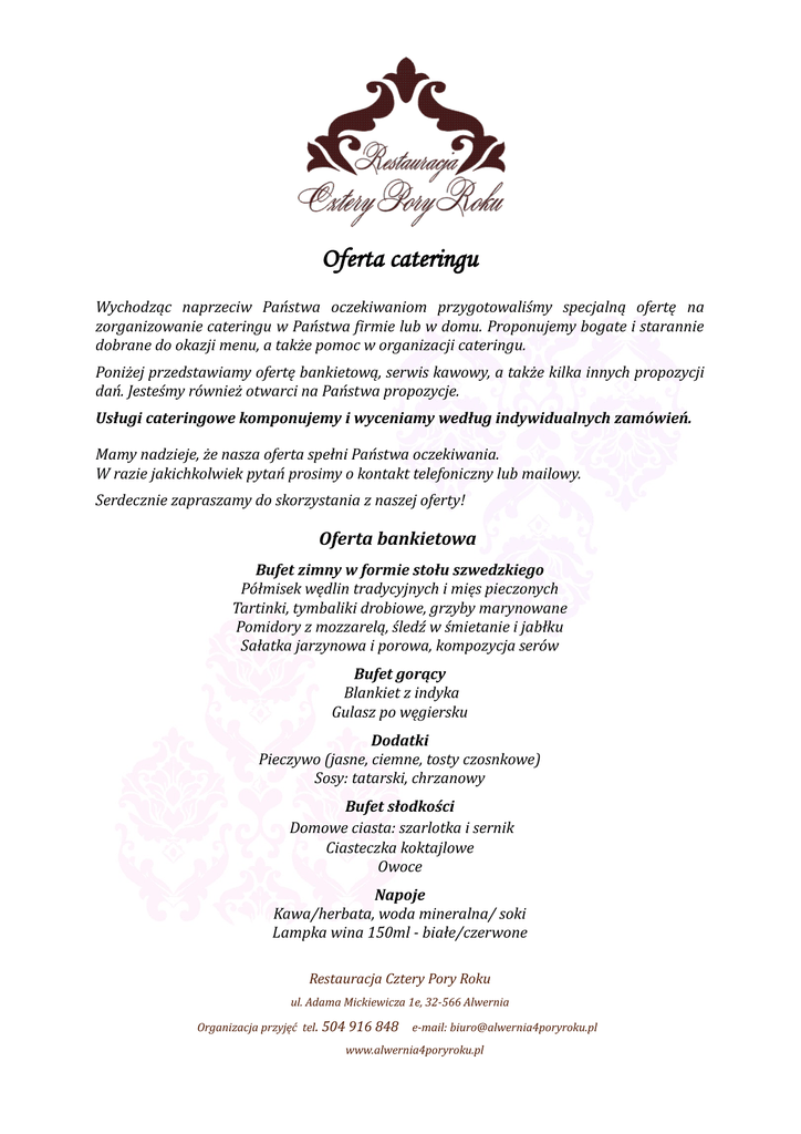 Oferta cateringu Wychodząc naprzeciw Państwa oczekiwaniom przygotowaliśmy specjalną ofertę na zorganizowanie cateringu w Państwa firmie lub w domu. Proponujemy bogate i starannie dobrane do okazji menu, a także pomoc w organizacji cateringu. Poniżej przedstawiamy ofertę bankietową, serwis kawowy, a także kilka innych propozycji dań. Jesteśmy również otwarci na Państwa propozycje. Usługi cateringowe komponujemy i wyceniamy według indywidualnych zamówień. Mamy nadzieje, że nasza oferta spełni Państwa oczekiwania. W razie jakichkolwiek pytań prosimy o kontakt telefoniczny lub mailowy. Serdecznie zapraszamy do skorzystania z naszej oferty! Oferta bankietowa Bufet zimny w formie stołu szwedzkiego Półmisek wędlin tradycyjnych i mięs pieczonych Tartinki, tymbaliki drobiowe, grzyby marynowane Pomidory z mozzarelą, śledź w śmietanie i jabłku Sałatka jarzynowa i porowa, kompozycja serów Bufet gorący Blankiet z indyka Gulasz po węgiersku Dodatki Pieczywo (jasne, ciemne, tosty czosnkowe) Sosy: tatarski, chrzanowy Bufet słodkości Domowe ciasta: szarlotka i sernik Ciasteczka koktajlowe Owoce Napoje Kawa/herbata, woda mineralna/ soki Lampka wina 150ml - białe/czerwone Restauracja Cztery Pory Roku ul. Adama Mickiewicza 1e, 32-566 Alwernia Organizacja przyjęć tel. 504 916 848 e-mail: [email protected] www.alwernia4poryroku.pl Serwis kawowy Propozycja 1) kawa/herbata soki/woda Propozycja 2) kawa/herbata soki/woda ciasteczka koktajlowe Propozycja 3) kawa/herbata soki/woda ciasteczka koktajlowe, owoce kanapeczki, tartinki Pozostałe propozycje dań w ramach cateringu Dania ciepłe Gulasz po węgiersku Blankiet z indyka Beef Stroganoff Bogracz Rolady mięsne Ryby w całości Przekąski zimne Sałatki: jarzynowa, porowa Tartinki Śledzie Półmiski z mięsami pieczonymi Deski serów Restauracja Cztery Pory Roku ul. Adama Mickiewicza 1e, 32-566 Alwernia Organizacja przyjęć tel. 504 916 848 e-mail: [email protected] www.alwernia4poryroku.pl