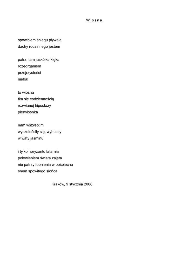 Wiosna spowiciem śniegu pływają dachy rodzinnego jestem patrz: tam jaskółka klęka rozedrganiem przejrzystości nieba! to wiosna tka się codziennością rozwianej hipostazy pierwiosnka nam wszystkim wyszeleściły się, wyhulały wiwaty jaśminu i tylko horyzontu latarnia połowieniem świata zajęta nie patrzy topnienia w pośpiechu snem spowitego słońca Kraków, 9 stycznia 2008