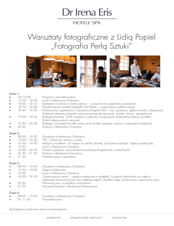 Warsztaty fotograficzne z Lidią Popiel „Fotografia Perłą Sztuki” Dzień 1 Od 14.00 13.00 – 16.00 18.00 – 18.10 18.10 – 18.40 18.40 – 19.20 19.20 – 19.50 19.50 – 20.30 20.30 Przyjazd i zakwaterowanie Lunch w Restauracji Oranżeria Spotkanie w salonie w Domu Leśnym — przywitanie uczestników warsztatów Przedstawienie sylwetki fotografki Lidii Popiel — prezentacja portfolio artystki Podstawowe zagadnienia z dziedziny fotografii (ISO, czas, przesłona, głębia ostrości, ekspozycja). Wybrane elementy fotografii zaawansowanej (kompozycja, światło, barwa, perspektywa). Rodzaje portretów. Punkt widzenia, wybór tła, kompozycja, budowanie nastroju światłem. Dobór odpowiednich ustawień. Rodzaje i znaczenie światła, praca przy świetle zastanym, praca w warunkach studyjnych Kolacja w Restauracji Oranżeria Dzień 2 08.00 10.00 10.30 14.00 16.00 20.30 21.30 Śniadanie w Restauracji Oranżeria YES – kobiecość ubrana w perły Relacje z modelem i ich wpływ na jakość portretu. Znaczenie stylizacji. Zajęcia praktyczne. Lunch w Restauracji Oranżeria Portret w praktyce. Indywidualne konsultacje fotograficzne z Lidią Popiel. Kolacja w Restauracji Oranżeria Pidżama party z aparatami Dzień 3 08.00 – 10.00 10.00 – 14.00 14.00 16.00 – 18.30 20.30 21.00 – 10.00 – 10.30 – 14.00 – 20.30 – 21.30 Dzień 4 08.00 – 10.00 Do 11.00 Śniadanie w Restauracji Oranżeria Zajęcia praktyczne Lunch w Restauracji Oranżeria „Dziewczyna z perłą” – zajęcia praktyczne z modelką. Fotografia doskonała czy zdjęcie doskonałe technicznie? Jak robić selekcję zdjęć? Obróbka zdjęć. Drukowanie wykonanych prac. Wernisaż prac uczestników warsztatów Uroczysta kolacja w Restauracji Romantyczna Śniadanie w Restauracji Oranżeria Wymeldowanie Zastrzegamy możliwość zmiany harmonogramu.