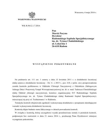 Warszawa, 4 maja 2016 r. WOJEWODA MAZOWIECKI WK-R.9612.1.7.2016 Pan Marek Pacyna Dyrektor Radomskiego Szpitala Specjalistycznego im. dr. Tytusa Chałubińskiego ul. Lekarska 1 26-610 Radom WYSTĄPIENIE POKONTROLNE Na podstawie art. 111 ust. 1 ustawy z dnia 15 kwietnia 2011 r. o działalności leczniczej (dalej ustawa o działalności leczniczej – Dz. U. z 2015 r., poz. 618, z późn. zm.) przeprowadzona została kontrola problemowa w Oddziale Chirurgii Naczyniowej z Odcinkiem Zabiegowym Jednego Dnia i Pracownią Terapii Wewnątrznaczyniowej im. dr. n. med. Tadeusza Chmielińskiego (dalej Oddział chirurgii naczyniowej), komórce organizacyjnej 015 Radomskiego Szpitala Specjalistycznego im. dr. Tytusa Chałubińskiego (dalej Radomski Szpital Specjalistyczny), mieszczącej się przy ul. Tochtermana 1 w Radomiu. Tematyka kontroli obejmowała zgodność wykonywanej działalności z przepisami określającymi warunki wykonywania działalności leczniczej. Kontrolą objęto badanie stanu faktycznego w dniach prowadzenia kontroli. W związku z kontrolą, której szczegółowe wyniki przedstawione zostały w protokole kontroli, podpisanym bez zastrzeżeń w dniu 21 marca 2016 r., przekazuję Panu Dyrektorowi niniejsze wystąpienie pokontrolne. W trakcie kontroli stwierdzono, że Oddział chirurgii naczyniowej dysponował 22 łóżkami – jak ustalono w księdze rejestrowej podmiotu leczniczego. W dokumentacji podmiotu zgromadzono dokumenty potwierdzające prawo wykonywania zawodu aktualnie zatrudnionej kadry lekarskiej i pielęgniarskiej. Podmiot posiadał umowę ubezpieczenia odpowiedzialności cywilnej, zgodnie z obowiązkiem ustalonym w art. 25 ust. 1 pkt 1 i ust. 2 ustawy o działalności leczniczej. W kontrolowanym oddziale umieszczono informację o prawach pacjenta, zgodnie z wymogiem określonym w art. 11 ust. 1 ustawy z dnia 6 listopada 2008 r. o prawach pacjenta i Rzeczniku Praw Pacjenta (Dz. U. z 2016 r., poz. 186). Radomski Szpital Specjalistyczny dysponował dokumentacją potwierdzającą sprawność techniczną aparatury i sprzętu medycznego wykorzystywanego przy udzielaniu świadczeń medycznych w Oddziale chirurgii naczyniowej, do której posiadania i okazania organowi kontroli podmiot jest zobowiązany na podstawie art. 90 ust. 6, 7 i 9 ustawy z dnia 20 maja 2010 r. o wyrobach medycznych (Dz. U. z 2015 r., poz. 876, z późn. zm.). Opracowane i wdrożone dla Oddziału chirurgii naczyniowej minimalne normy zatrudnienia pielęgniarek uwzględniały specyfikę oddziału oraz zostały określone zgodnie z normami ustalonymi w rozporządzeniu Ministra Zdrowia z dnia 28 grudnia 2012 r. w sprawie sposobu ustalania minimalnych norm zatrudnienia pielęgniarek i położnych w podmiotach leczniczych niebędących przedsiębiorcami (Dz. U. z 2012 r., poz. 1545). Pacjenci kontrolowanego oddziału zostali zaopatrzeni w znaki identyfikacyjne, zawierające informacje zapisane w sposób uniemożliwiający identyfikację pacjenta przez osoby nieuprawnione, zgodnie z wymogiem określonym w art. 36 ustawy o działalności leczniczej oraz w rozporządzeniu Ministra Zdrowia z dnia 20 września 2012 r. w sprawie warunków, sposobu i trybu zaopatrywania pacjentów szpitala w znaki identyfikacyjne oraz sposobu postępowania w razie stwierdzenia ich braku (dalej rozporządzenie w sprawie zaopatrywania pacjentów szpitala w znaki identyfikacyjne – Dz. U. z 2012 r., poz. 1098). Dokumentacja medyczna prowadzona i przechowywana była zgodnie z normami ustalonymi w rozporządzeniu Ministra Zdrowia z dnia 9 listopada 2015 r. w sprawie rodzajów, zakresu i wzorów dokumentacji medycznej oraz sposobu jej przetwarzania (Dz. U. z 2015 r., poz. 2069). Radomski Szpital Specjalistyczny posiada opracowany i złożony w rejestrze podmiotów wykonujących działalność leczniczą, obejmujący Oddział chirurgii naczyniowej, program dostosowania pomieszczeń do wymagań określonych w przepisach rozporządzenia Ministra Zdrowia z dnia 26 czerwca 2012 r. w sprawie szczegółowych wymagań, jakim powinny odpowiadać pomieszczenia i urządzenia podmiotu wykonującego działalność leczniczą (dalej rozporządzenie w sprawie szczegółowych wymagań, jakim powinny odpowiadać pomieszczenia i urządzenia podmiotu wykonującego działalność leczniczą – Dz. U. z 2012 r., poz. 739), 2 który został pozytywnie zaopiniowany przez Państwowego Powiatowego Inspektora Sanitarnego w Radomiu (decyzja z 15 listopada 2012 r., znak EPN/NHL.4241-18/OS/12). Program ten należy zrealizować do 31 grudnia 2017 r., zgodnie z obowiązkiem ustalonym w art. 207 ust. 1 ustawy o działalności leczniczej. W wyniku kontroli stwierdzono następujące nieprawidłowości: 1. Niezgłoszenie zmiany danych do rejestru podmiotów wykonujących działalność leczniczą w zakresie liczby miejsc pobytu dziennego oraz kodów resortowych charakteryzujących funkcje ochrony zdrowia, stanowiących część IX systemu resortowych kodów identyfikacyjnych, dla Oddziału chirurgii naczyniowej. Oddział nie dysponował miejscami pobytu dziennego oraz nie udzielał świadczeń w zakresie leczenia stacjonarnego jednego dnia i leczenia ambulatoryjnego, natomiast zgodnie z danymi zgłoszonymi do rejestru liczba miejsc pobytu dziennego powinna wynosić 1, a w oddziale powinny być świadczone usługi w ww. zakresie. Takie działanie stanowi naruszenie art. 107 ust. 1 ustawy o działalności leczniczej, zgodnie z którym wymienione dane podmiot leczniczy zobowiązany był zgłosić do organu rejestrowego w terminie 14 dni od daty powstania zmiany. Jak ustalono na podstawie treści księgi rejestrowej, podmiot zgłosił do organu prowadzącego rejestr ww. zmiany. Wobec powyższego odstępuje się od sformułowania zalecenia pokontrolnego. 2. Niespełnienie wymogów określonych w rozporządzeniu w sprawie szczegółowych wymagań, jakim powinny odpowiadać pomieszczenia i urządzenia podmiotu wykonującego działalność leczniczą, przez następujące pomiesz