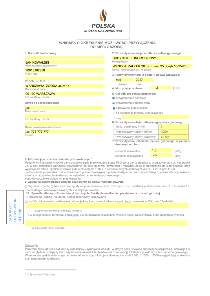 WNIOSEK O OKREŚLENIE MOŻLIWOŚCI PRZYŁĄCZENIA DO SIECI GAZOWEJ 1. Dane Wnioskodawcy: 2. Przewidywane miejsce odbioru paliwa gazowego: JAN KOWALSKI Rodzaj obiektu BUDYNEK JEDNORODZINNY Imię i nazwisko /Nazwa firmy WESOŁA, ZAUŁEK 28 dz. nr ew. 25 obręb 10-25-20 70010102356 Gmina, Miejscowość, ul., nr działki PESEL/ NIP 3. Przewidywany termin odbioru paliwa gazowego: REGON oraz PKD WARSZAWA, ZGODA 36 m 14 maj miesiąc 2017 rok Miejscowość, ulica 4. Moc przyłączeniowa: 3 00-100 WARSZAWA 5. Cel odbioru paliwa gazowego: Kod pocztowy, poczta ⃞ przygotowanie posiłków Adres do korespondencji ⃞ przygotowanie ciepłej wody j.w. ⃞ ogrzewanie pomieszczeń Miejscowość, ulica Kod pocztowy, poczta Osoba upoważniona do kontaktu: j.w. 777 777 777 Telefon [m3/h] ⃞ do technologii procesu produkcyjnego ⃞ inny 6. Przewidywana ilość odbieranego paliwa gazowego Maks. godzinowy [m3/h] 3 3 Przewidywany roczny [m /rok] 2000 Przewidywany roczny [kWh/rok] 19 900 7. Przewidywane ciśnienie paliwa gazowego w punkcie dostawy i odbioru: ciśnienie minimalne ciśnienie maksymalne 1,6 2,5 [kPa] ZAZNACZYĆ OODPOWIEDNI SPOSÓB [kPa] 8. Informacja o przetwarzaniu danych osobowych Podane w niniejszym wniosku dane osobowe będą przetwarzane przez PSG sp. z o.o. z siedzibą w Warszawie przy ul. Kasprzaka 25, w celu określenia warunków przyłączenia do sieci gazowej, zawierania i realizacji umów o przyłączenie do sieci gazowej oraz wystawiania faktur, zgodnie z ustawą z dnia 29 sierpnia 1997 r. o ochronie danych osobowych (Dz. U. z 2014 poz.1184). Jednocześnie potwierdzam, iż zostałem(am) poinformowany(a) o prawie dostępu do treści moich danych, prawie ich poprawiania, a także w przypadkach określonych w ustawie o ochronie danych osobowych, o prawie sprzeciwu wobec ich przetwarzania. 9. Zgoda na przetwarzanie danych osobowych do celów marketingowych. ⃞ Wyrażam zgodę, ⃞ Nie wyrażam zgody na przetwarzanie przez PSG sp. z o.o. z siedzibą w Warszawie przy ul. Kasprzaka 25, moich danych osobowych zawartych w niniejszym wniosku. 10. Sposób odbioru dokumentów dotyczących określenia możliwości przyłączenia do sieci gazowej: ⃞ przesłanie pocztą na adres korespondencyjny (list zwykły) ⃞ odbiór dokumentów możliwy jest tylko w jednostkach obsługi Klienta rozpatrujących wniosek w Oddziale / Zakładzie ( uzupełnia pracownik przyjmujący wniosek) ⃞ w innej jednostce terenowej znajdującej się na obszarze działalności Polskiej Spółki Gazownictwa, która rozpatruje wniosek (proszę podać adres jednostki) Załącznik Plan zabudowy lub szkic sytuacyjny określający usytuowanie obiektu, w którym będą używane przyłączane urządzenia, instalacje lub sieci, względem istniejącej sieci, usytuowanie sąsiednich obiektów oraz propozycję lokalizacji punktu wyjścia z systemu gazowego. Warunek ten spełnia m.in. mapa do celów informacyjnych lub opiniodawczych w skali 1:500, 1:1000, 1:2000 uwzględniająca aktualny stan rozgraniczenia działek. dotyczy osób fizycznych Wypełnia PSG sp. z o.o. Numer wniosku: Data złożenia wniosku: k Adnotacje służbowe PROSZĘ PODPISAĆ WNIOSEK czytelny podpis wnioskodawcy lub osób reprezentujących wnioskodawcę Miejscowość, data (pieczęć jednostki i czytelny podpis Przyjmującego)