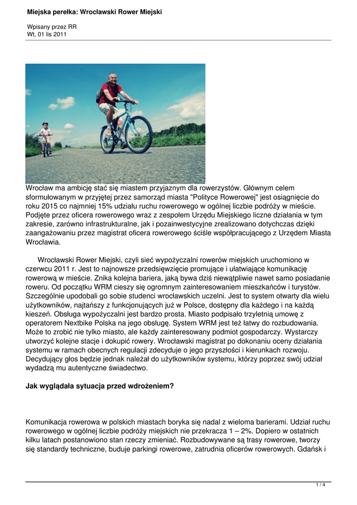 Miejska perełka: Wrocławski Rower Miejski Wpisany przez RR Wt, 01 lis 2011 Wrocław ma ambicję stać się miastem przyjaznym dla rowerzystów. Głównym celem sformułowanym w przyjętej przez samorząd miasta "Polityce Rowerowej" jest osiągnięcie do roku 2015 co najmniej 15% udziału ruchu rowerowego w ogólnej liczbie podróży w mieście. Podjęte przez oficera rowerowego wraz z zespołem Urzędu Miejskiego liczne działania w tym zakresie, zarówno infrastrukturalne, jak i pozainwestycyjne zrealizowano dotychczas dzięki zaangażowaniu przez magistrat oficera rowerowego ściśle współpracującego z Urzędem Miasta Wrocławia. Wrocławski Rower Miejski, czyli sieć wypożyczalni rowerów miejskich uruchomiono w czerwcu 2011 r. Jest to najnowsze przedsięwzięcie promujące i ułatwiające komunikację rowerową w mieście. Znika kolejna bariera, jaką bywa dziś niewątpliwie nawet samo posiadanie roweru. Od początku WRM cieszy się ogromnym zainteresowaniem mieszkańców i turystów. Szczególnie upodobali go sobie studenci wrocławskich uczelni. Jest to system otwarty dla wielu użytkowników, najtańszy z funkcjonujących już w Polsce, dostępny dla każdego i na każdą kieszeń. Obsługa wypożyczalni jest bardzo prosta. Miasto podpisało trzyletnią umowę z operatorem Nextbike Polska na jego obsługę. System WRM jest też łatwy do rozbudowania. Może to zrobić nie tylko miasto, ale każdy zainteresowany podmiot gospodarczy. Wystarczy utworzyć kolejne stacje i dokupić rowery. Wrocławski magistrat po dokonaniu oceny działania systemu w ramach obecnych regulacji zdecyduje o jego przyszłości i kierunkach rozwoju. Decydujący głos będzie jednak należał do użytkowników systemu, którzy poprzez swój udział wydadzą mu autentyczne świadectwo. Jak wyglądała sytuacja przed wdrożeniem? Komunikacja rowerowa w polskich miastach boryka się nadal z wieloma barierami. Udział ruchu rowerowego w ogólnej liczbie podróży miejskich nie przekracza 1 – 2%. Dopiero w ostatnich kilku latach postanowiono stan rzeczy zmieniać. Rozbudowywane są trasy rowerowe, tworzy się standardy techniczne, buduje parkingi rowerowe, zatrudnia oficerów rowerowych. Gdańsk i 1/4 Miejska perełka: Wrocławski Rower Miejski Wpisany przez RR Wt, 01 lis 2011 Wrocław to polscy liderzy zmian w tym zakresie. Instytucja roweru miejskiego tworzy nową jakość: żeby poruszać się po mieście rowerem, nie trzeba go już kupować lub przywozić do miasta. Wystarczy go po prostu wypożyczyć. Jakie działania podejmowano? 8 czerwca 2011 roku prezydent Wrocławia Rafał Dutkiewicz otworzył oficjalnie wypożyczalnię rowerów miejskich. Ruszył system Wrocławskich Rowerów Miejskich. Operatora systemu miasto wyłoniło w przetargu rozstrzygniętym klika miesięcy wcześniej. Jest nim firma Nextbike Polska, która zajmuje się pełną obsługą Wrocławskiego Roweru Miejskiego: jego utrzymaniem oraz serwisowaniem. System bezobsługowych wypożyczalni rowerów miejskich Nextbike działa w Niemczech, Austrii, Szwajcarii, Nowej Zelandii i na Łotwie. We Wrocławiu z założenia będzie czynny przez 9 miesięcy w roku od marca do listopada. Natomiast w praktyce rowery będą jeździły po mieście tak długo (lub tak szybko) jak pozwolą na to warunki atmosferyczne. W systemie dostępnych jest obecnie 125 rowerów w 17 stacjach. Miasto zakupiło 140 rowery, pozostałe są rezerwą na wypadek uszkodzenia lub kradzieży. Wrocławski Rower Miejski waży 14 kg, ma trzy przerzutki, hamulec ręczny i nożny, oświetlenie, dzwonek i koszyk. Jest wytrzymały, idealny na miejskie warunki, o grubszych kołach, mocnej damskiej ramie, wygodny w obsłudze. Żeby go wypożyczyć, trzeba się uprzednio zarejestrować w systemie i zapłacić symboliczną opłatę:1 zł (słownie: złotówkę). Zapłatę można uiścić internetowym przelewem, kartą kredytową bezpośrednio na stacji, a także (w drodze wyjątku) osobiście w Centrum Obsługi Klienta we wtorki między godziną 16 a 18. Przy wnoszeniu opłaty podajemy swoje dane adresowe. Umożliwi to ewentualne zidentyfikowanie osób, które niszczą lub zechcą przywłaszczyć sobie miejski rower. Operator udostępnił na swojej stronie internetowej www.nextbike.pl regulamin i proste zasady działania wypożyczalni. Rowerem miejskim można przemieszczać się tylko na terenie miasta. Maksymalny czas wypożyczenia to 12 godzin. Rowery można wypożyczyć i zwrócić w dowolnej stacji WRM (co ciekawe, nawet jeśli nie ma wolnego stojaka na rower, zaprojektowano specjalne stalowe uchwyty do przypięcia dodatkowych rowerów). Na sygnalizowane potrzeby i występujące problemy ma także reagować serwisant. Pierwsze 20 minut przy każdorazowym wypożyczeniu jest bezpłatne, następnie do godziny użytkowania cena wynosi 2 zł, a każda następna godzina to koszt 4 zł. W praktyce wpłacając 1 zł opłaty inicjalnej można jeździć na rowerach każdorazowo do 20 minut za darmo. Jednoślady 2/4 Miejska perełka: Wrocławski Rower Miejski Wpisany przez RR Wt, 01 lis 2011 można wypożyczyć m.in. na pl. Uniwersyteckim, przy Hali Targowej, Galerii Dominikańskiej, akademikach wrocławskich uczelni - Dwudziestolatce i tzw. tekach Politechniki. Stacje są rozmieszczone w takiej odległości, że między jedną a drugą można bez trudności przejechać w ciągu pierwszych bezpłatnych 20 minut. Jakie były koszty? System kosztował 1 mln 98 tys. zł. Środki wyłożyło miasto z własnego budżetu. Umowa z operatorem została podpisana do końca 2013 r. Po trzech latach miasto zdecyduje, czy przedłuży współpracę, czy też znajdzie nowego operatora. System stwarza możliwości rozbudowy o kolejne stacje i nowe rowery. Miasto traktuje umowę jako pilotażową. Eksploatacja systemu nie obciąża budżetu miasta, jest on finansowany z opłat użytkowników i z reklam umieszczonych na stacjach i rowerach. Całość przychodów wpływa do kasy miasta, a następnie przek