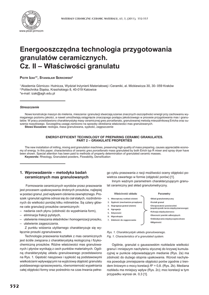 MATERIA£Y CERAMICZNE /CERAMIC MATERIALS/, 63, 3, (2011), 552-557 www.ptcer.pl/mccm EnergooszczĊdna technologia przygotowania granulatów ceramicznych. Cz. II – WáaĞciwoĞci granulatu PIOTR IZAK1*, STANISàAW SERKOWSKI2 Akademia Górniczo- Hutnicza, Wydziaá InĪynierii Materiaáowej i Ceramiki, al. Mickiewicza 30, 30- 059 Kraków Politechnika ĝląska, KrasiĔskiego 8, 40-019 Katowice *e-mail: [email protected] 1 2 Streszczenie Nowe konstrukcje maszyn do mielenia, mieszania i granulacji stwarzają szanse znacznych oszczĊdnoĞci energii przy zachowaniu wymaganego poziomu jakoĞci, a nawet umoĪliwiają osiągniĊcie znaczącego postĊpu jakoĞciowego w procesie przygotowania mas i granulatów. W pracy przedstawiono charakterystykĊ masy ceramicznej gres porcellanato, granulowanej metodą mieszalnikową Eiricha oraz suszenia rozpyáowego. Szczególną uwagĊ zwrócono na sposoby okreĞlania wáaĞciwoĞci mas granulowanych. Sáowa kluczowe: reologia, masa granulowana, sypkoĞü, zagĊszczenie ENERGY-EFFICIENT TECHNOLOGY OF PREPARING CERAMIC GRANULATES. PART 2 – GRANULATE PROPERTIES The new installation of milling, mixing and granulation machines, preserving high quality of mass preparing, causes appreciable economy of energy. In this paper, characteristics of ceramic gres porcellanato mass granulated by both Eirich typ R mixer and spray dryer have been shown. Special attention has been paid to methods of property determination of granulated ceramic masses. Keywords: Rheology, Granulated powders, Flowability, Densi¿cation 1. Wprowadzenie – metodyka badaĔ ceramicznych mas granulowanych Formowanie ceramicznych wyrobów przez prasowanie jest procesem upakowywania drobnych proszków, najlepiej w postaci granul, pod wpáywem ciĞnienia zewnĊtrznego. Proszek i granulat ogólnie odnosi siĊ do ciaá staáych, rozdrobnionych do wielkoĞci poniĪej kilku milimetrów. Są cztery gáówne cele granulacji proszków ceramicznych: – nadania cech páynu (zdolnoĞü do wypeániania form), – eliminacja frakcji pylistych, – uáatwienie mieszania skáadników i homogenizacji proszku, – uáatwienie zagĊszczania. Z punktu widzenia utylitarnego charakteryzuje siĊ wyáącznie proszki zgranulowane. Technologia prasowania ksztaátek z mas ceramicznych jest ĞciĞle związana z charakterystyką reologiczną i ¿zykochemiczną proszków. RóĪne wáaĞciwoĞci mas granulowanych i páynów wynikają z cech punktów materialnych. Ogólną charakterystykĊ ukáadu granulowanego przedstawiono na Rys. 1. GĊstoĞü nasypowa i sypkoĞü są podstawowymi wielkoĞciami wpáywającymi na wyjĞciową objĊtoĞü granulatu poddawanego sprasowywaniu, równomiernoĞü wypeániania caáej objĊtoĞci formy oraz poĞrednio na czas trwania peáne- 552 go cyklu prasowania z racji moĪliwoĞci oceny objĊtoĞci powietrza zawartego w formie (objĊtoĞü porów) [1]. Innym waĪnym parametrem charakteryzującym granulat ceramiczny jest skáad granulometryczny. Rys. 1. Charakterystyki ukáadu granulowanego. Fig. 1. Characteristics of a granulated system. Ogólnie, granulat o gaussowskim rozkáadzie wielkoĞci granul i mniejszym nachyleniu stycznej do krzywej kumulacyjnej w punkcie odpowiadającym medianie (Rys. 2a) ma zdolnoĞü do duĪego stopnia upakowania. Wzrost nachylenia powoduje zmniejszenie objĊtoĞci porów zgodnie z trendem liniowym o mocy korelacji R2 = 0,8. (Rys. 2b). Mediana rozkáadu ma mniejszy wpáyw (Rys. 2c); moc korelacji w tym przypadku wynosi ok. 0,3 [1]. ENERGOOSZCZĉDNA TECHNOLOGIA PRZYGOTOWANIA GRANULATÓW CERAMICZNYCH. CZ. II – WàAĝCIWOĝCI GRANULATU a) b) c) Rys. 2. ZaleĪnoĞü stopnia upakowania granul od skáadu ziarnowego granulatu: a) krzywe kumulacyjne rozkáadów wielkoĞci granul ceramicznych mas przemysáowych o zróĪnicowanej szerokoĞci i medianie, b) upakowanie granul jako funkcja nachylenia rozkáadu, c) upakowanie granul jako funkcja mediany [1]. Fig. 2. Packing degree dependence on granule size distribution: a) cumulative curves of granule size distributions with diverse width and median size for industrial ceramic masses, b) granule packing as a function of distribution slope, c) granule packing as a function of median size [1]. Mniejsze granule mają moĪliwoĞü „wpasowywania siĊ” w przestrzenie (luki) utworzone przez granule wiĊksze, przy dotrzymaniu przynajmniej trzech podstawowych warunków [2]: – braku elektrycznoĞci statycznej na powierzchni granul, – braku zdefektowania formy kulistej granul przy ich jednorodnej gĊstoĞci w caáej objĊtoĞci, – wymuszeniu swobodnego upakowania w trzech kierunkach. Z tego wzglĊdu rozkáad ciĞnieĔ wewnątrz objĊtoĞci granulatu, na którą dziaáa obciąĪenie, róĪni siĊ od rozkáadu ciĞnienia wewnątrz cieczy (odstĊpstwo od prawa Pascala; Rys. 3). Okazuje siĊ, Īe speánienie powyĪszych warunków (zwáaszcza drugiego) dla rzeczywistych mas granulowanych jest praktycznie niemoĪliwe. Stąd wyjĞciowy stopieĔ upakowania (gĊstoĞü luĨno nasypanego granulatu) jest mniejszy i moĪe byü w kaĪdym cyklu prasowania róĪny. Zjawisko to zwykle okreĞla siĊ stosunkiem gĊstoĞci nasypowej z usadem (po utrząsaniu) do gĊstoĞci luĨno nasypanego granulatu. Jest to tzw. wspóáczynnik HR (Hausner Ratio). Innym sposobem okreĞlenia stopnia upakowania jest tzw. wspóáczynnik kompresji CI (Compressibility Index; Tabela 1) [3, 4]. Im wspóáczynnik HR jest bliĪszy jednoĞci lub posiada mniejszą wartoĞü wspóáczynnika kompresji, tym wiĊksza jest powtarzalnoĞü uzyskania jednakowego zagĊszczania wstĊpnego. W przypadku mas ceramicznych granulowanych metodą suszenia rozpyáowego stosunek ten wynosi 1,01-1,20, warunkując dobrą powtarzalnoĞü wypeániania ksztaátu formy. RóĪnica miĊdzy tymi wielkoĞciami okreĞla puste prze- Rys. 3. JakoĞciowy rozkáad ciĞnienia w silosie napeánionym cieczą i ceramiczną masą granulowaną. Fig. 3. Qualitative variation in pressure in a silo containing a liquid 