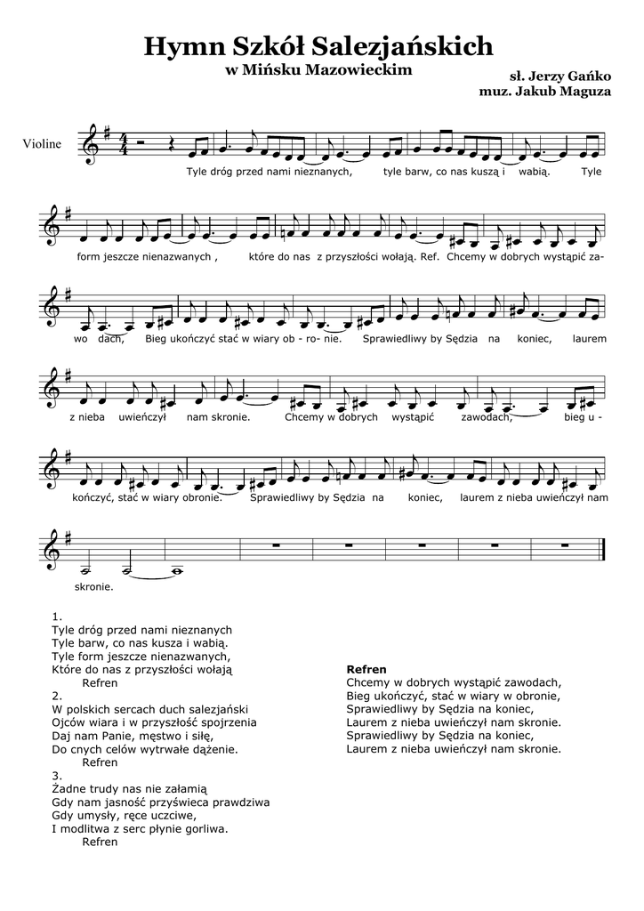 Hymn Szkół Salezjańskich w Mińsku Mazowieckim # 4 Ó & 4 Violine Œ sł. Jerzy Gańko muz. Jakub Maguza j . œ œ œ œ œ œ œj œ . œ œ œ œ œ œ œ œ œ œ œj œ . œ œ œ œœ Tyle dróg przed nami nieznanych, tyle barw, co nas kuszą i wabią. Tyle # j j j & œ œj œ œj œ œ œj œ . œ œ œ n œj œ œj œj œ œj œj œ . œ j #œ œ œ #œ œ œ œ œ form jeszcze nienazwanych , które do nas z przyszłości wołają. Ref. Chcemy w dobrych wystąpić za- # j j j j j j j j j & j j nœ œ œ #œ œ. œ œ œ œ œ. œ œ #œ œ œ œ #œ œ œ œ œ. œ #œ œ œ œ œ wo dach, Bieg ukończyć stać w wiary ob - ro- nie. Sprawiedliwy by Sędzia na # & œj œ œj œj # œ œj œj œ . œ # œ j # œ œj j œ j j œ œ œ œ œ œ. z nieba uwieńczył nam skronie. Chcemy w dobrych wystąpić zawodach, koniec, laurem œ œ #œ bieg u - # j j j j j j # œj j jj & œ œ œ jœ j j n œ œ œ œ œ œ . œ œ œ œ œ œ œ œ œ # œ œj #œ œ œ œ. œ #œ kończyć, stać w wiary obronie. & # ˙ skronie. ˙ Sprawiedliwy by Sędzia na w 1. Tyle dróg przed nami nieznanych Tyle barw, co nas kusza i wabią. Tyle form jeszcze nienazwanych, Które do nas z przyszłości wołają Refren 2. W polskich sercach duch salezjański Ojców wiara i w przyszłość spojrzenia Daj nam Panie, męstwo i siłę, Do cnych celów wytrwałe dążenie. Refren 3. Żadne trudy nas nie załamią Gdy nam jasność przyświeca prawdziwa Gdy umysły, ręce uczciwe, I modlitwa z serc płynie gorliwa. Refren ∑ ∑ koniec, ∑ laurem z nieba uwieńczył nam ∑ Refren Chcemy w dobrych wystąpić zawodach, Bieg ukończyć, stać w wiary w obronie, Sprawiedliwy by Sędzia na koniec, Laurem z nieba uwieńczył nam skronie. Sprawiedliwy by Sędzia na koniec, Laurem z nieba uwieńczył nam skronie. ∑
