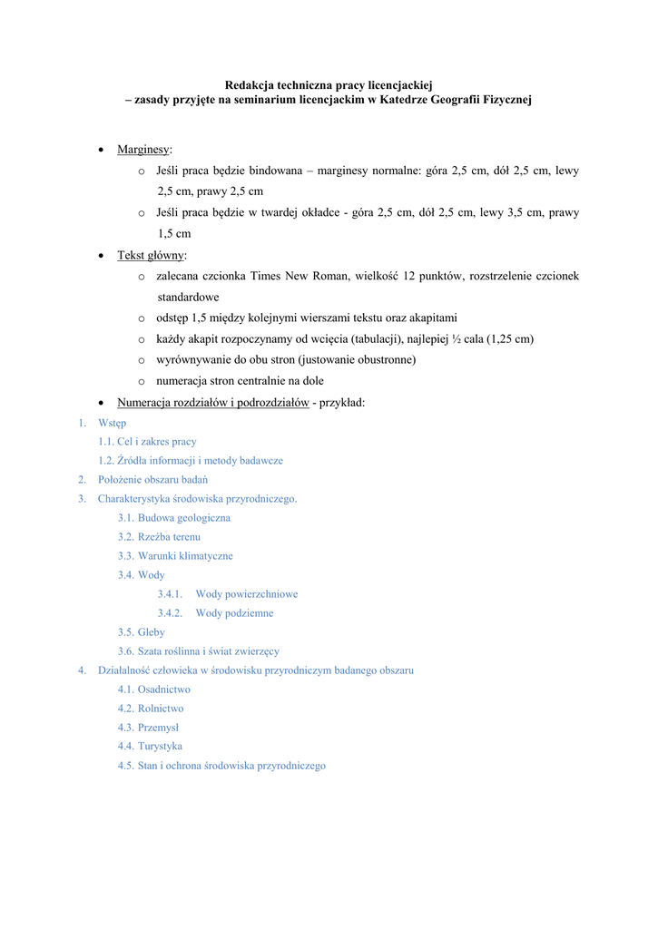 Redakcja techniczna pracy licencjackiej – zasady przyjęte na seminarium licencjackim w Katedrze Geografii Fizycznej Marginesy: o Jeśli praca będzie bindowana – marginesy normalne: góra 2,5 cm, dół 2,5 cm, lewy 2,5 cm, prawy 2,5 cm o Jeśli praca będzie w twardej okładce - góra 2,5 cm, dół 2,5 cm, lewy 3,5 cm, prawy 1,5 cm Tekst główny: o zalecana czcionka Times New Roman, wielkość 12 punktów, rozstrzelenie czcionek standardowe o odstęp 1,5 między kolejnymi wierszami tekstu oraz akapitami o każdy akapit rozpoczynamy od wcięcia (tabulacji), najlepiej ½ cala (1,25 cm) o wyrównywanie do obu stron (justowanie obustronne) o numeracja stron centralnie na dole 1. Numeracja rozdziałów i podrozdziałów - przykład: Wstęp 1.1. Cel i zakres pracy 1.2. Źródła informacji i metody badawcze 2. Położenie obszaru badań 3. Charakterystyka środowiska przyrodniczego. 3.1. Budowa geologiczna 3.2. Rzeźba terenu 3.3. Warunki klimatyczne 3.4. Wody 3.4.1. Wody powierzchniowe 3.4.2. Wody podziemne 3.5. Gleby 3.6. Szata roślinna i świat zwierzęcy 4. Działalność człowieka w środowisku przyrodniczym badanego obszaru 4.1. Osadnictwo 4.2. Rolnictwo 4.3. Przemysł 4.4. Turystyka 4.5. Stan i ochrona środowiska przyrodniczego Przykład formatowania strony tytułowej: WYDZIAŁ NAUK GEOGRAFICZNYCH KIERUNEK GEOGRAFIA Imię Nazwisko Nr albumu 300000 GENEZA FORM RZEŹBY GLACJALNEJ NA POGRANICZU WYSOCZYZNY BEŁCHATOWSKIEJ I WZNIESIEŃ ŁÓDZKICH Origin of the glacial landsystem on the border of the Bełchatów Upland and the Łódź Heights Praca magisterska napisana w Katedrze Geografii Fizycznej na seminarium dr hab. Xawerego Iksińskiego pod kierunkiem dr. Jana Kowalskiego Łódź 2014 Zwroty obcojęzyczne (łacińskie, angielskie, francuskie i in.) piszemy kursywą (czcionką pochyłą), np. ad rem, par excellence, sensu stricto, ibidem. Nie zaleca się stosowania żadnych wyróżników, np. podkreśleń - jak w niniejszym zdaniu, wyróżnień tłustym drukiem etc. Nie dotyczy to tytułów rozdziałów i podrozdziałów, których czcionkę „pogrubiamy” lub/i powiększamy o 1 punkt. Każdy kolejny tytuł umieszczamy na początku strony centralnie lub z justowaniem lewostronnym. Kursywą także piszemy tytuły (książek, artykułów, np. Geologia regionalna kontynentów). Przykłady tytułów w pracy ograniczamy, ponieważ dajemy obowiązkowo spis literatury, do którego zawsze możemy odesłać czytelnika. Przed kropką, przecinkiem, średnikiem, dwukropkiem nie stawiamy spacji. Po kropce, przecinku, średniku, dwukropku stawiamy spację. Na końcu wiersza nie zostawiamy jednoliterowych spójników i innych niesamodzielnych części zdania – również dwu-trzyliterowych (i, a, o, w, u, z, do, na, dla, ku). Podobnie postępujemy w przypadku inicjałów, numerów, miar (K., 1, ¾, 20., XX) itd. Przypisy w tekście: o odsyłacze do literatury wskazujące źródło, np. (Niewiarowski 2002); odsyłacze uzupełniające: (por. Niewiarowski 2002) (zob. Niewiarowski 2002) (vide Niewiarowski 2002) ; odsyłacze w tekście ciągłym: M. Niewiarowski (2002) lub bez inicjału imienia, np. Niewiarowski (2002). Uwaga! Pomiędzy kropką po inicjale imienia a nazwiskiem występuje spacja. Tak samo między inicjałami, np. R. F. Davis. o przypisy u dołu strony oznaczamy numerami porządkowymi (kolejnymi). Cytowanie: o Typowe, uproszczone: stosujemy przypis w nawiasie odsyłający do literatury, np. (Allen 1990), bez zaznaczania zakresu stron; jeśli odwołujemy się do kilku pozycji literatury: (Allen 2000, Kondracki 2000, Starkel 2005); jeśli cytujemy pozycje dwóch autorów: (Folk i Ward 1957) lub (Folk & Ward 1957), ewentualnie (Folk, Ward 1957); jeśli cytujemy pozycje wieloautorskie (autorów więcej niż dwóch): (Gudmundsson at al. 2004) lub (Gudmundsson i in. 2004), natomiast w spisie literatury wymieniamy wówczas wszystkich autorów tego dzieła. Można także cytować autorów, odmieniając ich nazwiska, z podaniem daty (roku) wydania pracy w nawiasie, np. „.. według Allena (1990) zachodzi następująca prawidłowość…” Przy cytowaniu z tzw. drugiej ręki, jeśli nie możemy dotrzeć do oryginału publikacji stosujemy zapis: (Davis 1908 vide Klimaszewski 1978). W przypadku cytowania danych ze stron internetowych podajemy skrótowy zapis adresu strony, np. (www.pgi.gov.pl). Możemy przy tym dopisać hiperłącze, które można będzie uaktywniać w wersji elektronicznej, dołączonej do pracy na płycie CD/DVD. o dokładne: stosujemy cudzysłów, np. „W najmłodszym piętrze okresu kredowego...”. Po cytacie następuje odesłanie do źródła (przypis w nawiasie), np. (Allen 1994, s. 40). Odsyłacz w tekście do ilustracji, np. (fot. 2), (rys. 3), (tab. 4). Jeśli wszystkie ilustracje (rysunki, w tym mapy, fotografie i in.) numerujemy kolejno, można je nazwać figurami (fig. 1) lub rycinami (ryc. 1). Nie powodu do użycia w nawiasie wielkiej litery. Spisy źródeł umieszczamy w końcowej części pracy. Obowiązują: o dokładny spis cytowanej literatury, z precyzyjnym podaniem zakresu stron danych dzieł. Jeśli cytujemy dane ze stron internetowych, podajemy w specjalnym wykazie adresy internetowe na tyle dokładnie, aby czytelnik mógł szybko odszukać te dane w przeglądarce. Podajemy także nazwę instytucji lub nazwisko osoby - właściciela praw autorskich strony. o spis rysunków (w tym map, wykonanych przez autora/autorkę) o spis fotografii (informacje o autorstwie fotografii w jej podpisie, w przypadku zamieszczenia wyłącznie fotografii autora, można taka informację zamieścić w opisie metod, aby nie powtarzać kilkadziesiąt razy „fot. autora”) Zaleca się dołączenie innych spisów: stron internetowych, dokumentacji różnego rodzaju, map topograficznych oraz innych istotnych dla pracy licencjackiej materiałów, które można ująć w przejrzystym spisie. Literatura – do spisu trafiają tylko pozycje cytowane. Jednocześnie nie może zabrak
