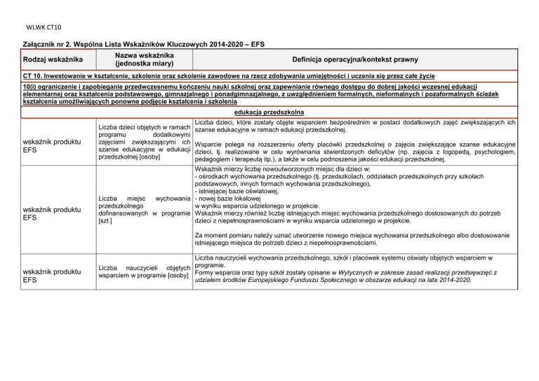 WLWK CT10 Załącznik nr 2. Wspólna Lista Wskaźników Kluczowych 2014-2020 – EFS Rodzaj wskaźnika Nazwa wskaźnika (jednostka miary) Definicja operacyjna/kontekst prawny CT 10. Inwestowanie w kształcenie, szkolenie oraz szkolenie zawodowe na rzecz zdobywania umiejętności i uczenia się przez całe życie 10(i) ograniczenie i zapobieganie przedwczesnemu kończeniu nauki szkolnej oraz zapewnianie równego dostępu do dobrej jakości wczesnej edukacji elementarnej oraz kształcenia podstawowego, gimnazjalnego i ponadgimnazjalnego, z uwzględnieniem formalnych, nieformalnych i pozaformalnych ścieżek kształcenia umożliwiających ponowne podjęcie kształcenia i szkolenia edukacja przedszkolna wskaźnik produktu EFS wskaźnik produktu EFS Liczba dzieci objętych w ramach programu dodatkowymi zajęciami zwiększającymi ich szanse edukacyjne w edukacji przedszkolnej [osoby] Liczba dzieci, które zostały objęte wsparciem bezpośrednim w postaci dodatkowych zajęć zwiększających ich szanse edukacyjne w ramach edukacji przedszkolnej. Wsparcie polega na rozszerzeniu oferty placówki przedszkolnej o zajęcia zwiększające szanse edukacyjne dzieci, tj. realizowane w celu wyrównania stwierdzonych deficytów (np. zajęcia z logopedą, psychologiem, pedagogiem i terapeutą itp.), a także w celu podnoszenia jakości edukacji przedszkolnej. Wskaźnik mierzy liczbę nowoutworzonych miejsc dla dzieci w: - ośrodkach wychowania przedszkolnego (tj. przedszkolach, oddziałach przedszkolnych przy szkołach podstawowych, innych formach wychowania przedszkolnego), - istniejącej bazie oświatowej, Liczba miejsc wychowania - nowej bazie lokalowej przedszkolnego w wyniku wsparcia udzielonego w projekcie. dofinansowanych w programie Wskaźnik mierzy również liczbę istniejących miejsc wychowania przedszkolnego dostosowanych do potrzeb [szt.] dzieci z niepełnosprawnościami w wyniku wsparcia udzielonego w projekcie. Za moment pomiaru należy uznać utworzenie nowego miejsca wychowania przedszkolnego albo dostosowanie istniejącego miejsca do potrzeb dzieci z niepełnosprawnościami. wskaźnik produktu EFS Liczba nauczycieli wychowania przedszkolnego, szkół i placówek systemu oświaty objętych wsparciem w Liczba nauczycieli objętych programie. wsparciem w programie [osoby] Formy wsparcia oraz typy szkół zostały opisane w Wytycznych w zakresie zasad realizacji przedsięwzięć z udziałem środków Europejskiego Funduszu Społecznego w obszarze edukacji na lata 2014-2020. Definicja kwalifikacji jest zgodna z definicją zawartą w części dot. wskaźników EFS monitorowanych we wszystkich priorytetach inwestycyjnych dla wskaźnika liczba osób, które uzyskały kwalifikacje po opuszczeniu programu. wskaźnik rezultatu bezpośredniego EFS Fakt nabycia kompetencji będzie weryfikowany w ramach następujących etapów: a) ETAP I – Zakres – zdefiniowanie w ramach wniosku o dofinansowanie lub w regulaminie konkursu grupy docelowej do objęcia wsparciem oraz wybranie obszaru interwencji EFS, który będzie poddany ocenie, b) ETAP II – Wzorzec – zdefiniowanie we wniosku o dofinansowanie lub w regulaminie konkursu standardu Liczba nauczycieli, którzy wymagań, tj. efektów uczenia się, które osiągną uczestnicy w wyniku przeprowadzonych działań projektowych, uzyskali kwalifikacje lub nabyli c) ETAP III – Ocena – przeprowadzenie weryfikacji na podstawie opracowanych kryteriów oceny po zakończeniu kompetencje po opuszczeniu wsparcia udzielanego danej osobie, d) ETAP IV – Porównanie – porównanie uzyskanych wyników etapu III (ocena) z przyjętymi wymaganiami programu [osoby] (określonymi na etapie II efektami uczenia się) po zakończeniu wsparcia udzielanego danej osobie. Kompetencja to wyodrębniony zestaw efektów uczenia się / kształcenia. Opis kompetencji zawiera jasno określone warunki, które powinien spełniać uczestnik projektu ubiegający się o nabycie kompetencji, tj. wyczerpującą informację o efektach uczenia się dla danej kompetencji oraz kryteria i metody ich weryfikacji. Wykazywać należy wyłącznie kwalifikacje/kompetencje osiągnięte w wyniku interwencji Europejskiego Funduszu Społecznego. wskaźnik rezultatu długoterminowego EFS Liczba miejsc wychowania przedszkolnego, które funkcjonują 2 lata po uzyskaniu dofinansowaniu ze środków EFS [szt.] Liczba miejsc wychowania przedszkolnego utworzonych w ramach projektu dofinansowanego z Europejskiego Funduszu Społecznego, które funkcjonują co najmniej pełne 2 lata po zakończeniu finansowania działań. Podana liczba miejsc odpowiada liczbie zadeklarowanych miejsc w arkuszu organizacyjnym placówki. Trwałość funkcjonowania nowych miejsc przedszkolnych utworzonych dzięki EFS w przedszkolach należy rozumieć jako instytucjonalną gotowość placówki do świadczenia usług przedszkolnych w ramach utworzonych w projekcie miejsc wychowania przedszkolnego. Trwałość należy zweryfikować po 2 latach od daty zakończenia realizacji projektu. kształcenie kompetencji kluczowych niezbędnych na rynku pracy oraz właściwych postaw/umiejętności wskaźnik produktu EFS wskaźnik produktu EFS Liczba uczniów objętych wsparciem bezpośrednim w ramach programu z zakresu rozwijania kompetencji Liczba uczniów objętych kluczowych oraz postaw i umiejętności niezbędnych na rynku pracy. Wykazywać należy wyłącznie kompetencje wsparciem w zakresie osiągnięte w wyniku interwencji Europejskiego Funduszu Społecznego. rozwijania kompetencji kluczowych w programie Zakres kompetencji kluczowych oraz typy szkół opisano w Wytycznych w zakresie zasad realizacji przedsięwzięć z udziałem środków Europejskiego Funduszu Społecznego w obszarze edukacji na lata 2014-2020. [osoby] Liczba nauczycieli objętych wsparciem w programie [osoby] Liczba nauczycieli wychowania przedszkolnego, szkół i placówek systemu oświaty objętych wsparciem, w programie. Formy wsparcia oraz typy szkół opisane w W