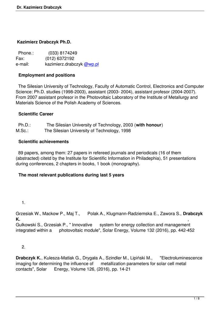 Dr. Kazimierz Drabczyk Kazimierz Drabczyk Ph.D. Phone.: (033) 8174249 Fax: (012) 6372192 e-mail: kazimierz.drabczyk @wp.pl Employment and positions The Silesian University of Technology, Faculty of Automatic Control, Electronics and Computer Science: Ph.D. studies (1998-2003), assistant (2003- 2004), assistant profesor (2004-2007). From 2007 assistant profesor in the Photovoltaic Laboratory of the Institute of Metallurgy and Materials Science of the Polish Academy of Sciences. Scientific Career Ph.D.: The Silesian University of Technology, 2003 (with honour) M.Sc.: The Silesian University of Technology, 1998 Scientific achievements 89 papers, among them: 27 papers in refereed journals and periodicals (16 of them (abstracted) citetd by the Institute for Scientific Information in Philadephia), 51 presentations during conferences, 2 chapters in books, 1 book (monography). The most relevant publications during last 5 years 1. Grzesiak W., Mackow P., Maj T., Polak A., Klugmann-Radziemska E., Zawora S., Drabczyk K. , Gulkowski S., Grzesiak P., " Innovative system for energy collection and management integrated within a photovoltaic module", Solar Energy, Volume 132 (2016), pp. 442-452 2. Drabczyk K., Kulesza-Matlak G., Drygała A., Szindler M., Lipiński M., "Electroluminescence imaging for determining the influence of metallization parameters for solar cell metal contacts", Solar Energy, Volume 126, (2016), pp. 14-21 1/8 Dr. Kazimierz Drabczyk 3. Domaradzki J., Kaczmarek D., Drabczyk K., Panek P., "Investigations of electrical and optical properties of functional TCO thin films", Materials Science-Poland, Volume: 33, Issue: 2 (2015), pp. 363-368 4. Drabczyk K., Socha R. P., Skwarek A., "Copper deposition on screen printed electrical paths for solar cell application", Circuit World, Volume: 41, Issue: 3, (2015), pp. 98 - 101 5. Drabczyk K., Domaradzki J., Panek P., Kaczmarek D., "Investigation of electrical performance of silicon solar cells with transparent counter electrode", Microelectronics International, Volume: 32, Issue: 3, (2015), pp. 149-151 6. Drabczyk K., Socha R., Panek P., et al., "Electrodeposition of thin metallic layer for solar cell electrodes", Soldering & Surface Mount Technology, Volume: 26, Issue: 1, (2014) pp. 18-21 7. Drabczyk K., Panek P., "Influence of screen printing parameters on the front metallic electrodes geometry of solar cells", Circuit World, Volume: 40, Issue: 1, (2014), pp. 23-26 8. Drabczyk K., "Kontakty elektryczne krystalicznych krzemowych ogniw", Prace Instytutu Elektrotechniki, zeszyt 264, ISSN-0032-6216, (2014), pp. 41-49 9. Drabczyk K., Panek P., „Silicon-based Solar Cells Characteristics and Production Processes", Wydawnictwo IMIM, (2012), str. 1-67, ISBN 978-83-60768-05-1 10. 2/8 Dr. Kazimierz Drabczyk Drabczyk K., Panek P., "A comparative study of EVA with and without thermal history for different lamination process parameters" Materials Science and Engineering B, 2012, 177, pp. 1378-1383 11. Panek P., Drabczyk K., Kulesza G., Zięba P., „The Silicon Solar Cells with Laser Fired Back Contacts Obtained by Use of Nd:YAG and Ytterbium Fiber Lasers", Proc. of the 26th European Photovoltaic Solar Energy Conference, Hamburg, Germany, 5-9 September 2011, (2011), pp. 1750-1752 12. Swatowska B., Stapinski T., Drabczyk K., et al., "The role of antireflective coatings in silicon solar cells - the influence on their electrical parameters", Optica Applicata Volume: 41 Issue: 2, (2011) pp. 487-492 Research Projects Projects from Ministry of Science and Higher Education 1. Innovative flexible photovoltaic cover, The National Centre for Research and Development and The National Fund for Environmental Protection and Water Management, „GEKON Generator Koncepcji Ekologicznych", supervisor in IMMS of PAS , 2016-2018 2. Isothermal and refrigeration photovoltaic car body,, Project No. GEKON2/04/266475/6/2015, The National Centre for Research and Development and The National Fund for Environmental Protection and Water Management, „GEKON - Generator Koncepcji Ekologicznych", main contractor, 2015-2017 3/8 Dr. Kazimierz Drabczyk 3. Investigation of influence of metal and semiconductor nanoparticles on optoelectronical properties of composit materials, Project NCN, DEC-2012/05/B/ST8/00087, contractor, 2013-2016 4. In-line processing of n+/p and p/p+ junction systems for cheap photovoltaic module production, POLNOR/199380/89/2014, main contractor, 2014 -2016 5. Development and testing charging station based on solar cells for electric vehicles, Development Project No. NR10-0020-10/2011, main contractor, 2011-2013 6. The Laser-fired Back Contacts for IMIM PAN, 2008 - 2010 Crystalline Silicon Solar Cells, (Project No. N507 443734), contractor, 7. Specjalne systemy fotowoltaiczne do zastosowania w Siłach Zbrojnych RP, projekt rozwojowy Nr OR00002108 w konsorcjum z Wojskowymi Zakładami Techniki Inżynieryjnej we Wrocławiu i Wojskowymi Zakładami Łączności nr 2 w Czernicy, IMIM PAN, main contractor , 2009 - 2011 8. Designing and production of functional graded materials (Project No. PBZ-KBN 100/TO8-2003): Subject 1: Designing and technology elaboration of functionally graded materials for the application in fotonics and fuel cells, Task 2: Elaboration of technology of antireflection gradient coatings in silicon solar cells, IMMS PAS, contractor , 2004-2007 4/8 Dr. Kazimierz Drabczyk Common research within the scientific network PV-TECH- Development of new technologies and research techniques for silicon solar cells, IMMS PAS, contractor , 2008 International projects 1. Operational Programme Human Capital, co-financed by European Social Fund, Dissemi nation of Polish and world achievements in photovoltaics in the education process at high level II Edition - supranational component, (No. UDA-POKL. 04.02.00-00-006/09-00), IMMS PAS, contractor , 2011-2012 2. Operational Programme Human Capital, co-financed by European Social Fund, Dissemi nation of Polish and world achi