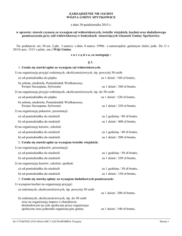 ZARZĄDZENIE NR 116/2015 WÓJTA GMINY SPYTKOWICE z dnia 30 października 2015 r. w sprawie: stawek czynszu za wynajem sal widowiskowych, świetlic wiejskich, kuchni oraz dodatkowego pomieszczenia przy sali widowiskowej w budynkach stanowiących własność Gminy Spytkowice. Na podstawie art. 30 ust. 2 pkt. 3 ustawy z dnia 8 marca 1990r. o samorządzie gminnym (tekst jedn. Dz. U z 2015r poz. 1515 z późn. zm.) Wójt Gminy z a r z ą d z a, co następuje : § 1. 1. Ustala się stawki opłat za wynajem sal widowiskowych: 1) na organizację przyjęć rodzinnych, okolicznościowych, itp. powyżej 50 osób: a) od poniedziałku do piątku za 1 dzień / 160 zł brutto, b) sobota, niedziela, Poniedziałek Wielkanocny, Święto Szczepana, Sylwester za 1 dzień / 360 zł brutto, 2) na organizację przyjęć rodzinnych, okolicznościowych, itp. do 50 osób: a) od poniedziałku do piątku za 1 dzień / 120 zł brutto, b) sobota, niedziela, Poniedziałek Wielkanocny, Święto Szczepana, Sylwester za 1 dzień / 230 zł brutto, 3) na organizację pokazów, prezentacji: a) od poniedziałku do niedzieli za 1 godzinę / 80 zł brutto, b) od poniedziałku do niedzieli za 1 dzień / 400 zł brutto, 4) na organizację kursów, szkoleń: a) od poniedziałku do niedzieli za 1 godzinę / 40 zł brutto, b) od poniedziałku do niedzieli za 1 dzień / 200 zł brutto, 2. Ustala się stawki opłat za wynajem świetlic wiejskich: 1) na organizację pokazów, prezentacji: a) od poniedziałku do niedzieli za 1 godzinę / 50 zł brutto, b) od poniedziałku do niedzieli za 1 dzień / 250 zł brutto, 2) na organizację kursów, szkoleń, spotkań: a) od poniedziałku do niedzieli za 1 godzinę / 30 zł brutto, b) od poniedziałku do niedzieli za 1 dzień / 150 zł brutto, 3. Ustala się stawkę opłaty za wynajem dodatkowych pomieszczeń: 1) wynajem kuchni na organizację przyjęć: a) rodzinnych, okolicznościowych, itp. powyżej 50 osób za 1 dzień / 200 zł brutto, b) rodzinnych, okolicznościowych, itp. do 50 osób oraz na organizację imprez o charakterze dochodowym na cele społeczne przez organizacje społeczne oraz jednostki organizacyjne gminy Id: C79AFFD2-2353-49AA-98C7-A2CDA9F00B54. Przyjety za 1 dzień / 140 zł brutto, Strona 1 2) wynajem dodatkowych pomieszczeń przy sali widowiskowej w Spytkowicach: a) od poniedziałku do niedzieli za 1 godzinę / 10 zł brutto, b) od poniedziałku do niedzieli za 1 dzień / 50 zł brutto, § 2. Na organizację imprez o charakterze dochodowym na cele społeczne lub o charakterze niedochodowym przez organizacje społeczne oraz jednostki organizacyjne gminy wynajem sal widowiskowych oraz dodatkowych pomieszczeń jest bezpłatny. Najemca płaci stawkę ryczałtową na pokrycie kosztów zużycia mediów w wysokości 150,00 zł brutto. § 3. W uzasadnionych wypadkach Wójt Gminy Spytkowice podejmuje decyzje o zwolnieniu z opłat za wynajem. § 4. Wykonanie zarządzenia powierzam Dyrektorowi Gminnego Ośrodka Kultury w Spytkowicach. § 5. Traci moc Zarządzenie Nr 14A/ 2014 Wójta Gminy Spytkowice z dnia 30 grudnia 2014 roku w sprawie: stawek czynszu za wynajem sal widowiskowych, świetlic wiejskich, kuchni oraz dodatkowego pomieszczenia przy sali widowiskowej w budynkach stanowiących własność Gminy Spytkowice. § 6. Zarządzenie wchodzi w życie z dniem wydania z mocą obowiązującą od dnia 1 stycznia 2016 roku i zostanie podane do wiadomości publicznej poprzez wywieszenie na tablicy ogłoszeń Urzędu Gminy Spytkowice, ul. Zamkowa 12. WÓJT mgr Mariusz Krystian Id: C79AFFD2-2353-49AA-98C7-A2CDA9F00B54. Przyjety Strona 2