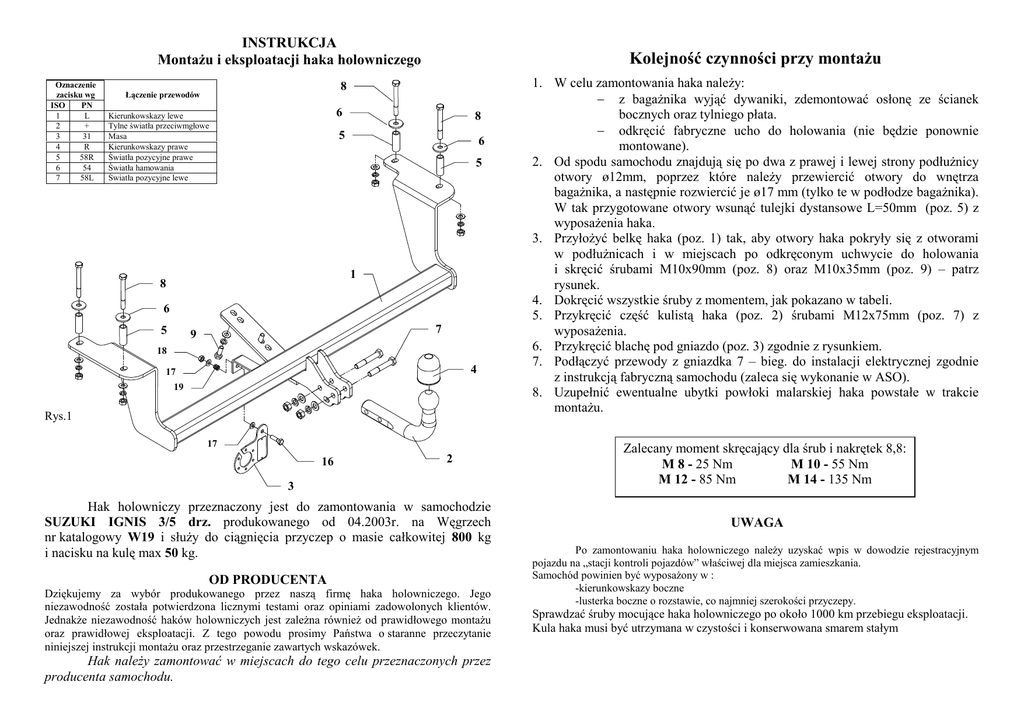 INSTRUKCJA MontaŜu i eksploatacji haka holowniczego Oznaczenie zacisku wg ISO PN 1 L 2 + 3 31 4 R 5 58R 6 54 7 58L Kolejność czynności przy montaŜu 8 Łączenie przewodów 6 Kierunkowskazy lewe Tylne światła przeciwmgłowe Masa Kierunkowskazy prawe Światła pozycyjne prawe Światła hamowania Światła pozycyjne lewe 8 5 6 5 1 8 6 5 7 9 18 4 17 19 Rys.1 17 16 2 3 Hak holowniczy przeznaczony jest do zamontowania w samochodzie SUZUKI IGNIS 3/5 drz. produkowanego od 04.2003r. na Węgrzech nr katalogowy W19 i słuŜy do ciągnięcia przyczep o masie całkowitej 800 kg i nacisku na kulę max 50 kg. OD PRODUCENTA Dziękujemy za wybór produkowanego przez naszą firmę haka holowniczego. Jego niezawodność została potwierdzona licznymi testami oraz opiniami zadowolonych klientów. JednakŜe niezawodność haków holowniczych jest zaleŜna równieŜ od prawidłowego montaŜu oraz prawidłowej eksploatacji. Z tego powodu prosimy Państwa o staranne przeczytanie niniejszej instrukcji montaŜu oraz przestrzeganie zawartych wskazówek. Hak naleŜy zamontować w miejscach do tego celu przeznaczonych przez producenta samochodu. 1. W celu zamontowania haka naleŜy: − z bagaŜnika wyjąć dywaniki, zdemontować osłonę ze ścianek bocznych oraz tylniego płata. − odkręcić fabryczne ucho do holowania (nie będzie ponownie montowane). 2. Od spodu samochodu znajdują się po dwa z prawej i lewej strony podłuŜnicy otwory ø12mm, poprzez które naleŜy przewiercić otwory do wnętrza bagaŜnika, a następnie rozwiercić je ø17 mm (tylko te w podłodze bagaŜnika). W tak przygotowane otwory wsunąć tulejki dystansowe L=50mm (poz. 5) z wyposaŜenia haka. 3. PrzyłoŜyć belkę haka (poz. 1) tak, aby otwory haka pokryły się z otworami w podłuŜnicach i w miejscach po odkręconym uchwycie do holowania i skręcić śrubami M10x90mm (poz. 8) oraz M10x35mm (poz. 9) – patrz rysunek. 4. Dokręcić wszystkie śruby z momentem, jak pokazano w tabeli. 5. Przykręcić część kulistą haka (poz. 2) śrubami M12x75mm (poz. 7) z wyposaŜenia. 6. Przykręcić blachę pod gniazdo (poz. 3) zgodnie z rysunkiem. 7. Podłączyć przewody z gniazdka 7 – bieg. do instalacji elektrycznej zgodnie z instrukcją fabryczną samochodu (zaleca się wykonanie w ASO). 8. Uzupełnić ewentualne ubytki powłoki malarskiej haka powstałe w trakcie montaŜu. Zalecany moment skręcający dla śrub i nakrętek 8,8: M 8 - 25 Nm M 10 - 55 Nm M 12 - 85 Nm M 14 - 135 Nm UWAGA Po zamontowaniu haka holowniczego naleŜy uzyskać wpis w dowodzie rejestracyjnym pojazdu na „stacji kontroli pojazdów” właściwej dla miejsca zamieszkania. Samochód powinien być wyposaŜony w : -kierunkowskazy boczne -lusterka boczne o rozstawie, co najmniej szerokości przyczepy. Sprawdzać śruby mocujące haka holowniczego po około 1000 km przebiegu eksploatacji. Kula haka musi być utrzymana w czystości i konserwowana smarem stałym WyposaŜenie haka: PPUH AUTO-HAK S.J. Produkcja Haków Holowniczych Henryk & Zbigniew Nejman 76-200 SŁUPSK ul. Słoneczna 16K tel/fax (059) 8-414-414; 8-414-413 E-mail: [email protected] www. autohak.com.pl Hak holowniczy bez wyposaŜenia elektrycznego Klasa: A50-X Nr kat. W19 Przeznaczony do zamontowania w samochodzie: Producent: SUZUKI Model: IGNIS Typ: 3/5 drz. produkowanego od 04.2003r. Dane techniczne: Wartość siły D : 5,1 kN maksymalna masa przyczepy: 800 kg maksymalny nacisk na kulę: 50 kg Numer homologacji zgodnie z wytycznymi regulaminu EKG/ONZ 55.01: E20-55R-01 1251 KARTA GWARANCYJNA Producent udziela gwarancji niniejszą kartą gwarancyjną na okres 24 miesięcy licząc od dnia zakupu haka holowniczego do samochodów: SUZUKI IGNIS 3/5 drz. produkowany od 04.2003r. Data produkcji .............................. Data zakupu................................... Zakres gwarancji obejmuje wyłącznie wady jakościowe wynikające z winy producenta. Gwarancja nie obejmuje natomiast uszkodzeń zawinionych przez nabywcę, wynikających z niewłaściwego montaŜu, uŜytkowania lub konserwacji, uszkodzeń mechanicznych, normalnego zuŜycia podczas eksploatacji itp. Gwarancja udzielona na zakupiony towar nie wyłącza, nie ogranicza ani nie zawiesza uprawnień kupującego wynikających z niezgodności towaru z umową. Reklamacje naleŜy zgłaszać w punkcie sprzedaŜy, składając jednocześnie kartę gwarancyjną. Usunięcie "wady" następuje po stwierdzeniu przez punkt sprzedaŜy wspólnie z producentem słuszności złoŜonej reklamacji. Reklamacja powinna być załatwiona w ciągu czternastu dni od dnia uznania reklamacji. Karta gwarancyjna jest niewaŜna jeŜeli nie jest wypełniona i podpisana. Data zgłoszenia reklamacji: ............................ INFORMACJA WSTĘPNA Hak holowniczy jest skonstruowany zgodnie z zasadami bezpieczeństwa ruchu drogowego. Hak holowniczy jest elementem wpływającym na bezpieczeństwo jazdy i moŜe zostać zainstalowany wyłącznie przez personel wyspecjalizowany. Niedopuszczalne jest dokonywanie jakichkolwiek zmian w konstrukcji haka. Powoduje to wygaśniecie dopuszczenia do stosowania. W przypadku obecności masy izolacyjnej lub osłony podwozia w miejscu przylegania haka, naleŜy ją usunąć. Nieosłonięte miejsca karoserii oraz wywiercone otwory naleŜy pomalować farbą antykorozyjną. Informacjami wiąŜącymi odnośnie wartości obciąŜeń są dane podawane przez producenta samochodu, względnie wartości maksymalnej masy przyczepy oraz maksymalnego nacisku na kulę, przy czym wartości parametrów haka holowniczego nie mogą być przekroczone. Wzór do obliczania wartości siły D: Maks. masa przyczepy [kg] x Maks. masa przyczepy [kg] + Maks. masa samochodu [kg] 9,81 = 1000 D [kN]