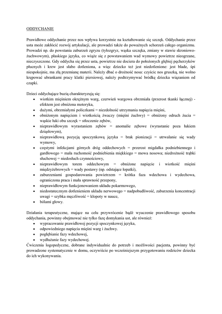 ODDYCHANIE Prawidłowe oddychanie przez nos wpływa korzystnie na kształtowanie się szczęk. Oddychanie przez usta może zakłócić rozwój artykulacji, ale prowadzi także do poważnych schorzeń całego organizmu. Prowadzi np. do powstania zaburzeń zgryzu (tyłozgryz, wąska szczęka, zmiany w stawie skroniowożuchwowym), płaskiego języka, co wiąże się z powstawaniem wad wymowy powietrze nieogrzane, nieczyszczone. Gdy oddycha się przez usta, powietrze nie dociera do położonych głębiej pęcherzyków płucnych i krew jest słabo dotleniona, a więc dziecko też jest niedotlenione: jest blade, śpi niespokojnie, ma złą przemianę materii. Należy dbać o drożność nosa: czyścic nos gruszką, nie wolno krępować ubrankami pracy klatki piersiowej, należy podtrzymywać bródkę dziecka wiązaniem od czapki. Dzieci oddychające buzią charakteryzują się: wiotkim mięśniem okrężnym warg, czerwień wargowa obrzmiała (przerost tkanki łącznej) efektem jest obniżona motoryka, dużymi, obrzmiałymi policzkami = niezdolność utrzymania napięcia mięśni, obniżonym napięciem i wiotkością żwaczy (mięśni żuchwy) = obniżony odruch żucia = wąskie łuki obu szczęk = stłoczenie zębów, nieprawidłowym wyrastaniem zębów = anomalie zębowe (wyrastanie poza łukiem dziąsłowym), nieprawidłową pozycją spoczynkową języka = brak pionizacji = utrwalanie się wady wymowy, częstymi infekcjami górnych dróg oddechowych = przerost migdałka podniebiennego i gardłowego = mała ruchomość podniebienia miękkiego = mowa nosowa; niedrożność trąbki słuchowej = niedosłuch czynnościowy, nieprawidłowym torem oddechowym = obniżone napięcie i wiotkość mięśni międzyżebrowych = wady postawy (np. odstające łopatki), zaburzeniami gospodarowania powietrzem = krótka faza wdechowa i wydechowa, ograniczona praca i mała sprawność przepony, nieprawidłowym funkcjonowaniem układu pokarmowego, niedostatecznym dotlenieniem układu nerwowego = nadpobudliwość, zaburzenia koncentracji uwagi = szybka męczliwość = kłopoty w nauce, bólami głowy. Działania terapeutyczne, mające na celu przywrócenie bądź wyuczenie prawidłowego sposobu oddychania, powinny obejmować nie tylko fazę domykania ust, ale również: wypracowanie prawidłowej pozycji spoczynkowej języka, odpowiedniego napięcia mięśni warg i żuchwy. pogłębianie fazy wdechowej, wydłużanie fazy wydechowej. Ćwiczenia logopedyczne, dobrane indywidualnie do potrzeb i możliwości pacjenta, powinny być prowadzone systematycznie w domu, oczywiście po wcześniejszym przygotowaniu rodziców dziecka do ich wykonywania.